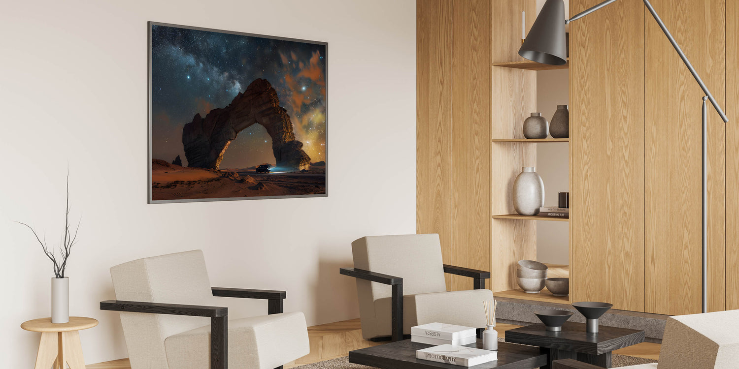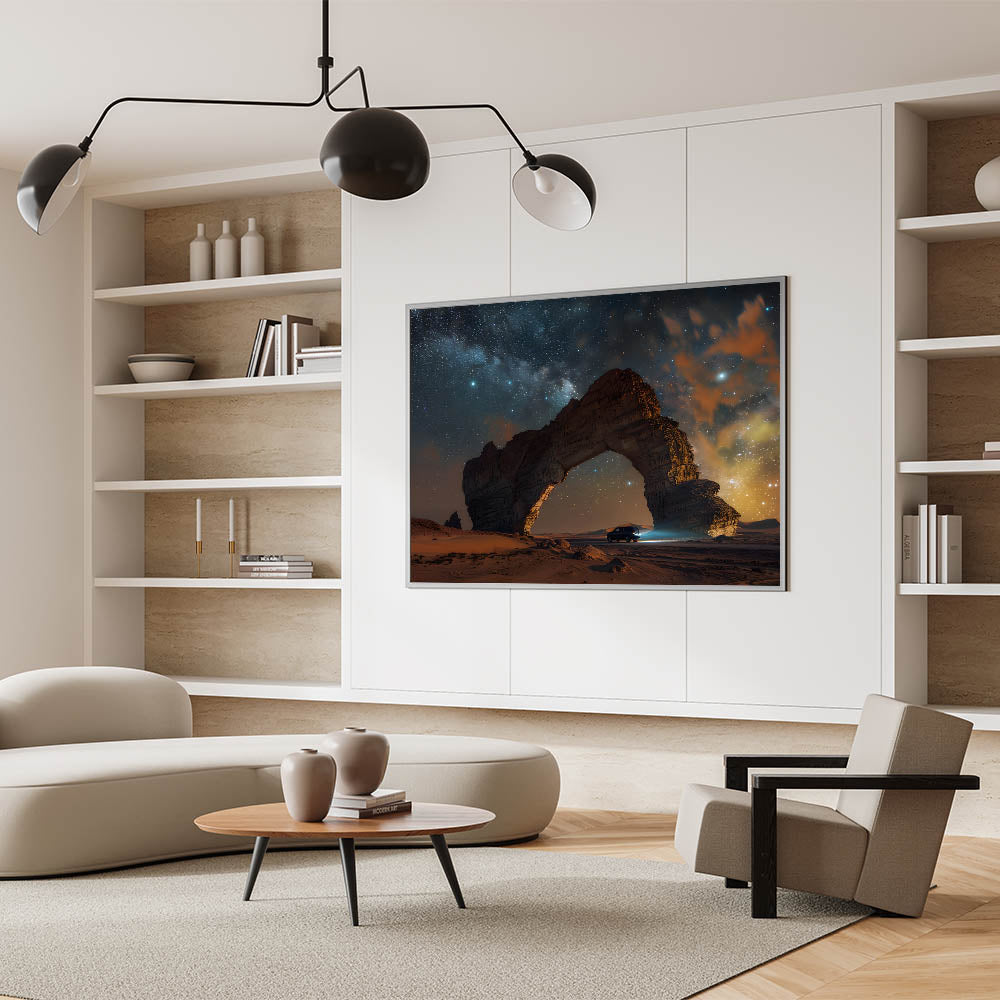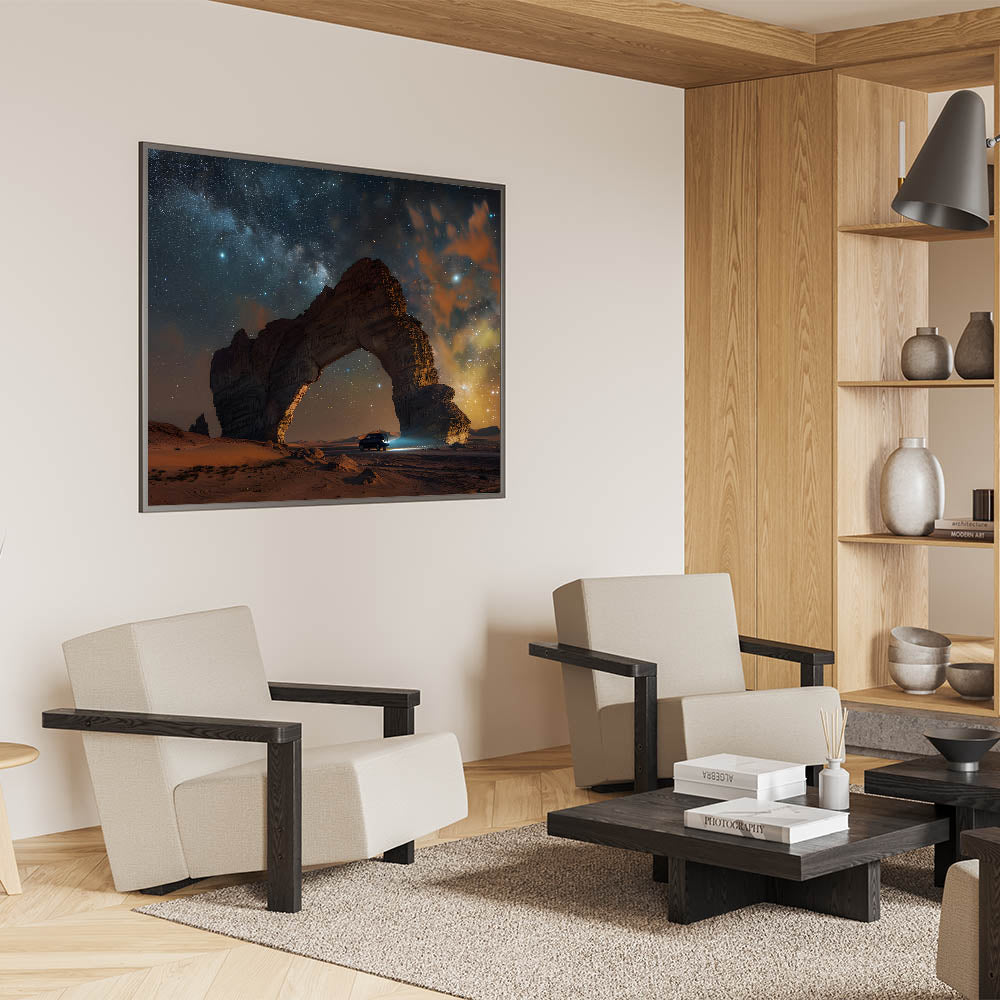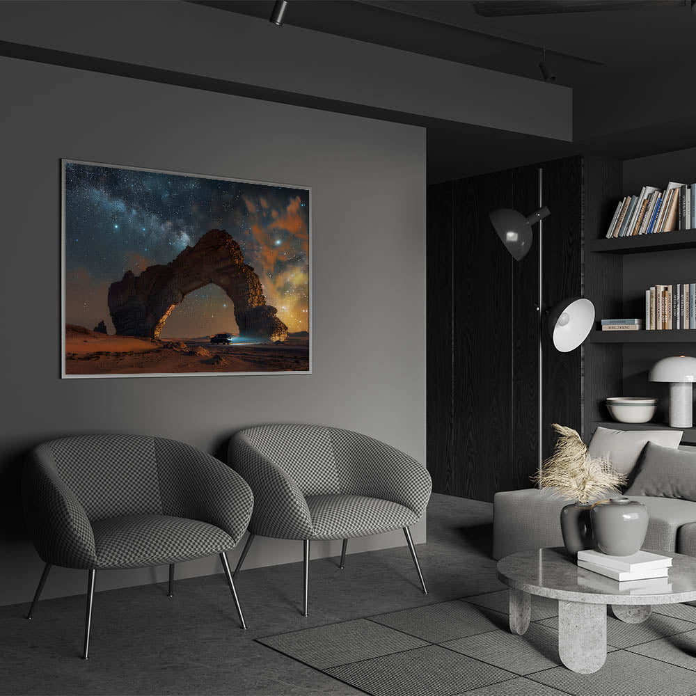 This captivating wall art beautifully captures a majestic rock formation in the Saudi Arabian desert under the glow of a starry night sky. The dramatic arch in the desert, illuminated by the lights of a car, creates a scene of both mystery and wonder. The shimmering stars above, along with the subtle colors of the sky, bring this desert landscape to life. The contrast between the rugged rock and the vast celestial sky makes this piece an extraordinary addition to any home or office space.
