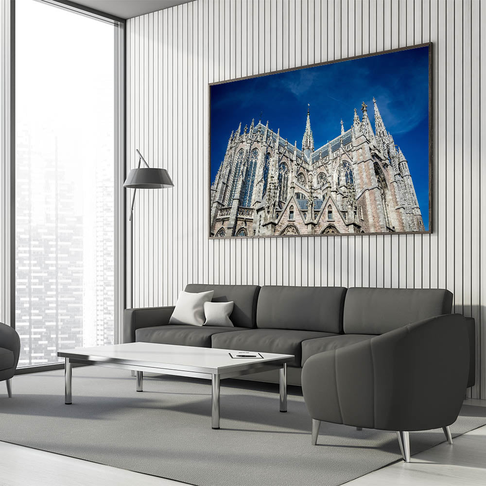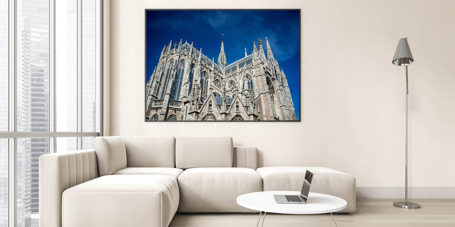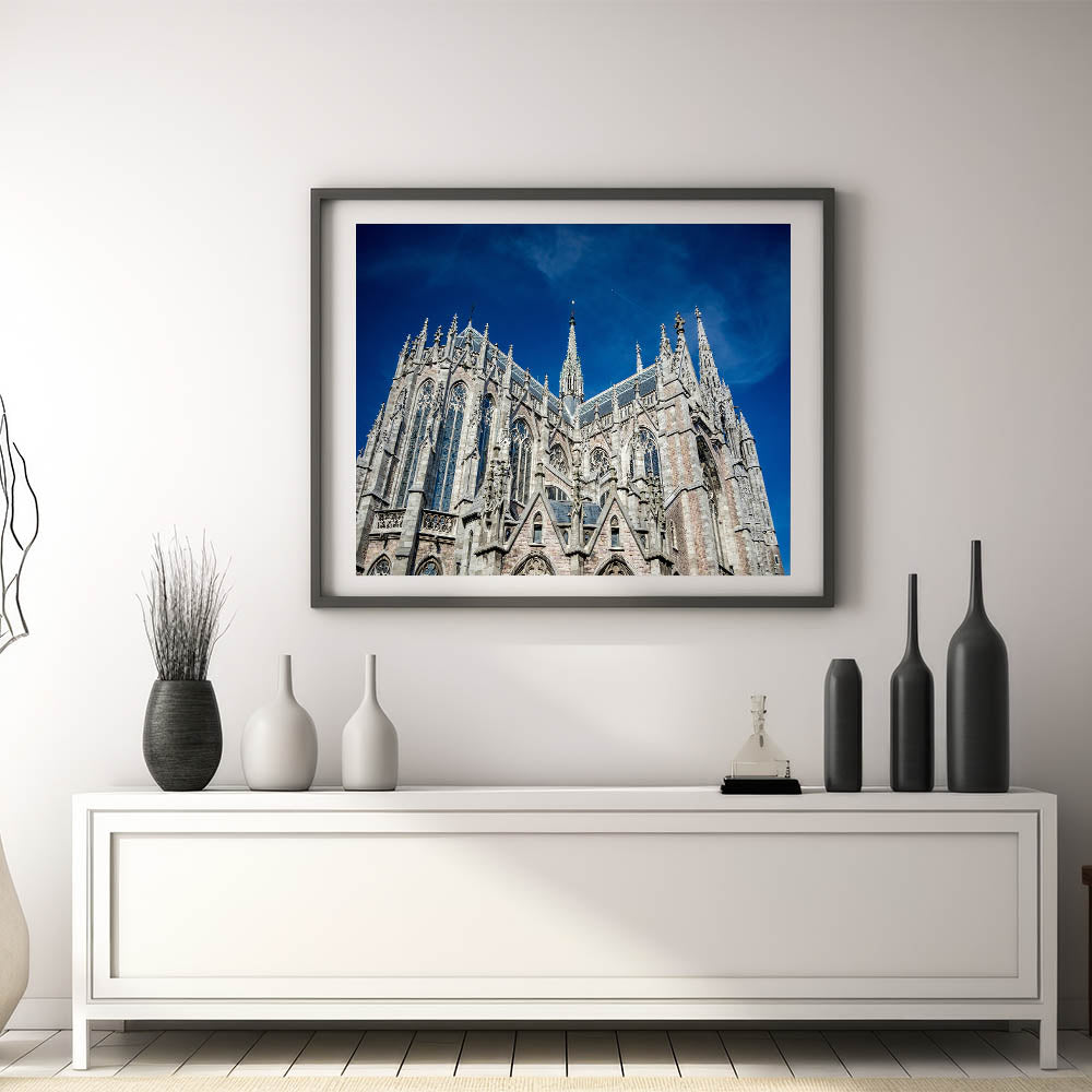 This beautiful wall art offers a close-up view of the intricate Gothic architecture of the Duomo di Milano. The artwork captures the stunning details of the cathedral’s spires, windows, and ornate carvings against a clear, vibrant blue sky. It’s a striking portrayal of one of Italy’s most iconic landmarks.