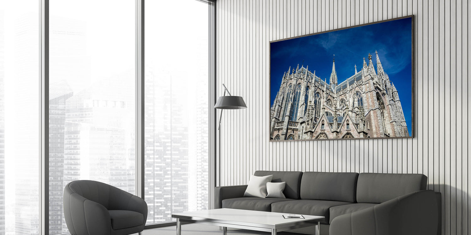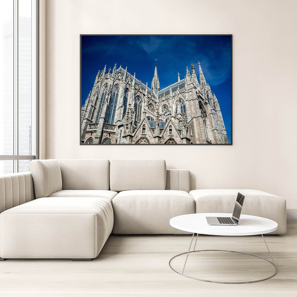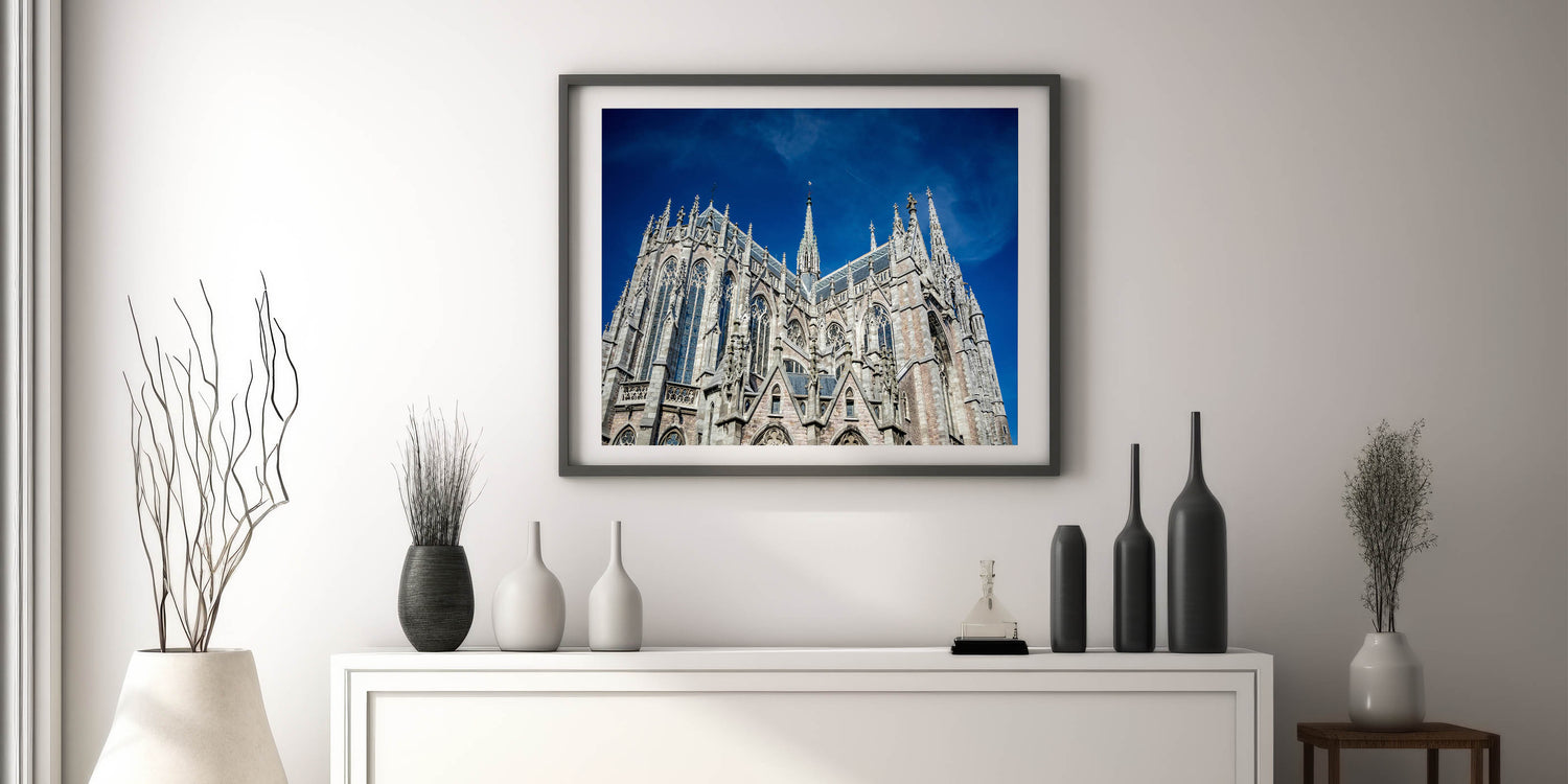 This beautiful wall art offers a close-up view of the intricate Gothic architecture of the Duomo di Milano. The artwork captures the stunning details of the cathedral’s spires, windows, and ornate carvings against a clear, vibrant blue sky. It’s a striking portrayal of one of Italy’s most iconic landmarks.