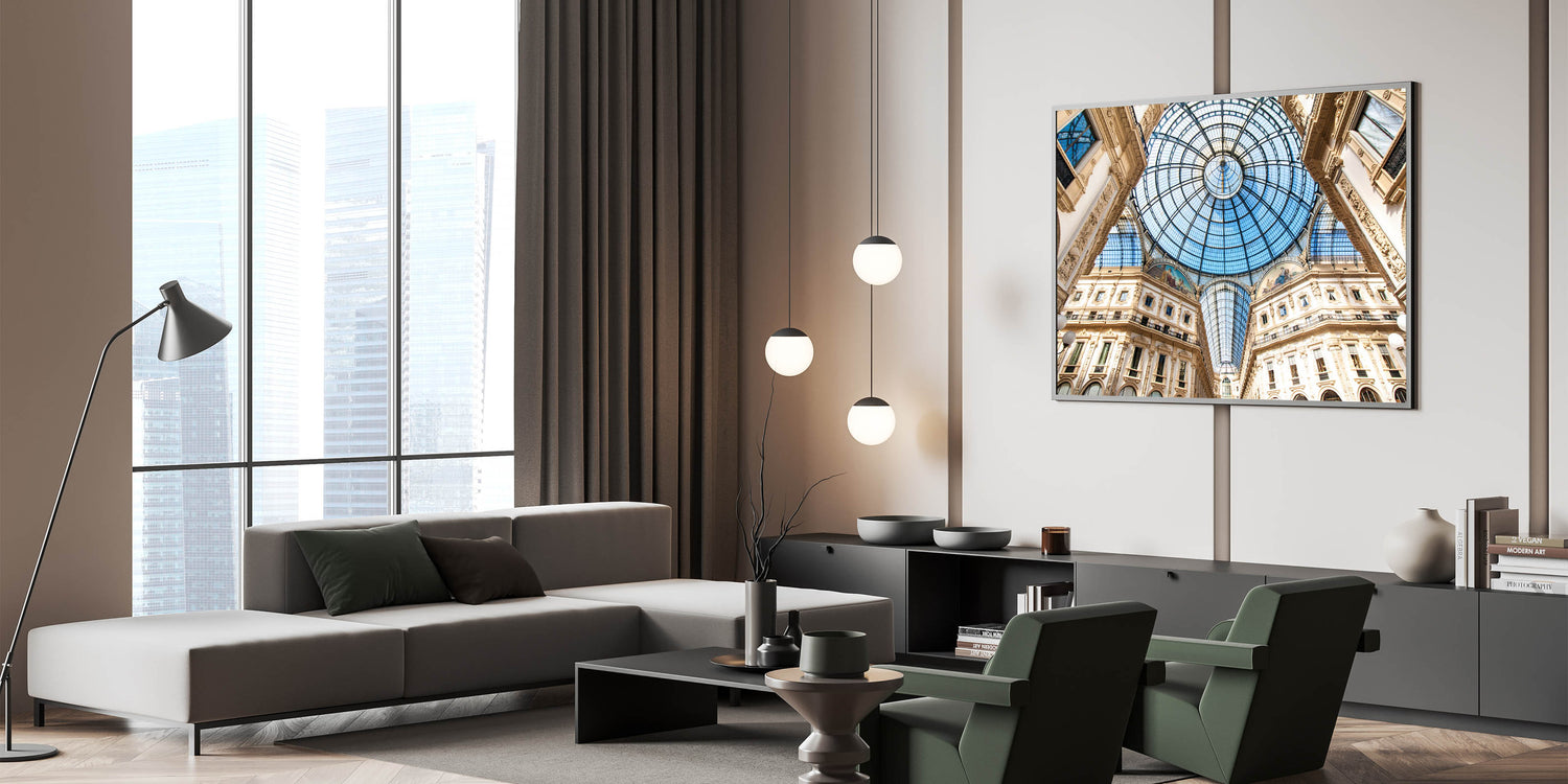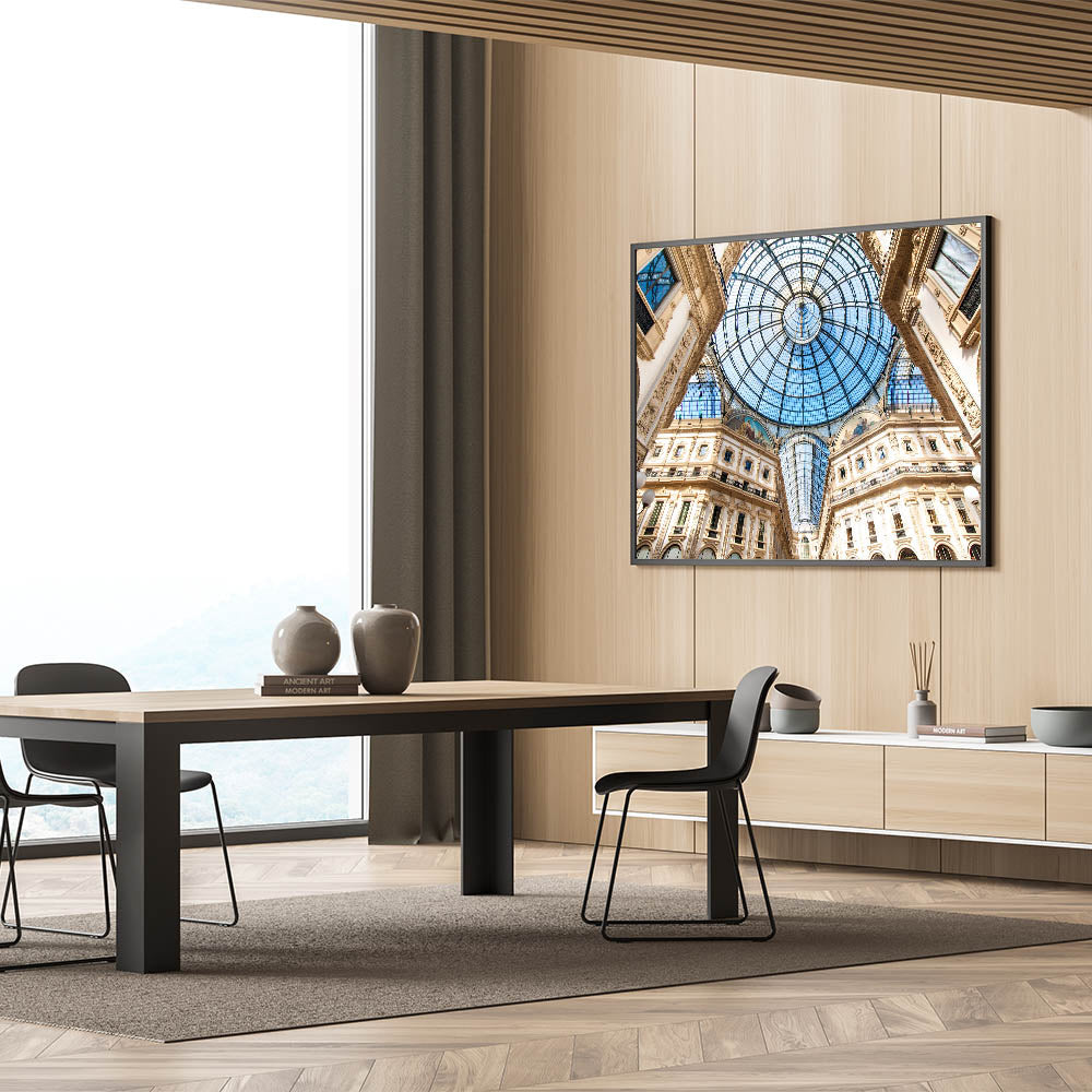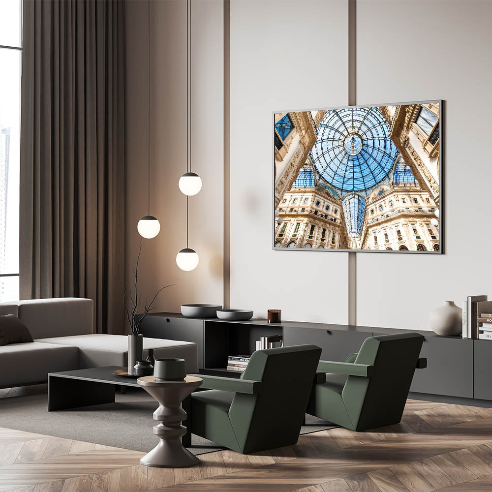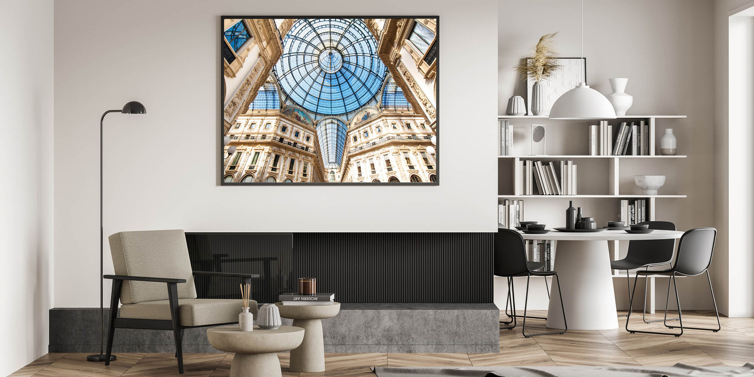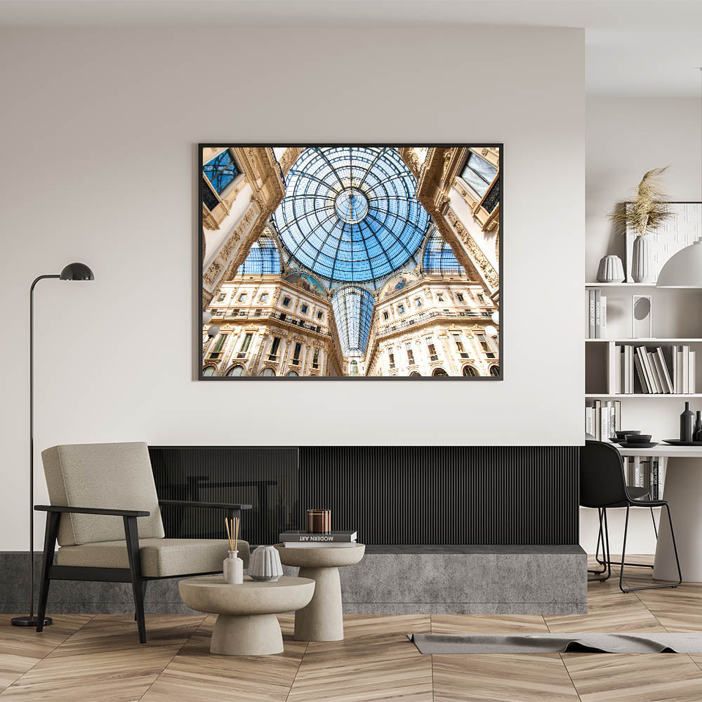 Admire the breathtaking beauty of Milan’s Galleria Vittorio Emanuele II with this stunning wall art, showcasing the iconic glass dome ceiling. This piece captures the intricate details of the Galleria’s architecture, highlighting its neoclassical beauty and grand design.