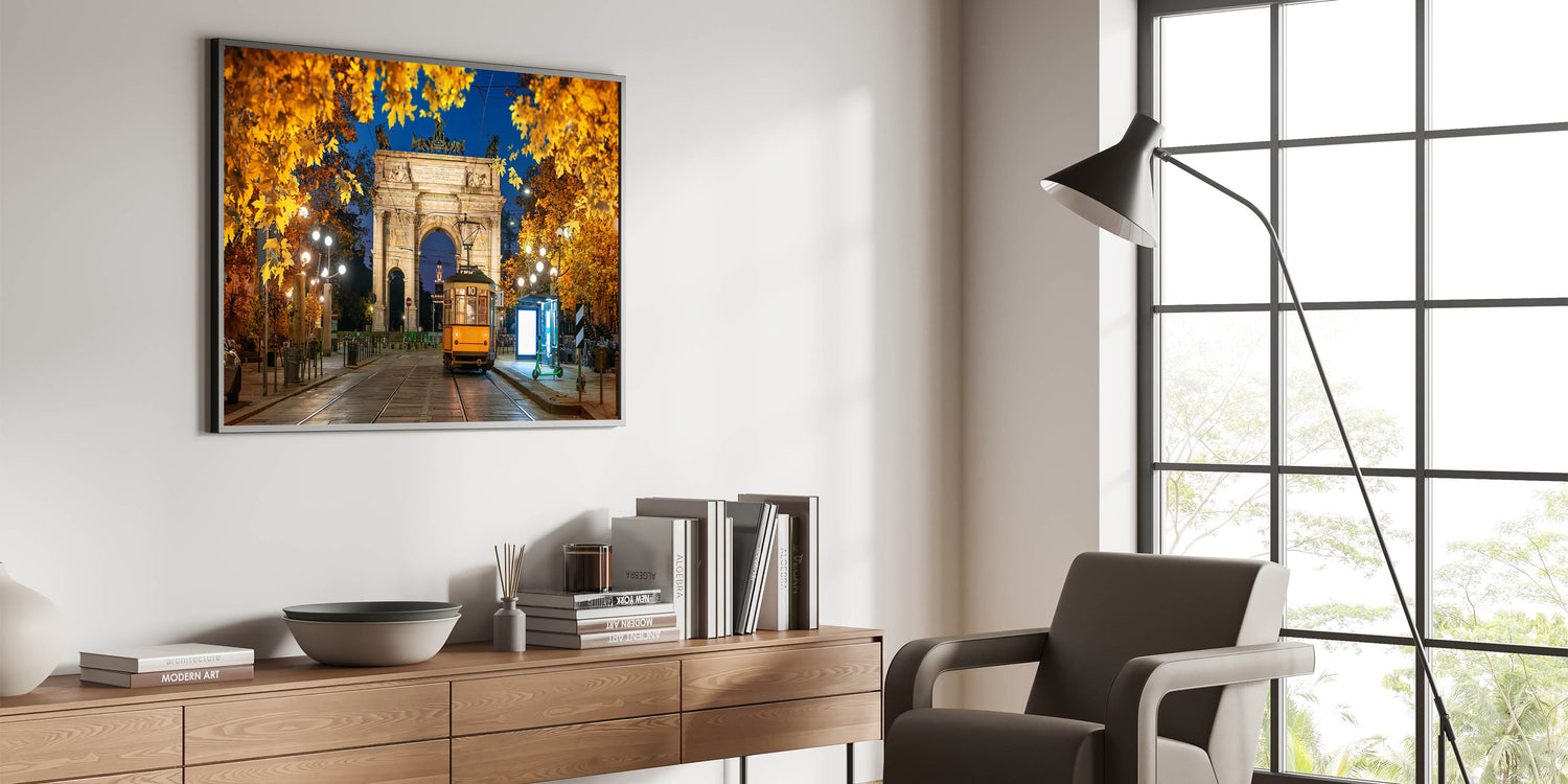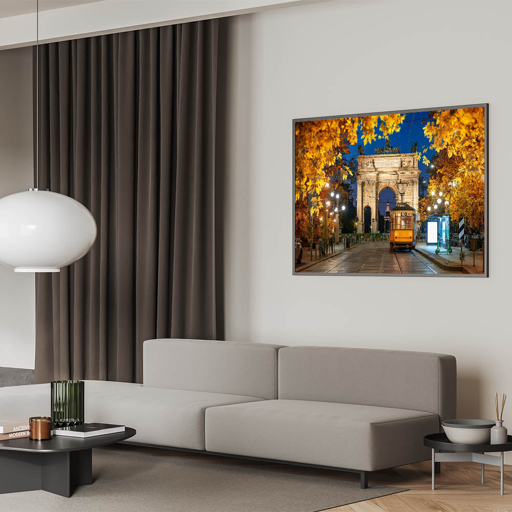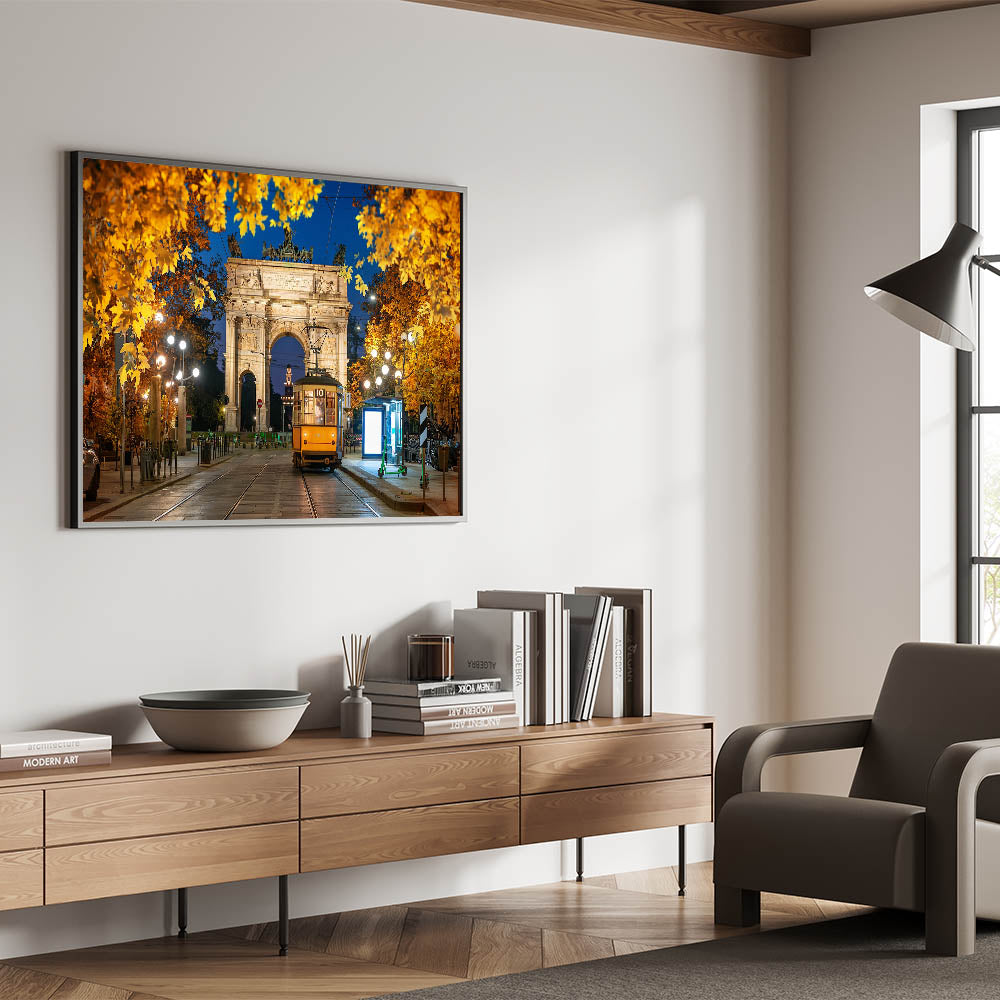 Capture the magic of Milan at night with this stunning artwork featuring the Arco della Pace and a historic tram illuminated by city lights. The golden leaves of autumn frame this elegant scene, creating a warm, inviting atmosphere that highlights Milan's timeless charm and architectural beauty.