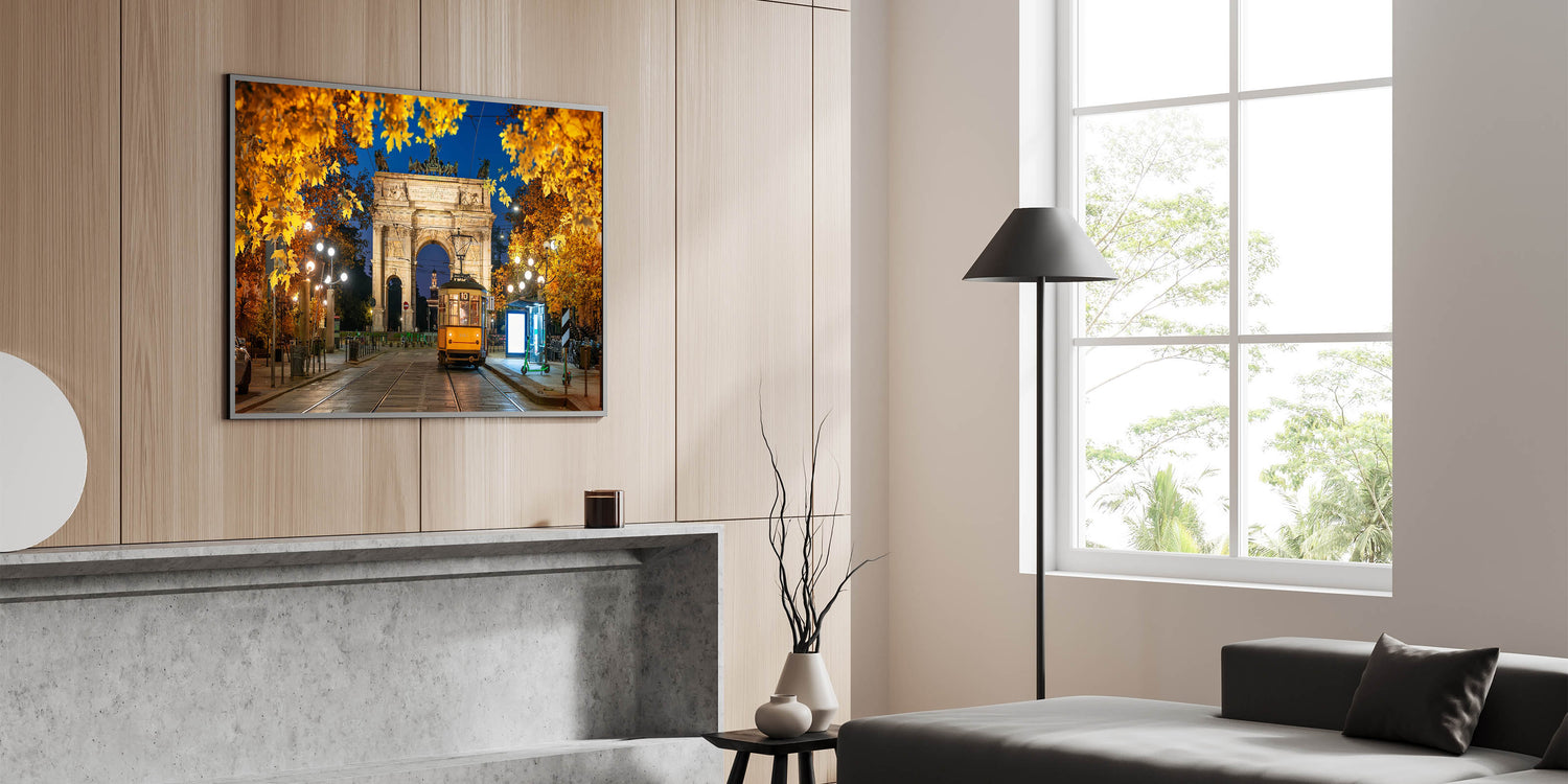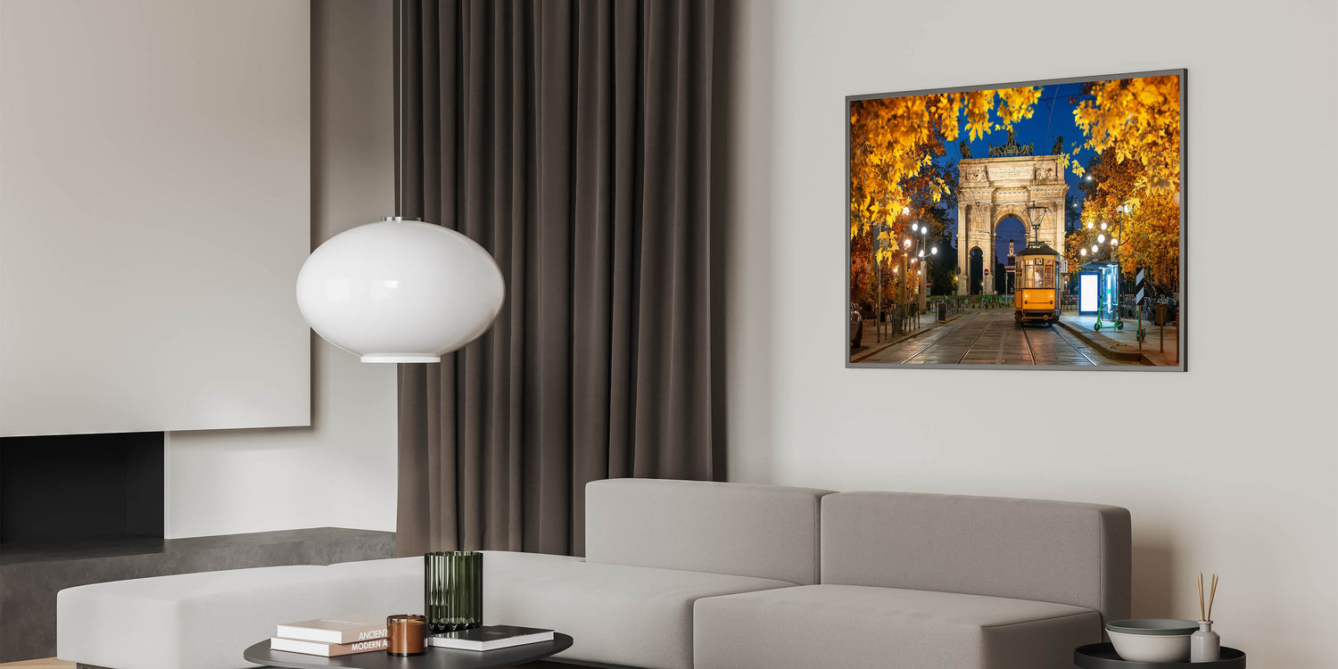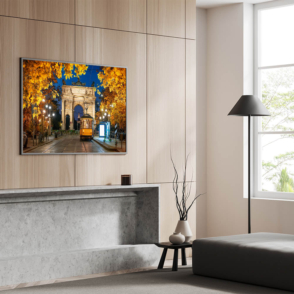 Capture the magic of Milan at night with this stunning artwork featuring the Arco della Pace and a historic tram illuminated by city lights. The golden leaves of autumn frame this elegant scene, creating a warm, inviting atmosphere that highlights Milan's timeless charm and architectural beauty.