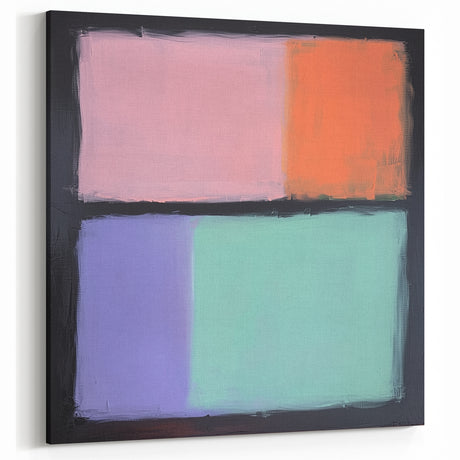 • Abstract minimalist wall art featuring soft pastel colors on a stretched canvas, showcasing geometric shapes and a modern design, ideal for contemporary decor.