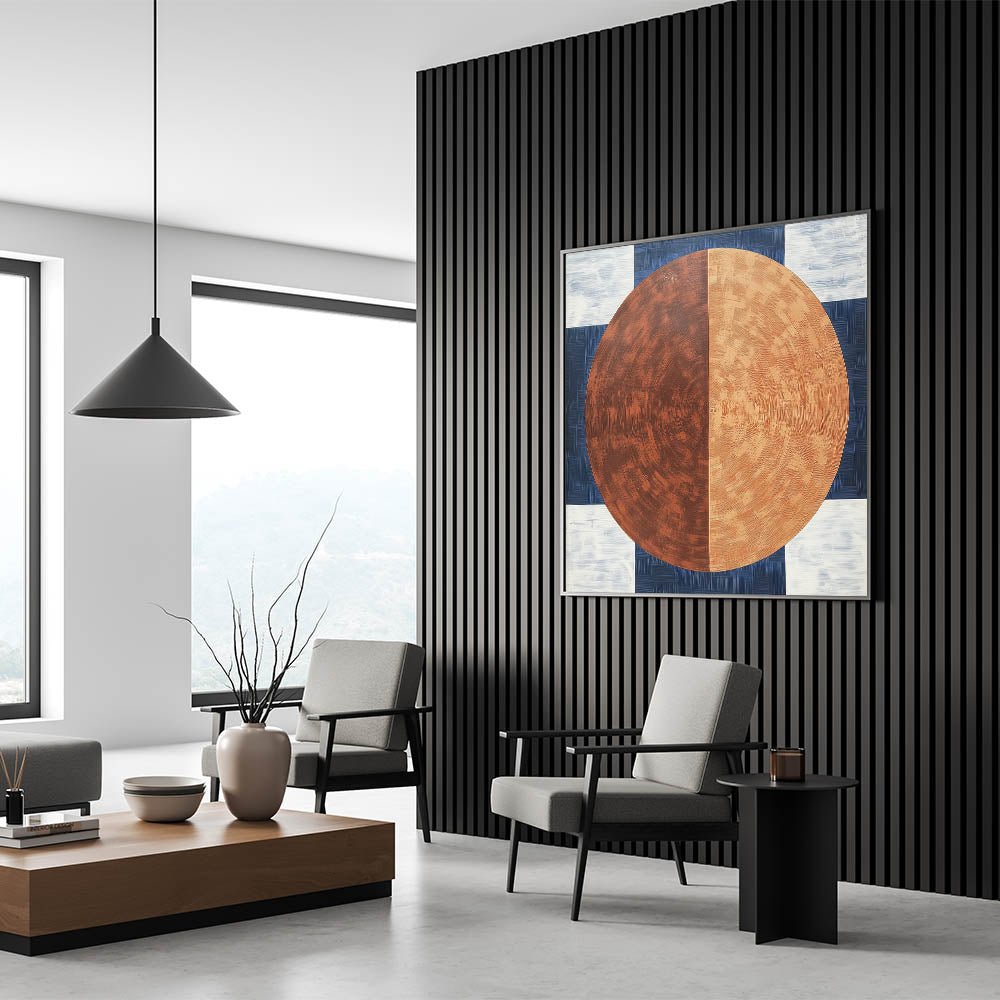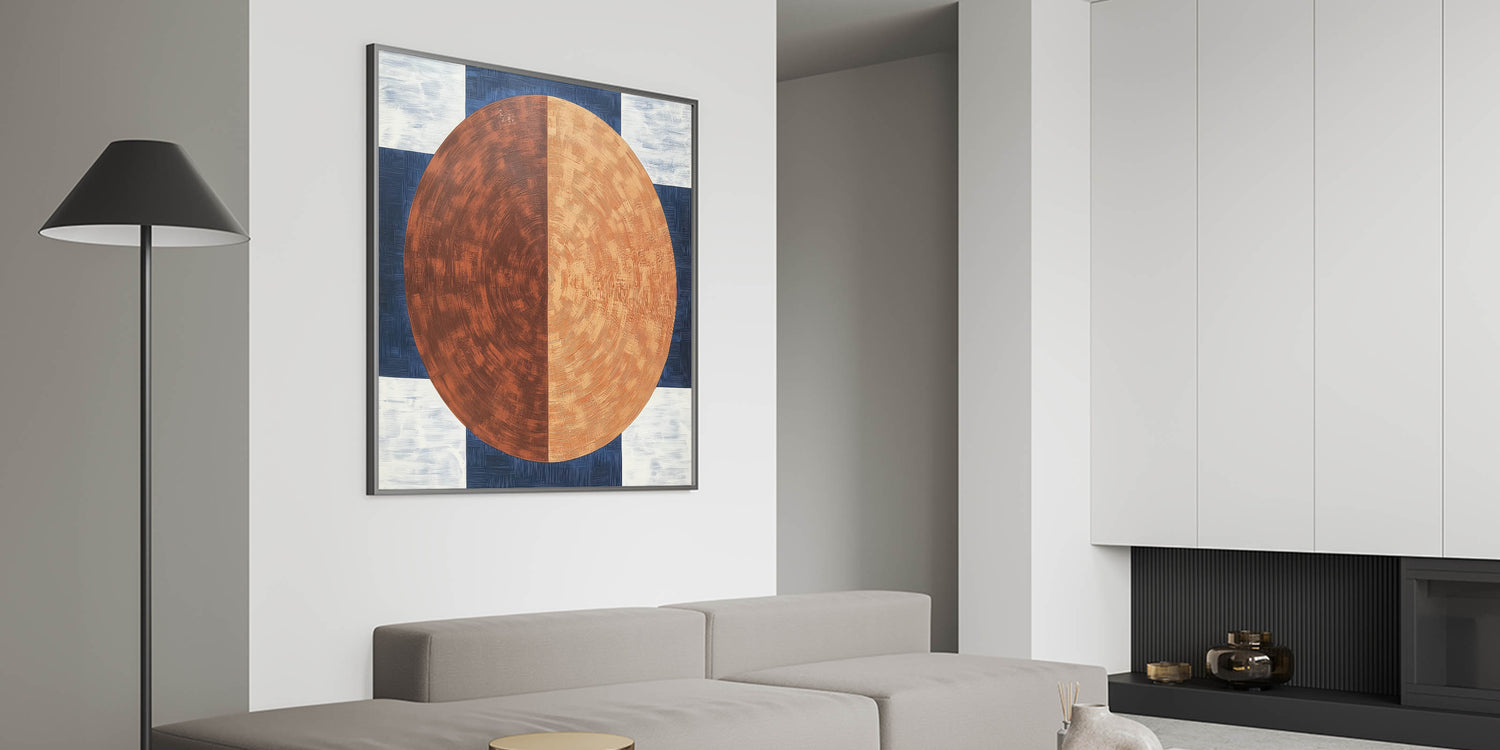 Introduce elegance to your space with this Abstract Geometric Wall Art, featuring a large, split bronze circular design contrasted against a navy and white geometric background. The artwork’s textured details and harmonious composition add depth, making it an eye-catching centerpiece for contemporary decor.