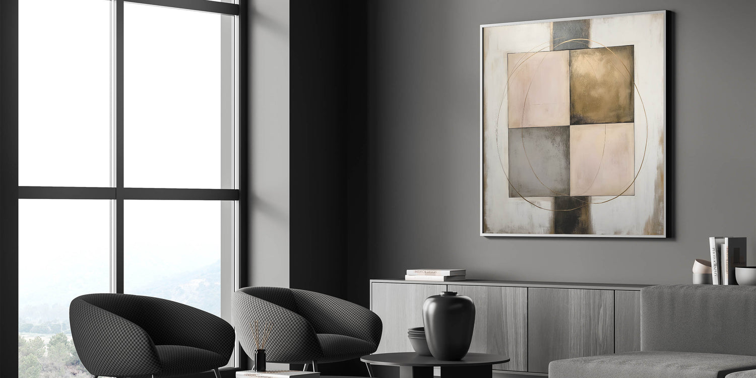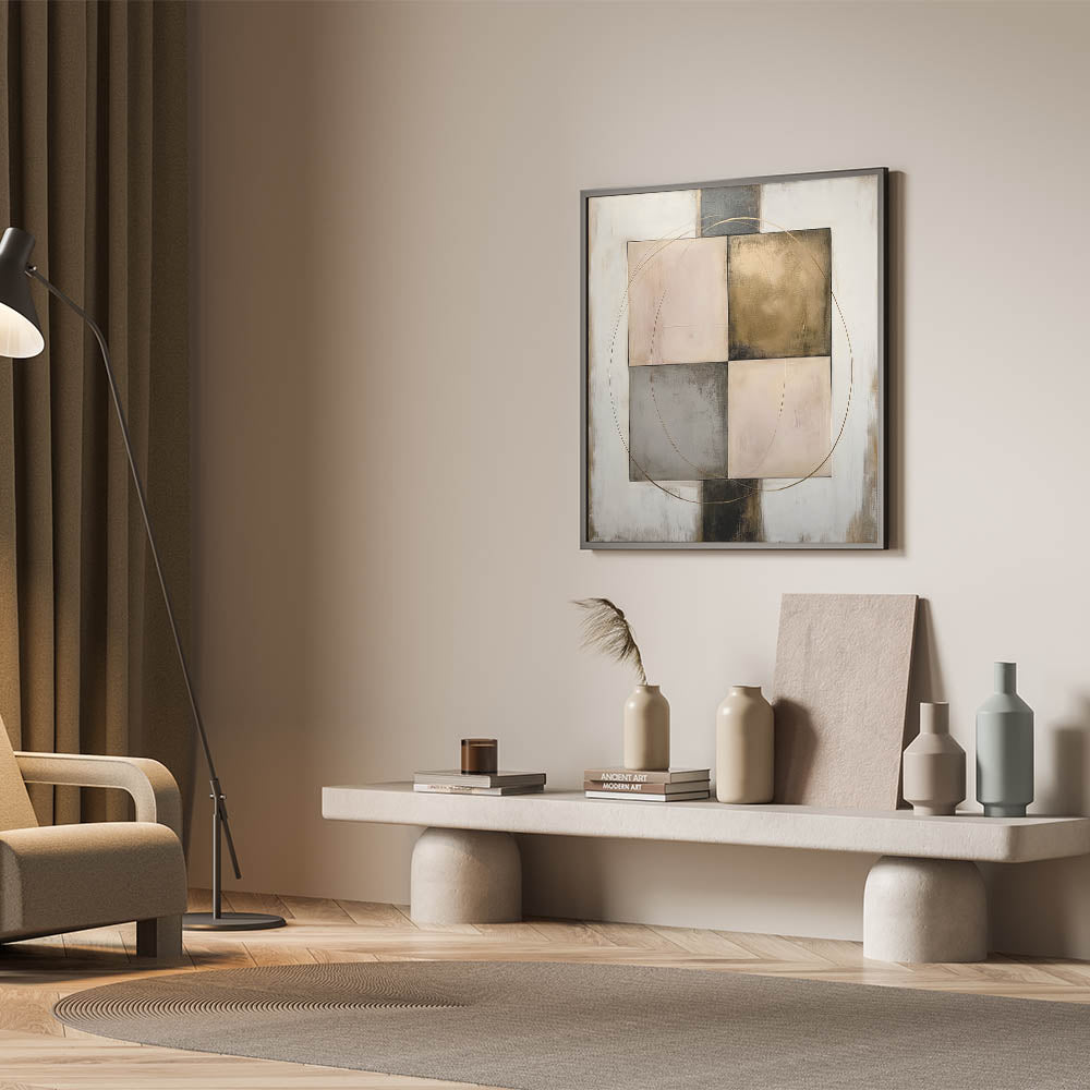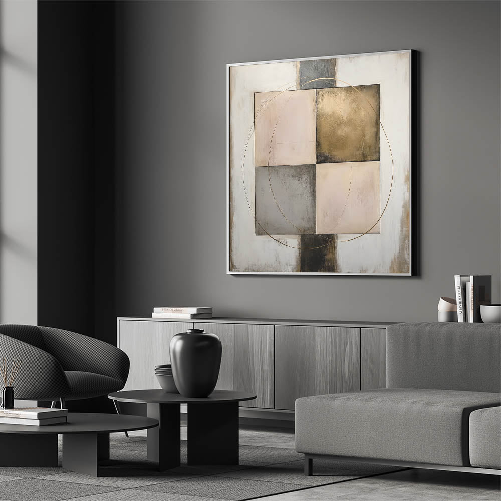 Add sophistication to your space with this Abstract Geometric Wall Art, showcasing a harmonious composition of neutral-toned squares in soft beige, gray, and gold, overlaid with delicate metallic circular accents. The elegant blend of textures and tones creates a modern and minimalist design that brings balance and refinement to any interior.