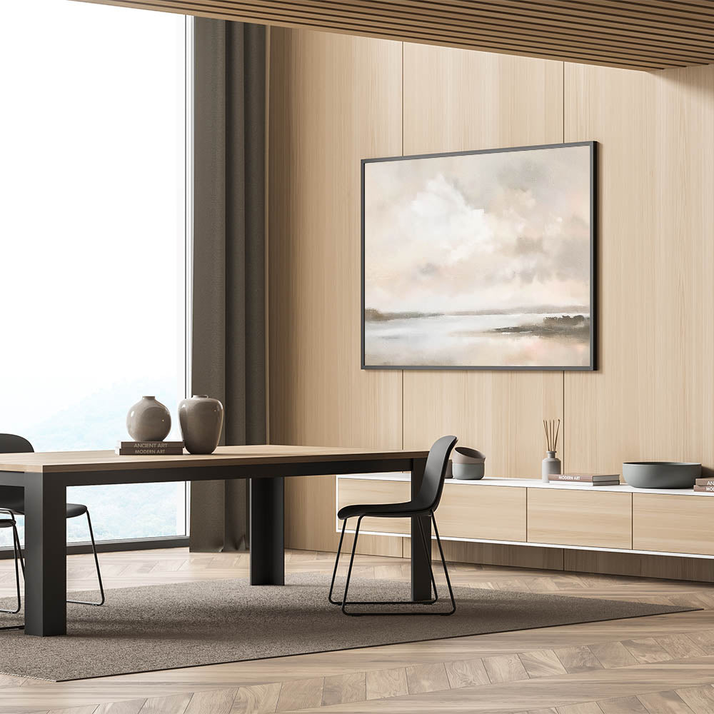 Create a calming, natural ambiance in your space with this abstract landscape canvas art. Featuring soft tones of beige, gray, and hints of muted pink, this artwork evokes a peaceful, misty morning by the water. The gentle colors and blurred details make it an ideal choice for minimalist and contemporary interiors, adding a subtle yet sophisticated touch.