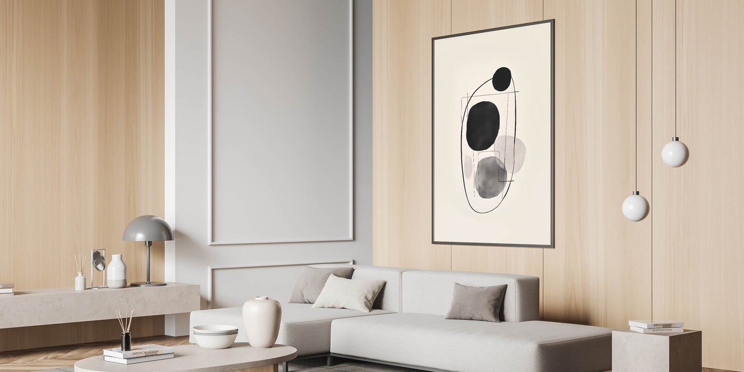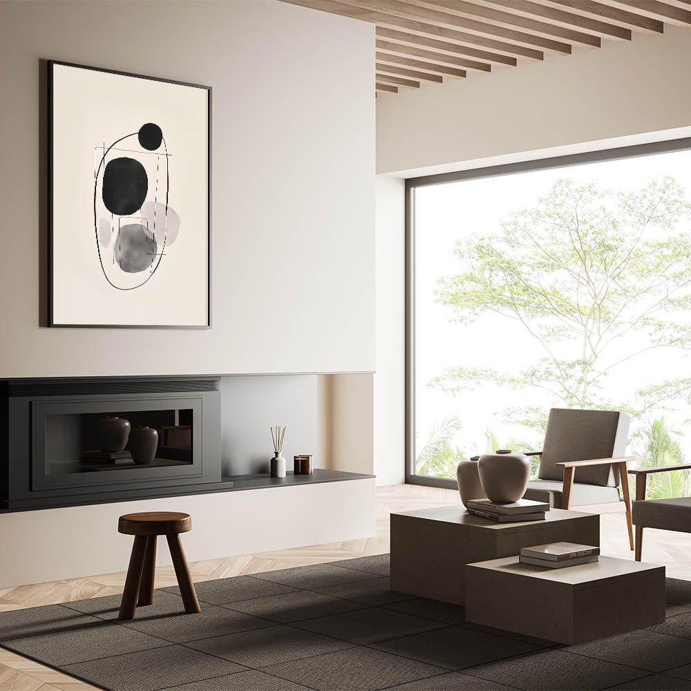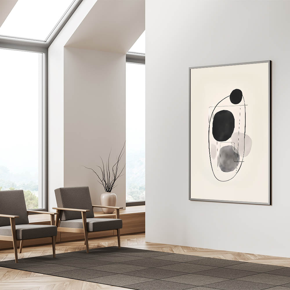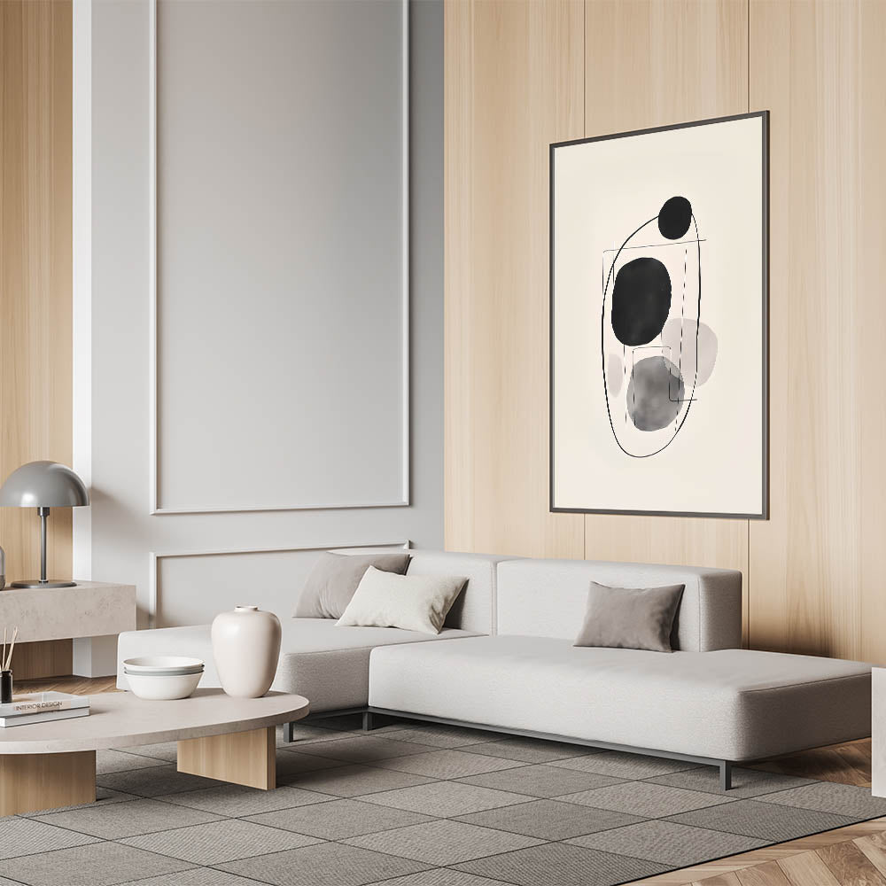 Introduce a modern touch to your decor with this abstract minimalist circle art, showcasing black and gray circular shapes connected by delicate linework. The soft monochromatic tones create a calm and balanced aesthetic, making it perfect for contemporary and minimalist interiors. Available in multiple formats, including stretched canvas, acrylic glass, and framed prints, this artwork adds an elegant, understated focal point to any room.