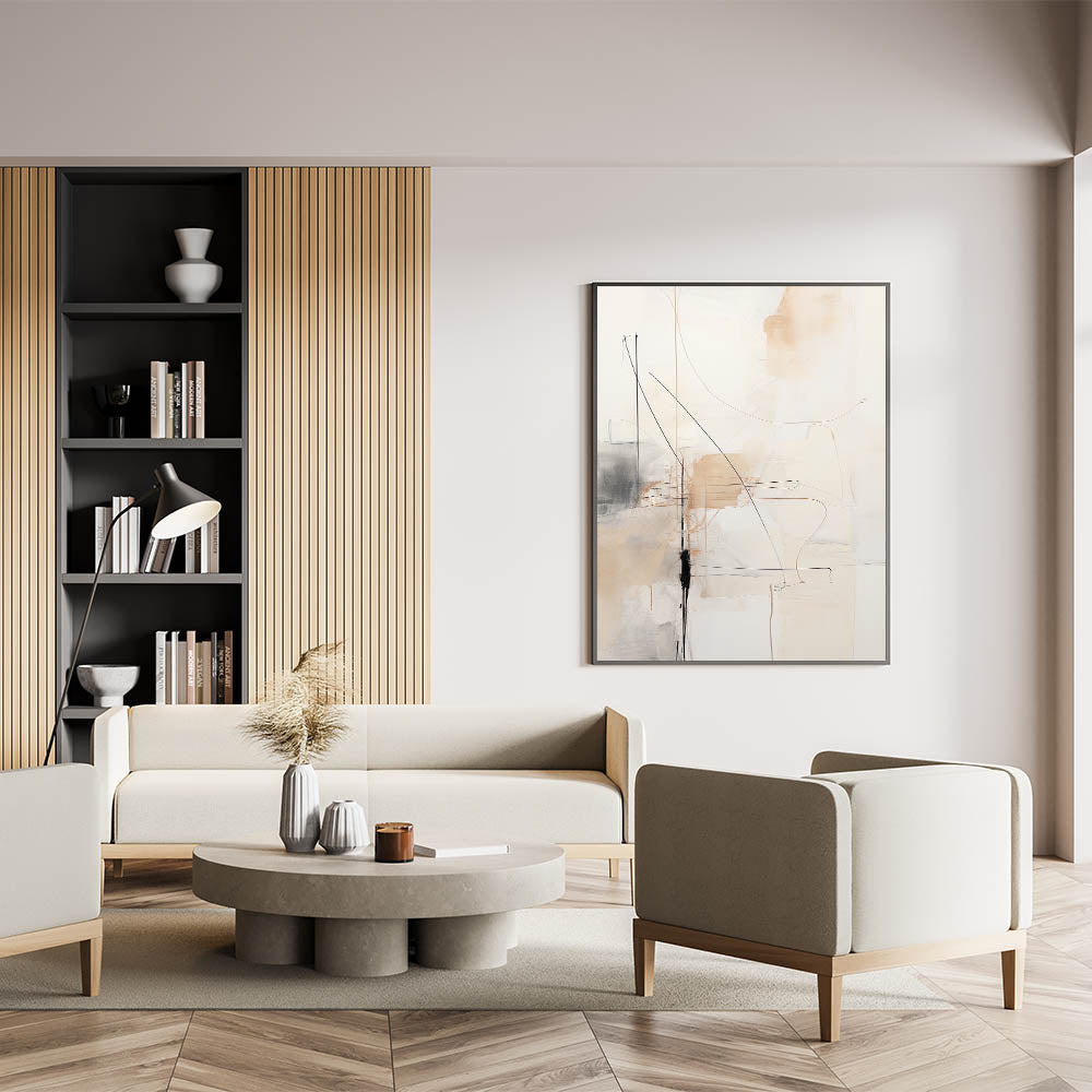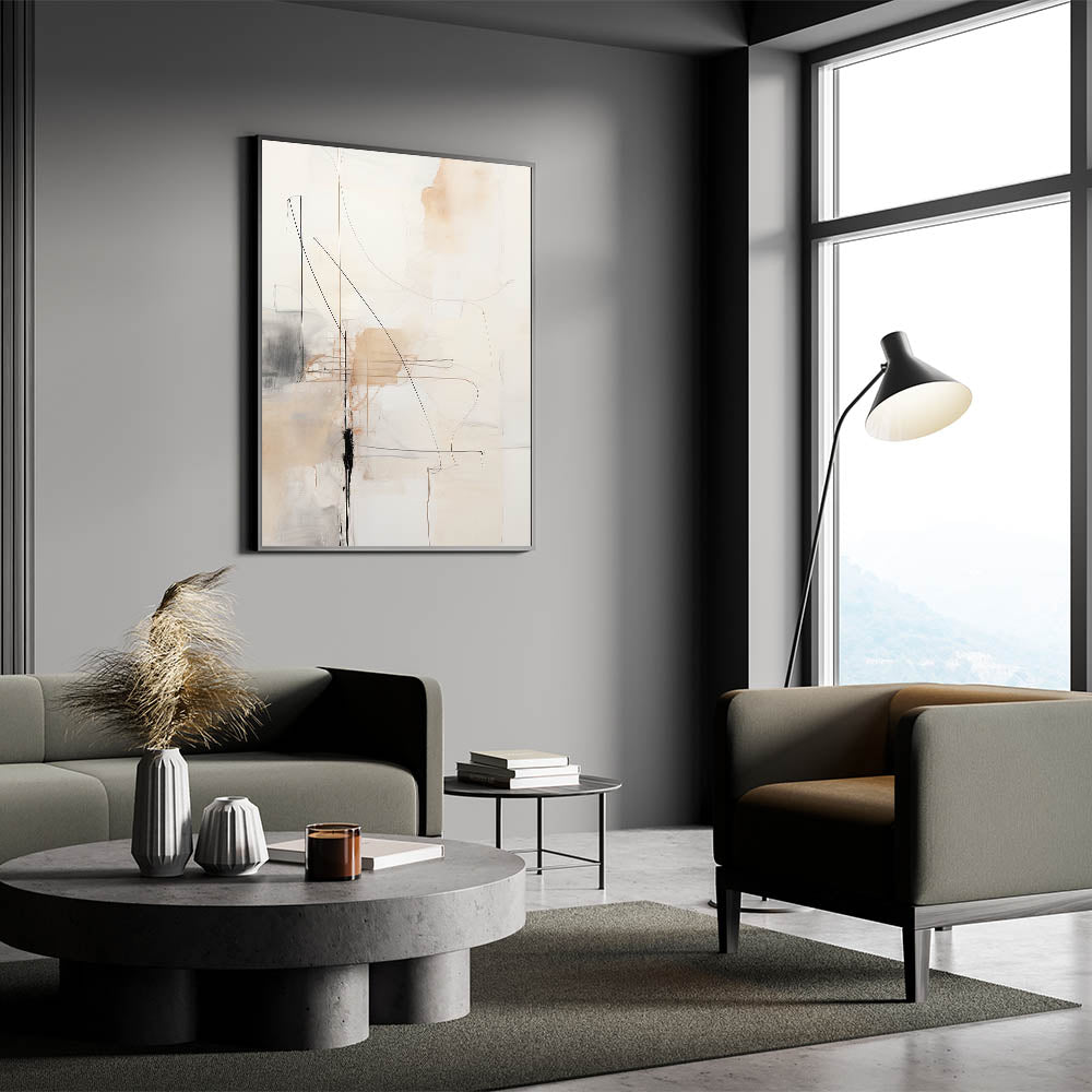 Transform your space with this elegant piece of abstract minimalist wall art. Featuring a delicate balance of soft beige tones, subtle lines, and gentle black accents, this artwork exemplifies the beauty of minimalist art style. The clean, flowing lines and muted color palette make this piece an ideal choice for those seeking modern and minimalist home decor. Its refined aesthetic complements a variety of interior styles, bringing a sense of calm and sophistication to living rooms, offices, or bedrooms.