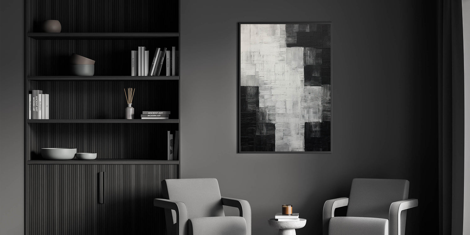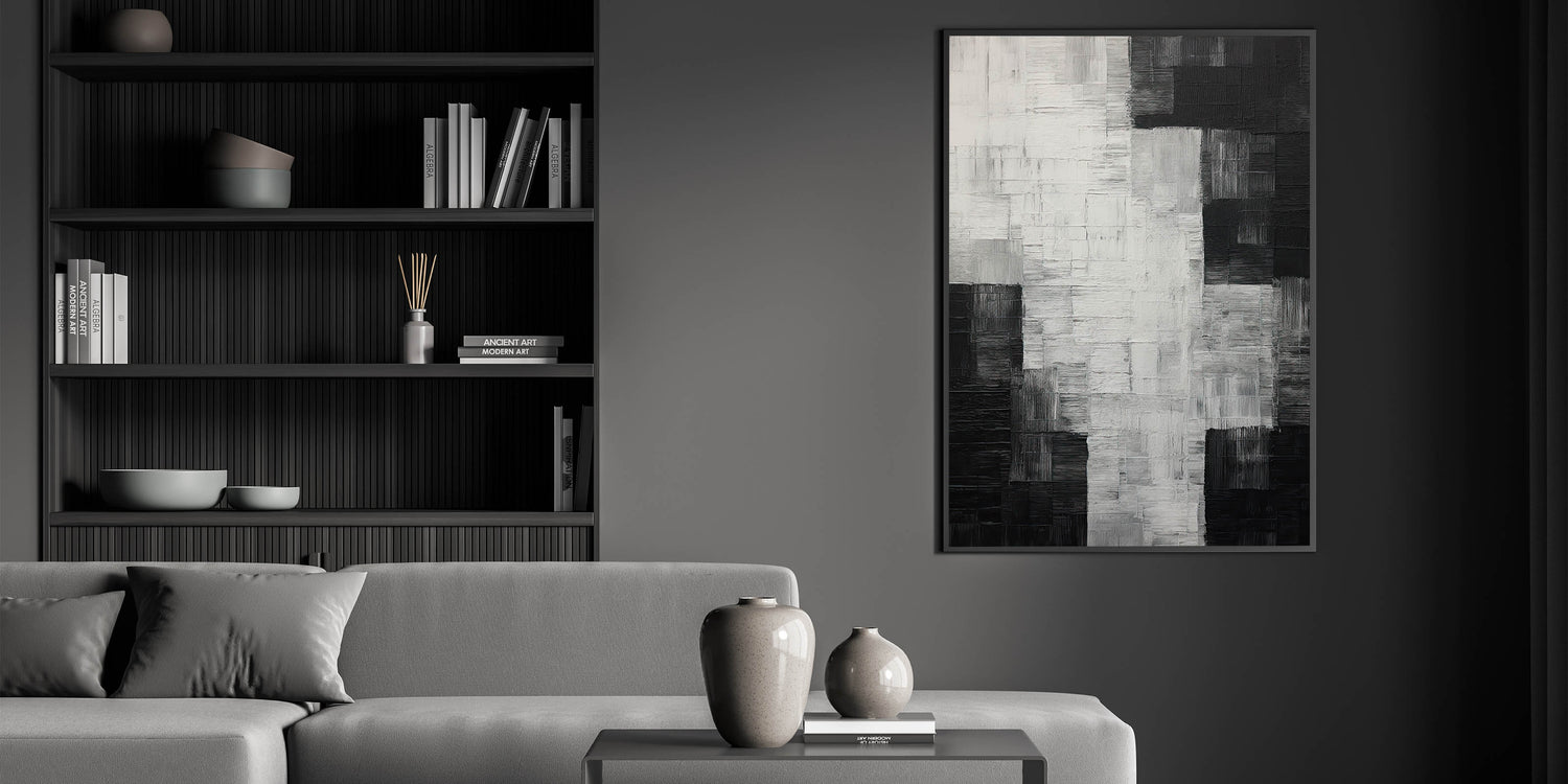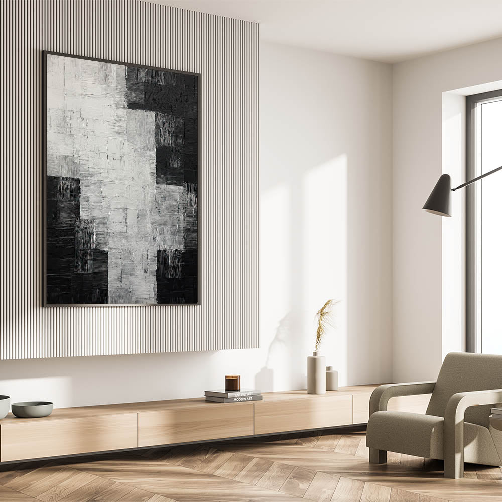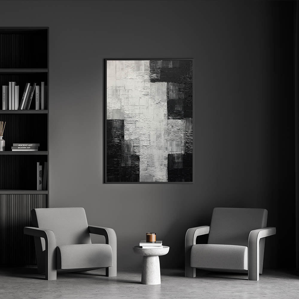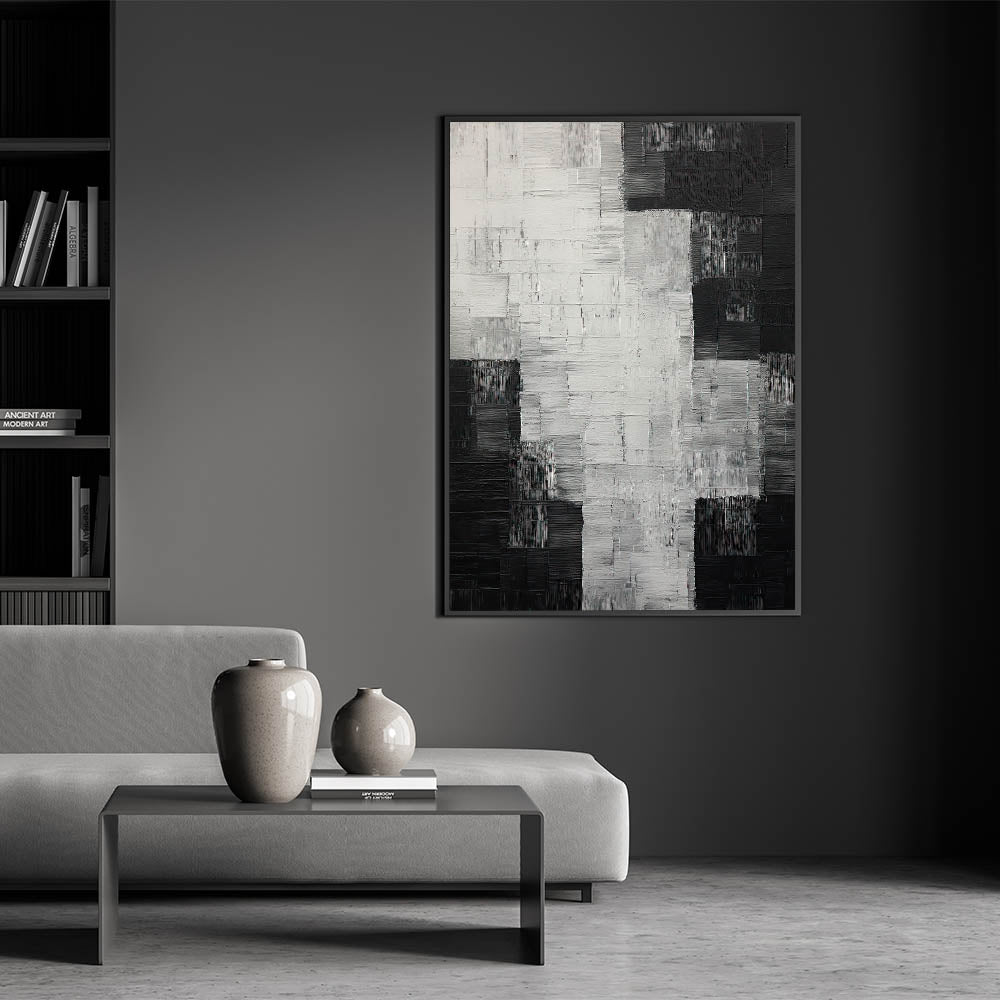 Add a striking modern touch to your home with this abstract minimalist wall art, featuring a bold geometric design in shades of black, white, and gray. The textured arrangement of squares and rectangles creates a captivating visual depth, perfect for adding an artistic yet subtle focal point to any room. Ideal for contemporary and minimalist interiors, this artwork blends effortlessly into a range of decor styles while maintaining its own unique presence.