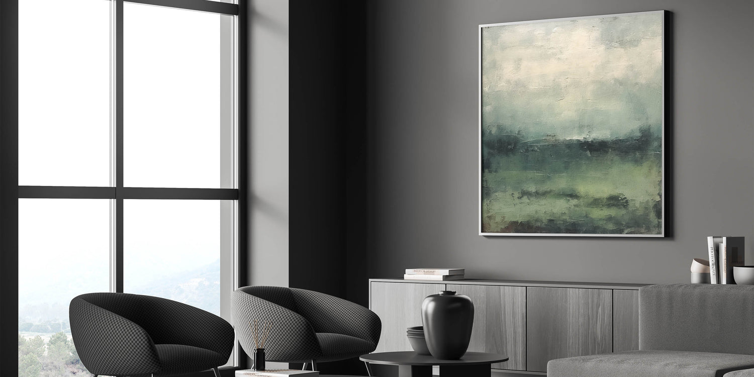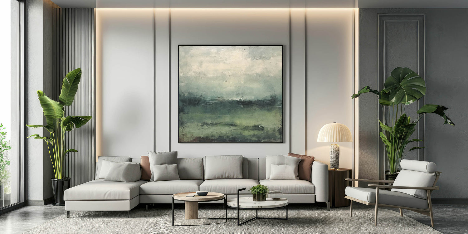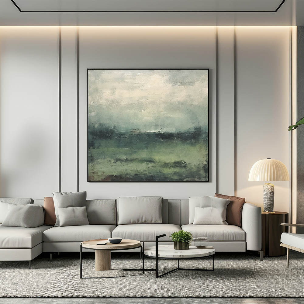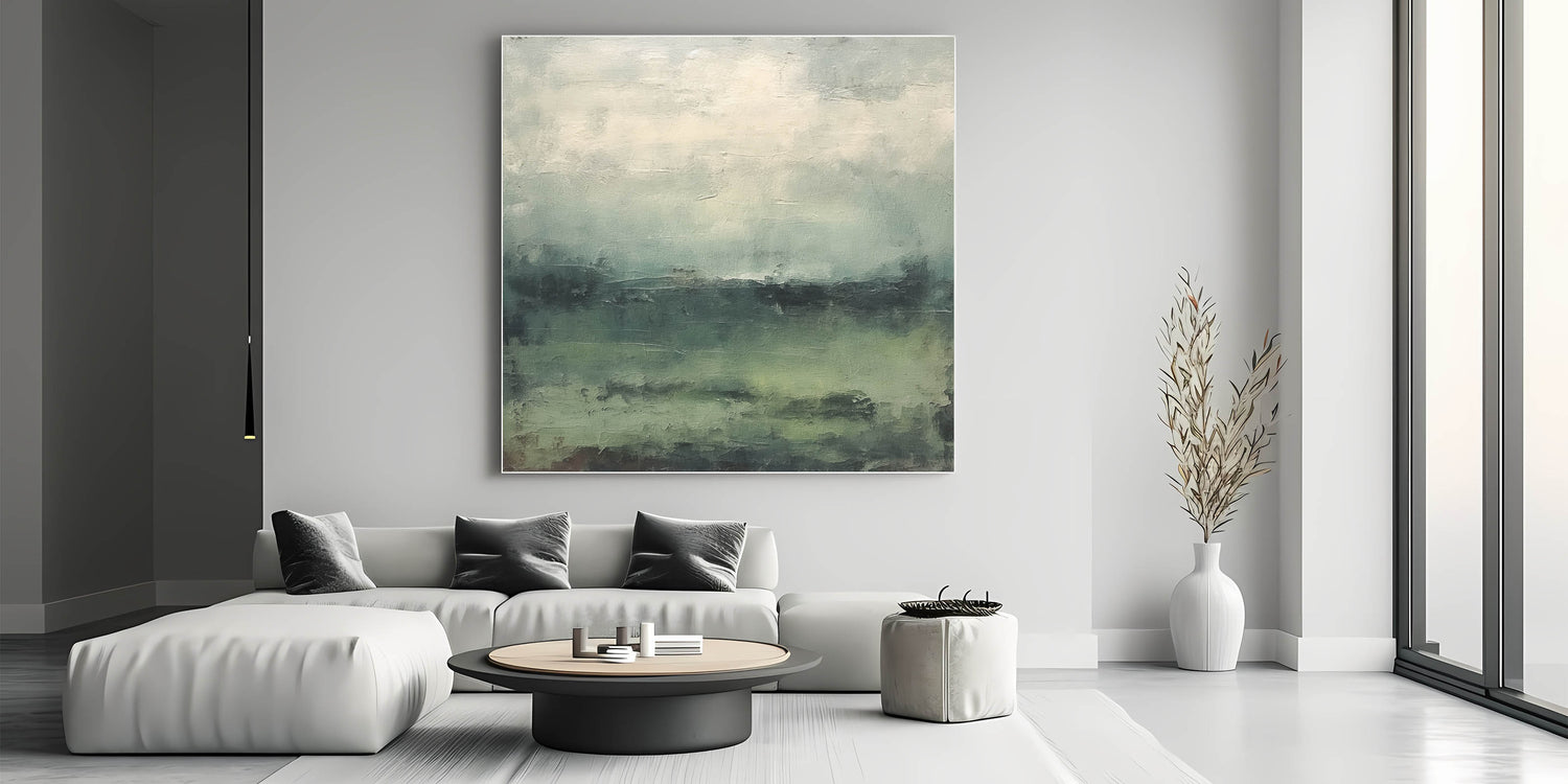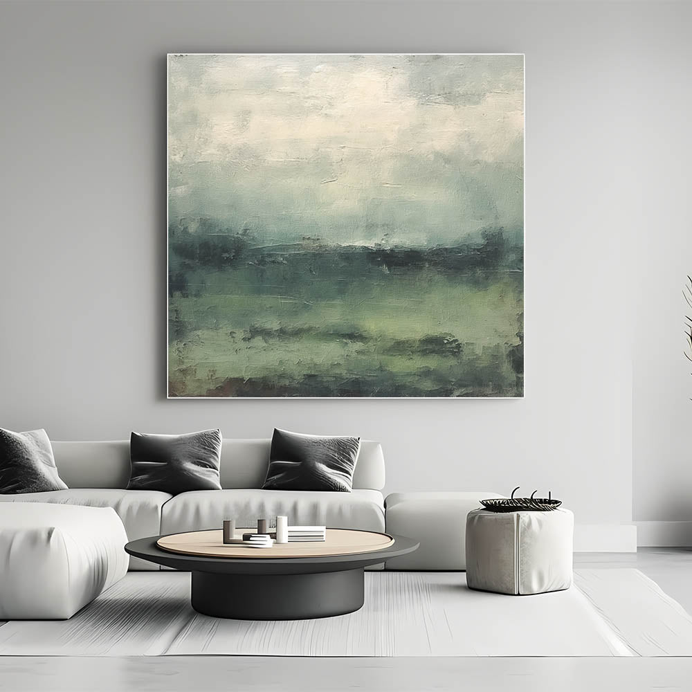 Enhance your home with the peaceful tones of this abstract green landscape art. Its natural hues bring the outdoors inside, creating a relaxing atmosphere in any room, from living rooms to offices.