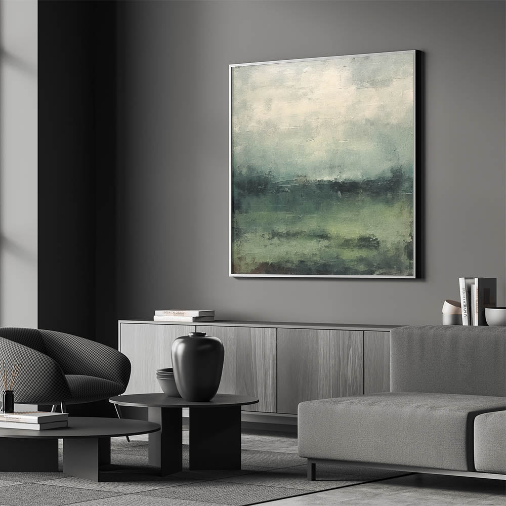 This abstract nature landscape painting beautifully captures the serene and misty essence of a lush green field. Soft shades of green, gray, and touches of black create a tranquil scene that evokes calmness and introspection. The blending of colors in this abstract piece highlights the beauty of nature in a minimalist, impressionistic style, making it an ideal choice for contemporary or rustic decor.