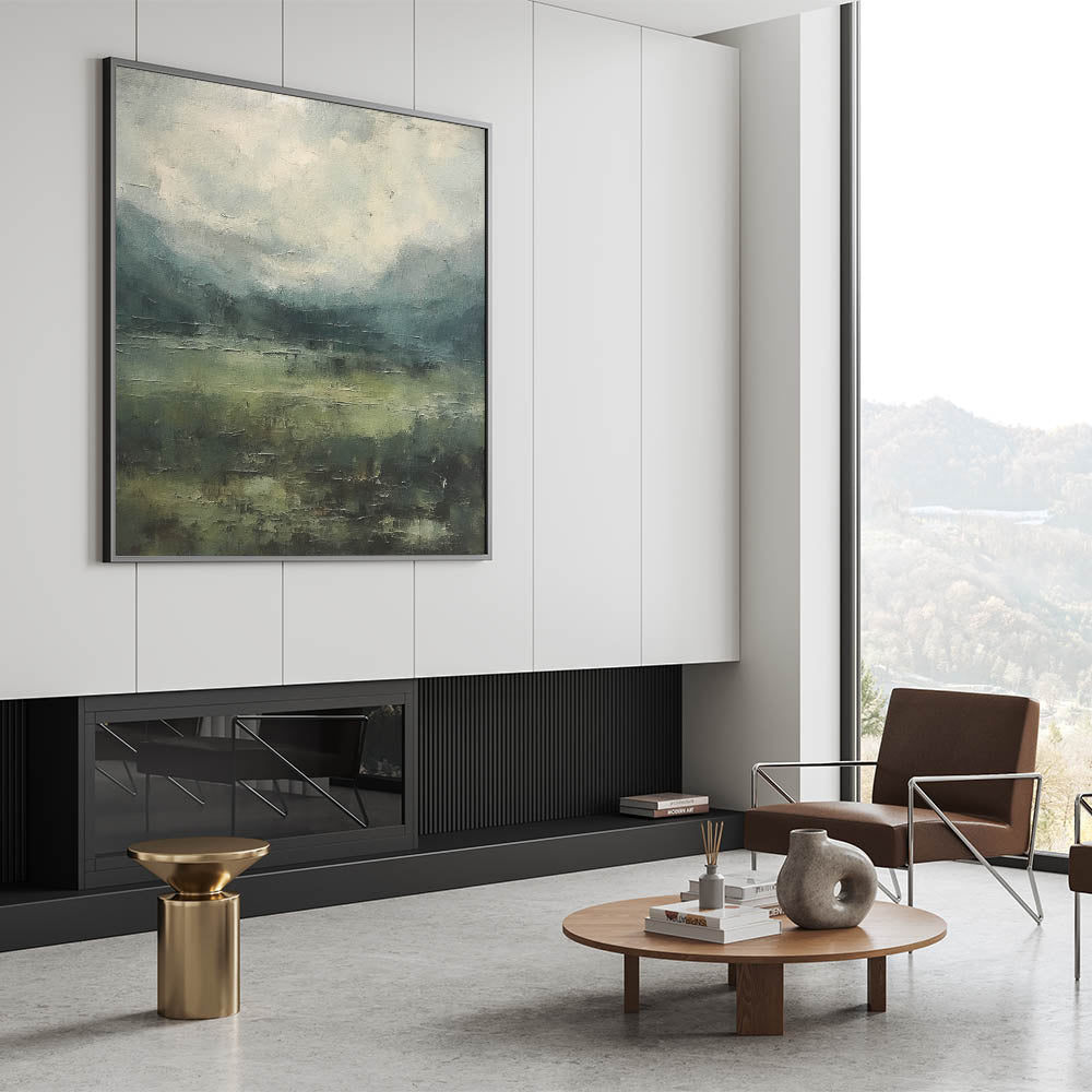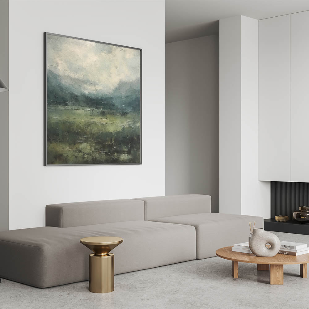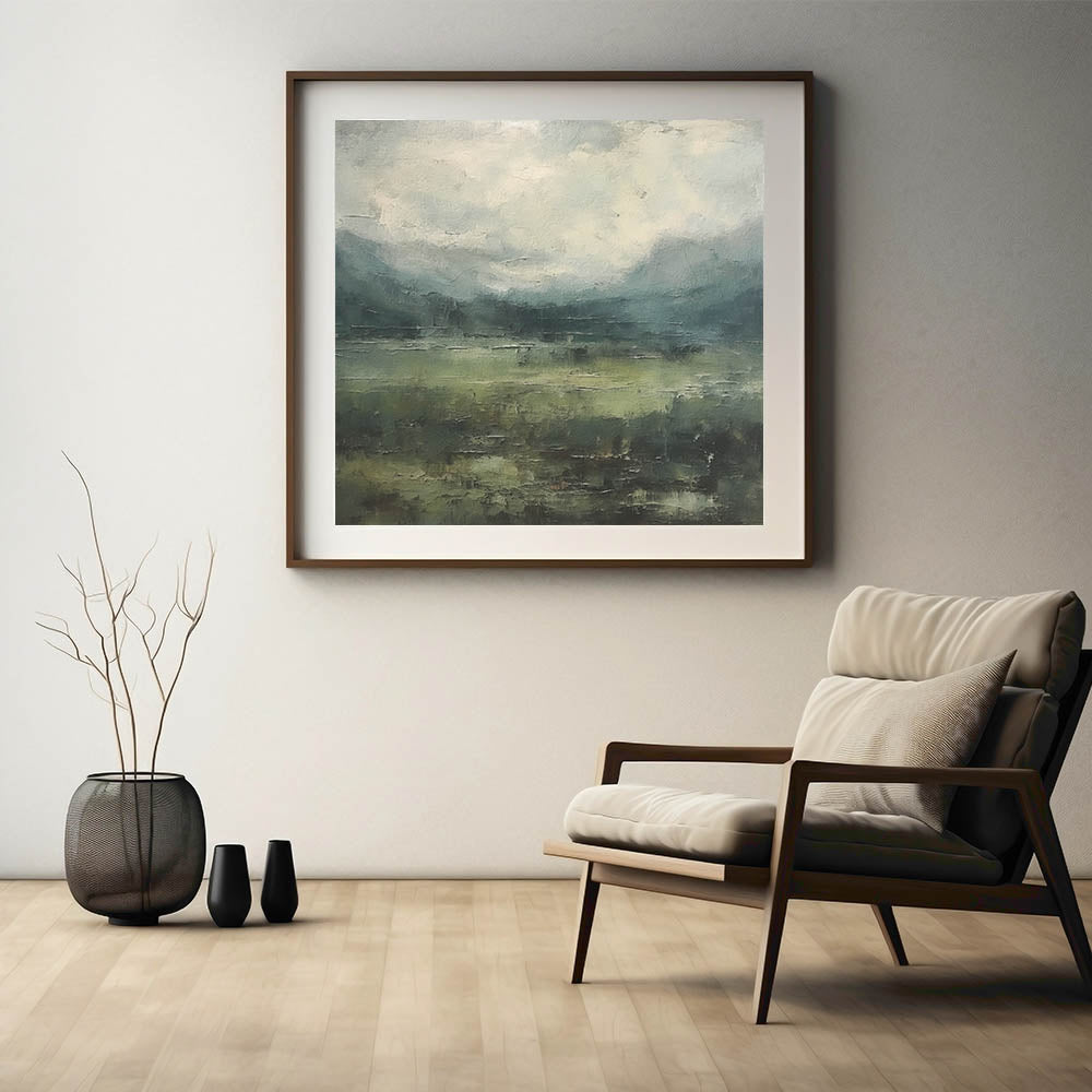 Enhance your decor with this modern landscape abstract showcasing a lush scene in rich shades of green and gray. The misty atmosphere and textured brushstrokes capture the mystery and beauty of nature, evoking a peaceful, introspective mood. This artistic landscape design is ideal for those who appreciate the soothing effects of nature-inspired art in a contemporary format.
