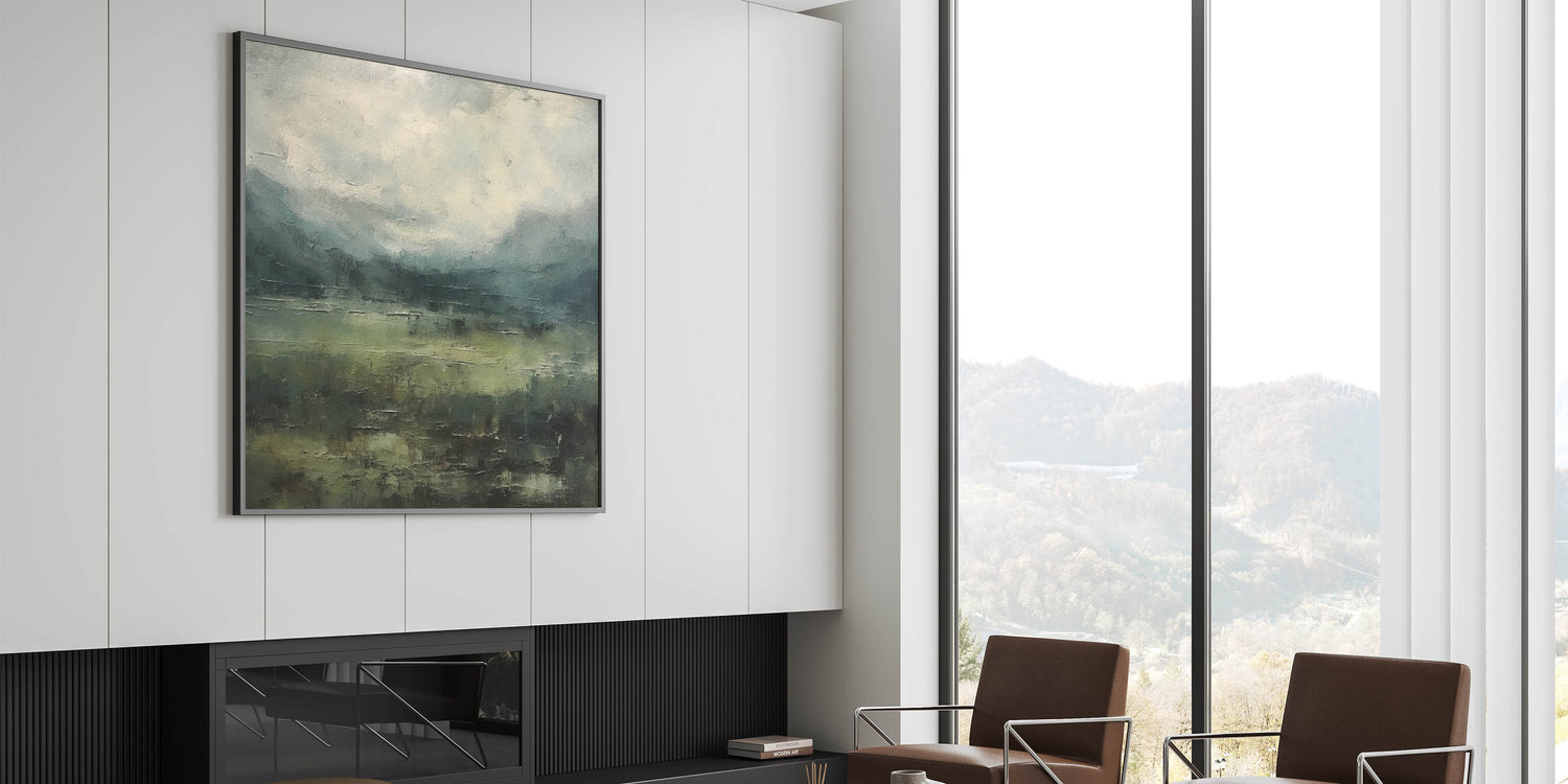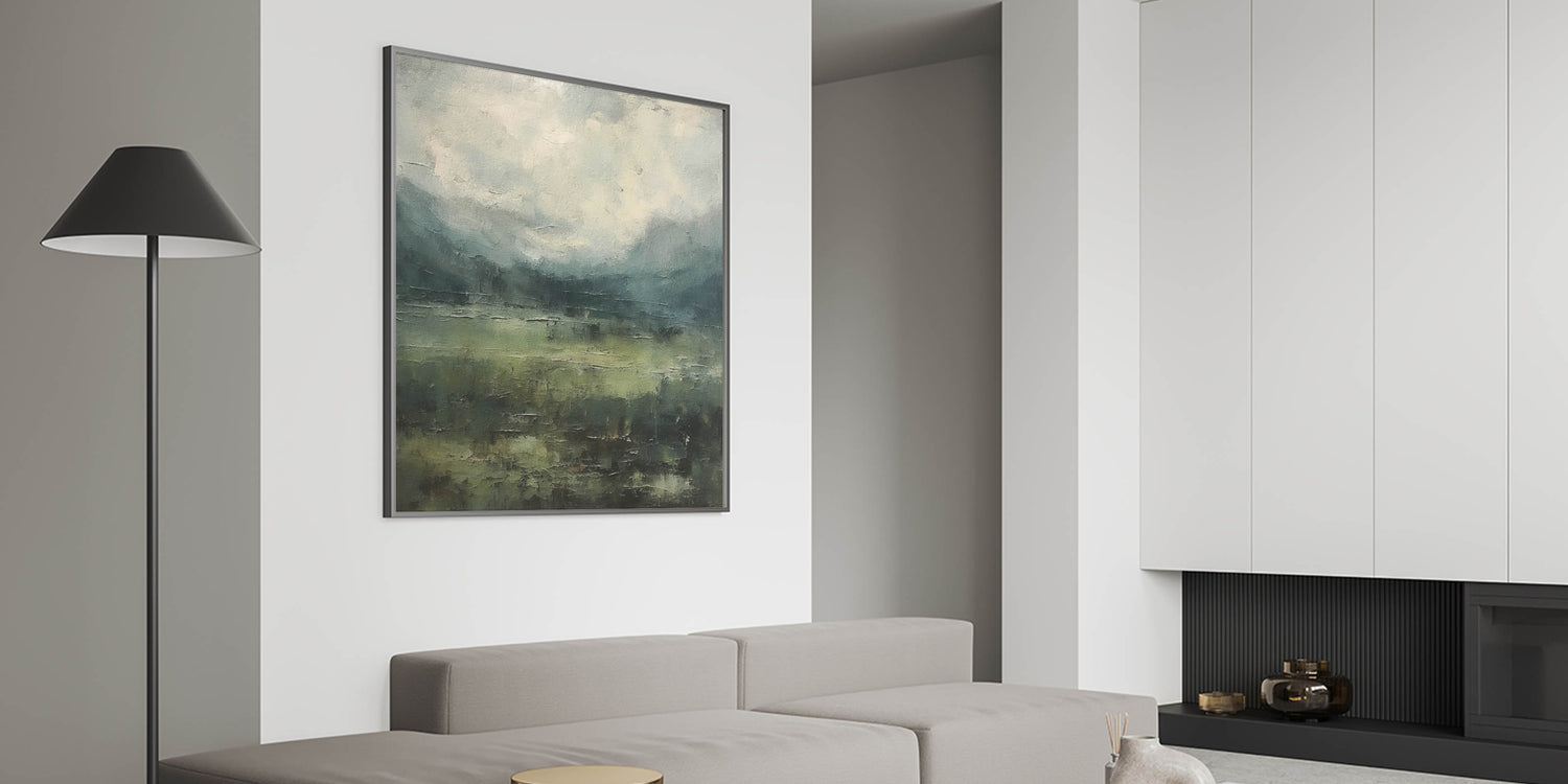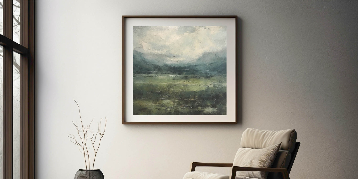 Enhance your decor with this modern landscape abstract showcasing a lush scene in rich shades of green and gray. The misty atmosphere and textured brushstrokes capture the mystery and beauty of nature, evoking a peaceful, introspective mood. This artistic landscape design is ideal for those who appreciate the soothing effects of nature-inspired art in a contemporary format.