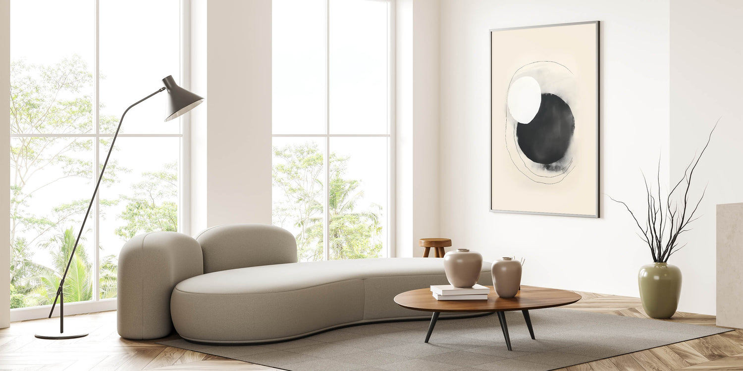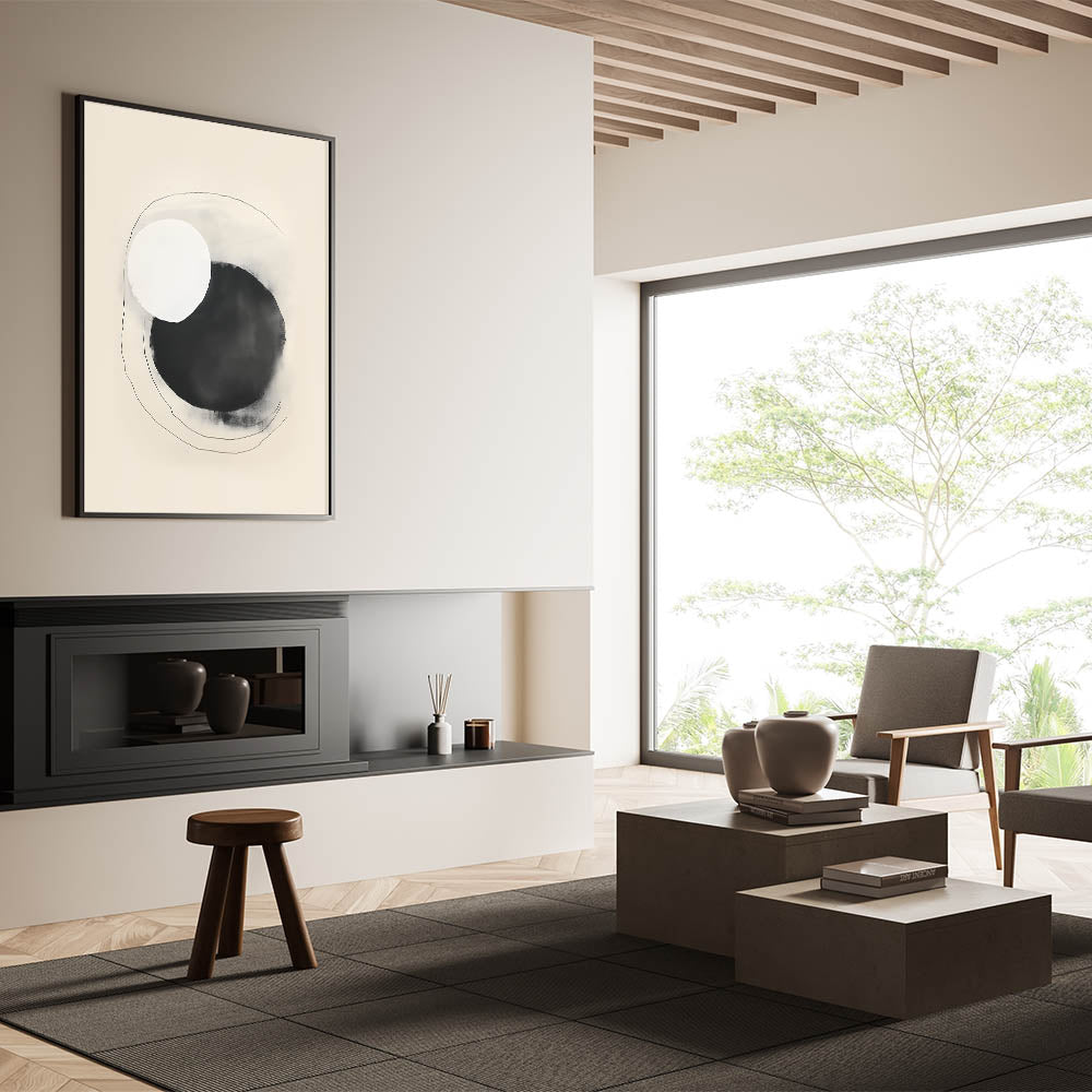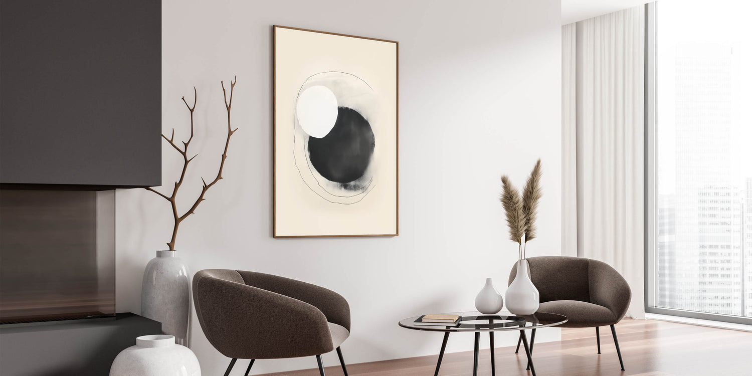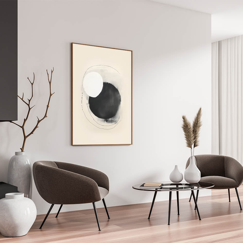 Add an artistic focal point to your decor with this minimalist circle art. This design features overlapping black and white circles with delicate, hand-drawn lines, creating a harmonious contrast that embodies modern simplicity. Its soft beige background and fluid shapes make it a versatile piece for contemporary spaces seeking understated elegance.