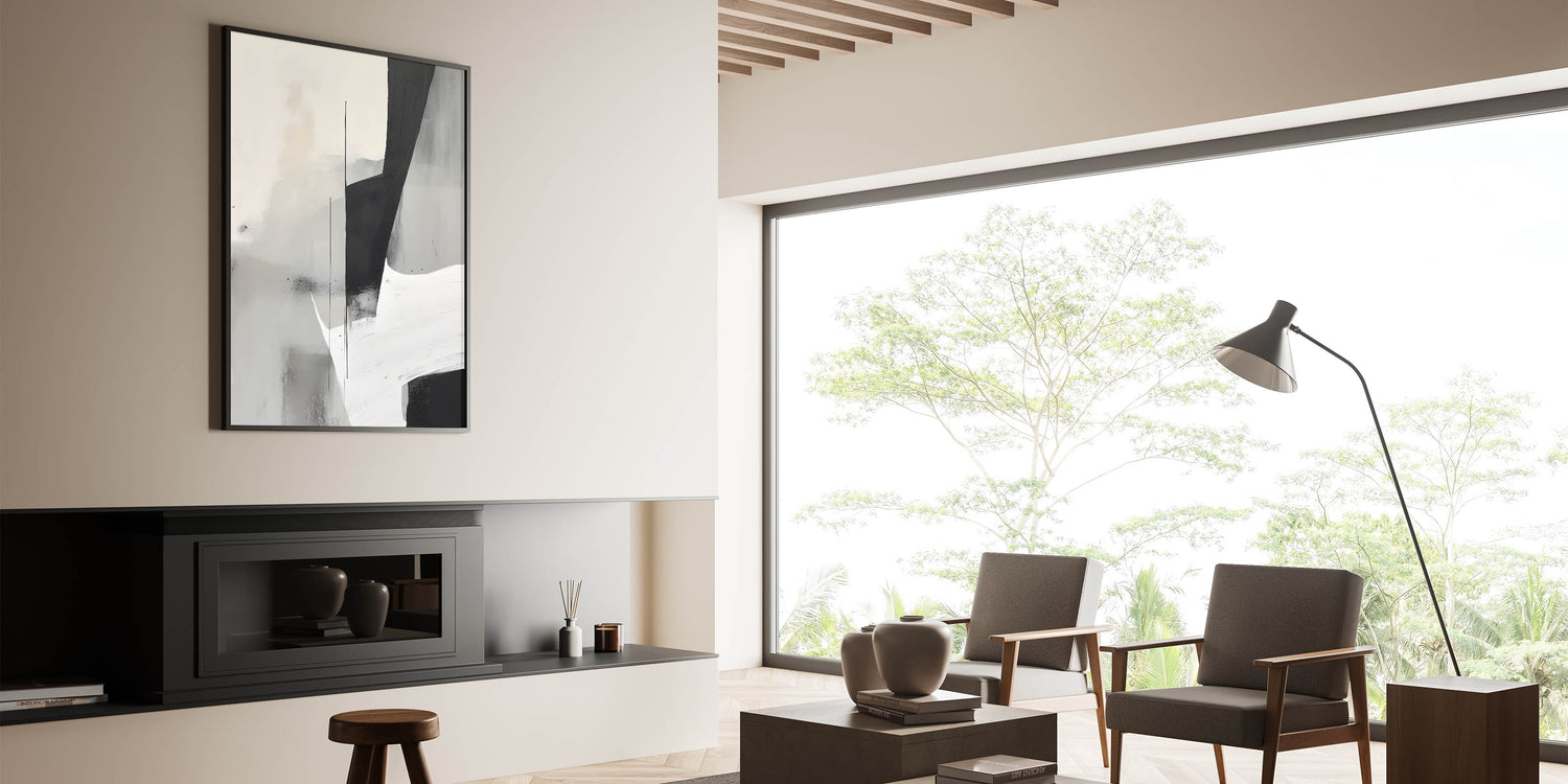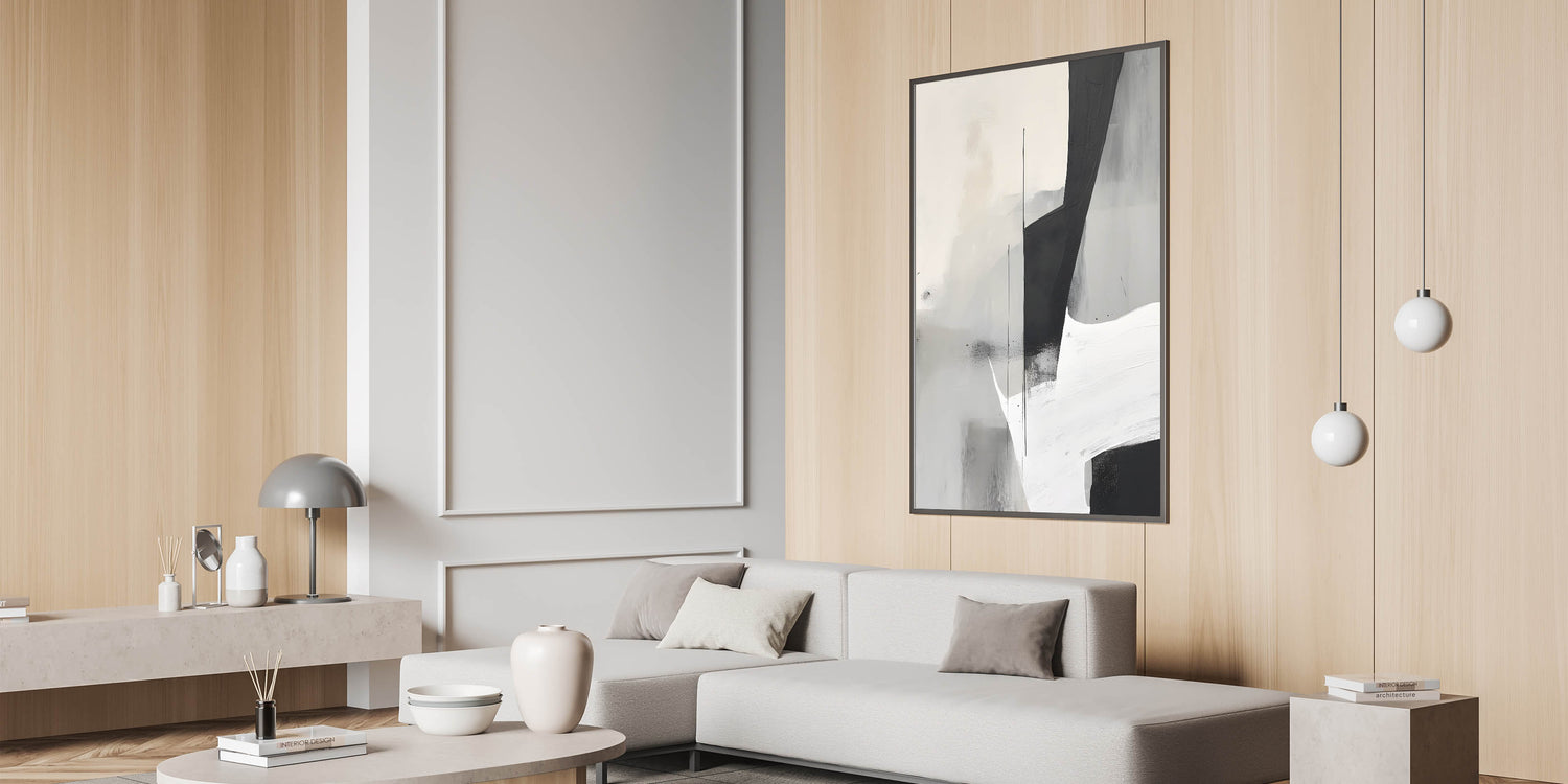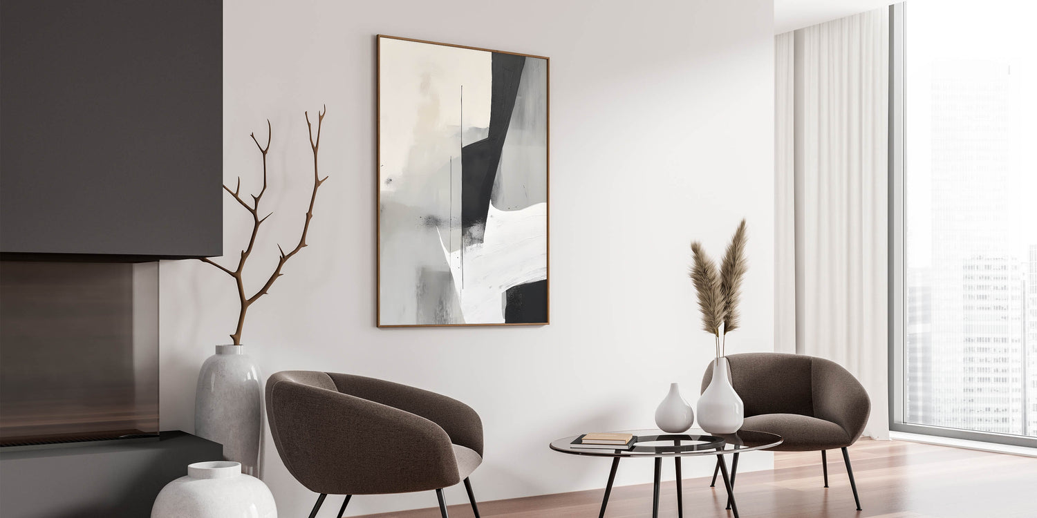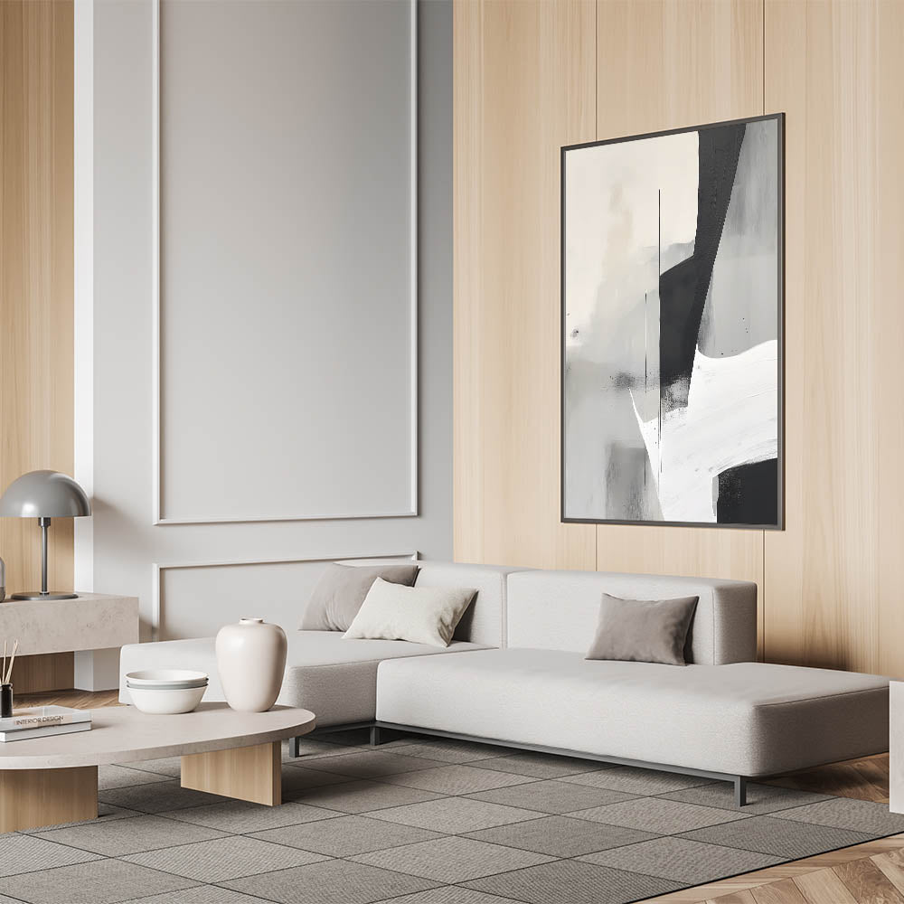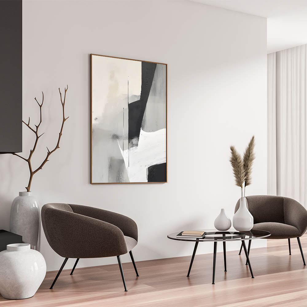 Introduce a touch of modern sophistication with this black and white minimalist abstract art. This striking piece features bold geometric shapes in deep black, soft grays, and crisp white, creating a captivating contrast that embodies simplicity and elegance. Its subtle texture and balanced composition make it a versatile addition to contemporary interiors, perfect for adding a refined, artistic touch to your decor.
