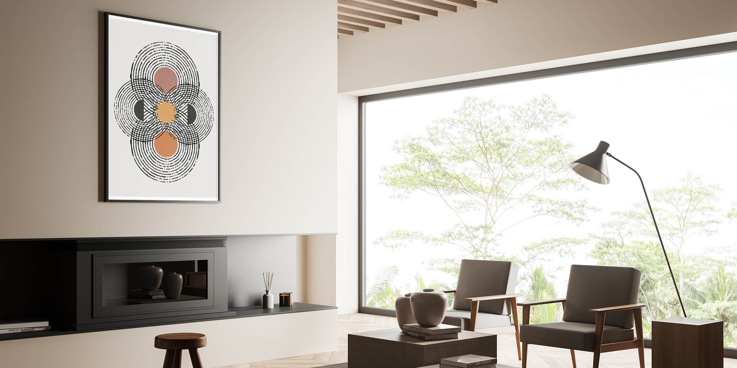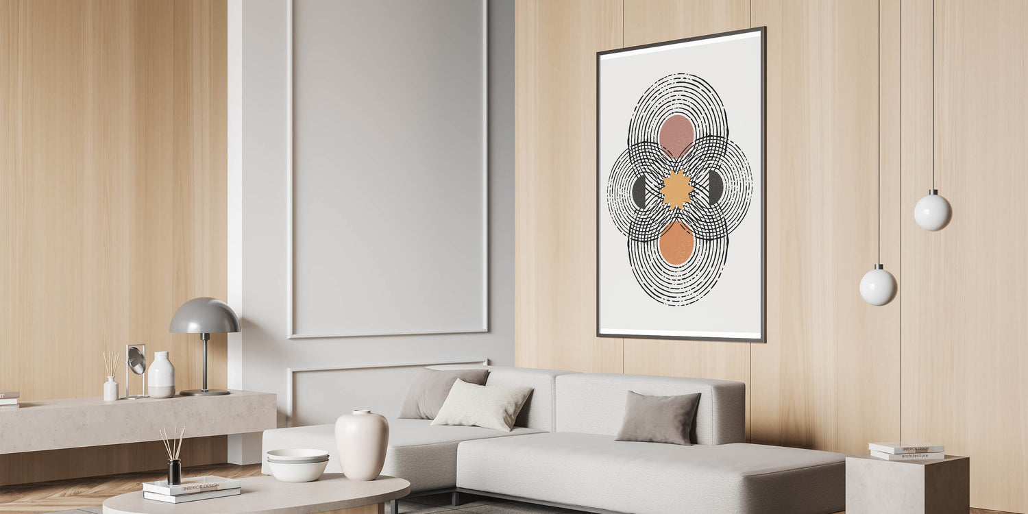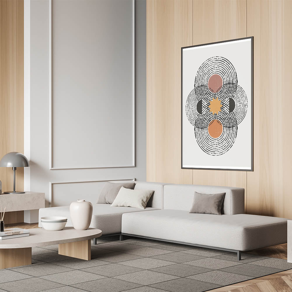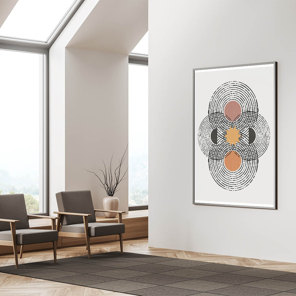 Transform your space with this captivating piece of contemporary minimalist art, featuring an intricate geometric design with overlapping circles and a central sunburst. The artwork employs a warm color palette, including earthy tones of brown, orange, and black, against a soft, off-white background. This design is perfect for modern interiors that embrace the minimalist aesthetic while adding a touch of dynamic energy.