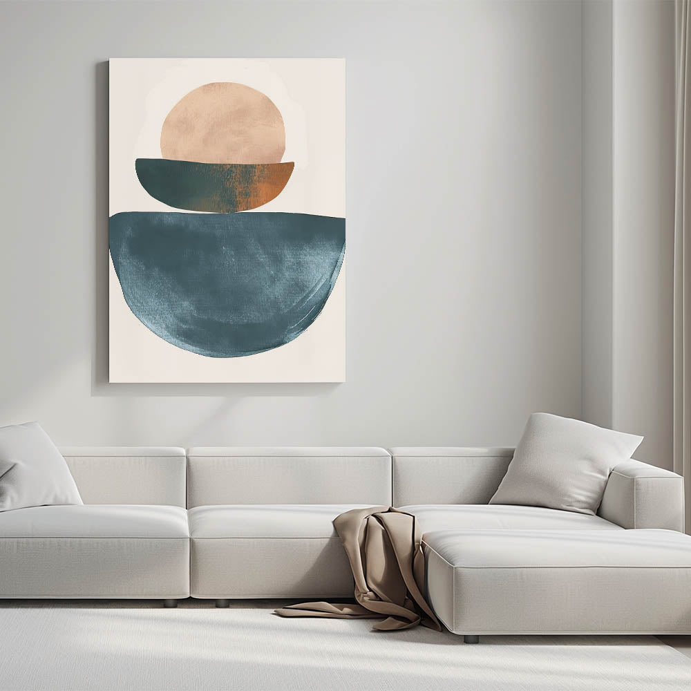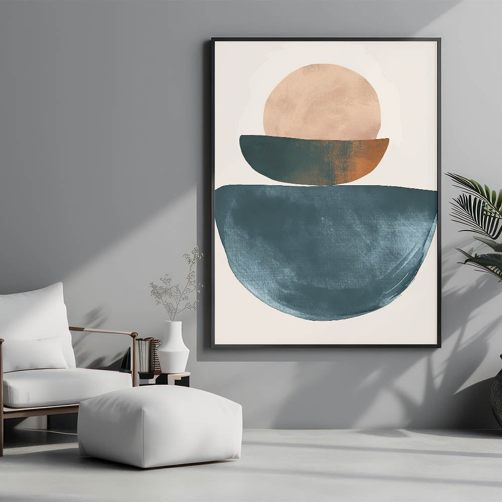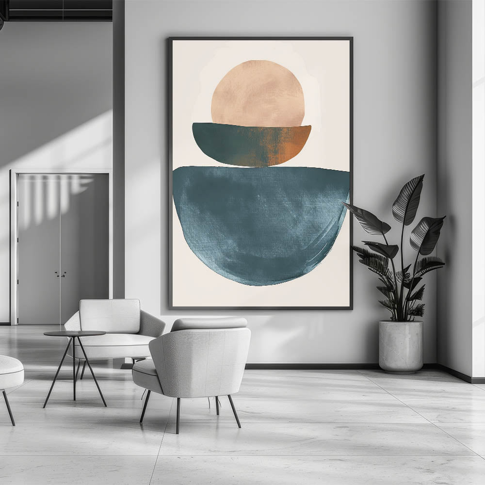 Add harmony and modern elegance to your space with this geometric minimalist abstract wall art. Featuring stacked abstract shapes in deep teal, soft beige, and a touch of warm burnt orange, the composition is both grounded and visually striking. This artwork is ideal for lovers of modern geometric wall decor who appreciate balance, form, and natural hues.