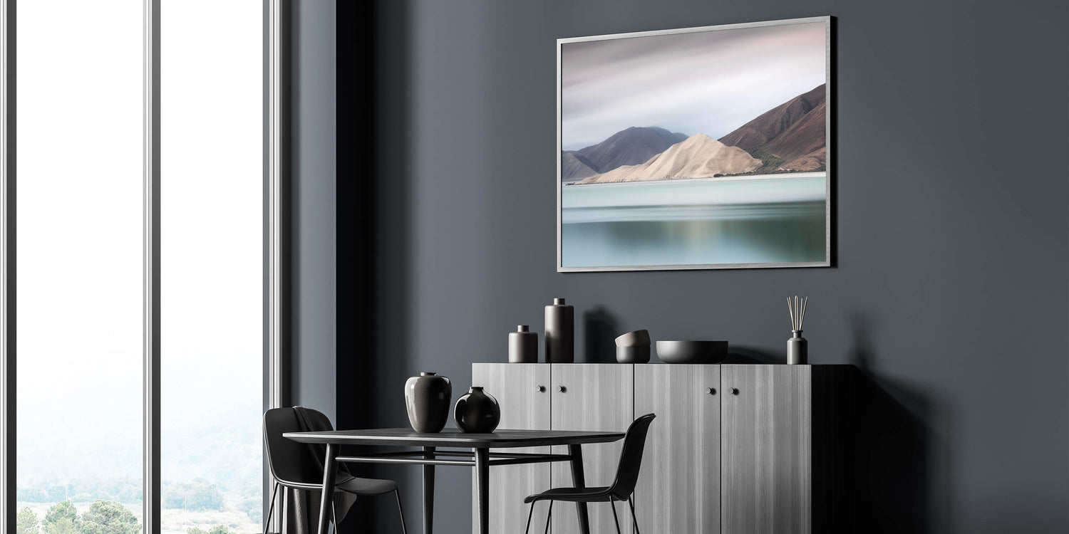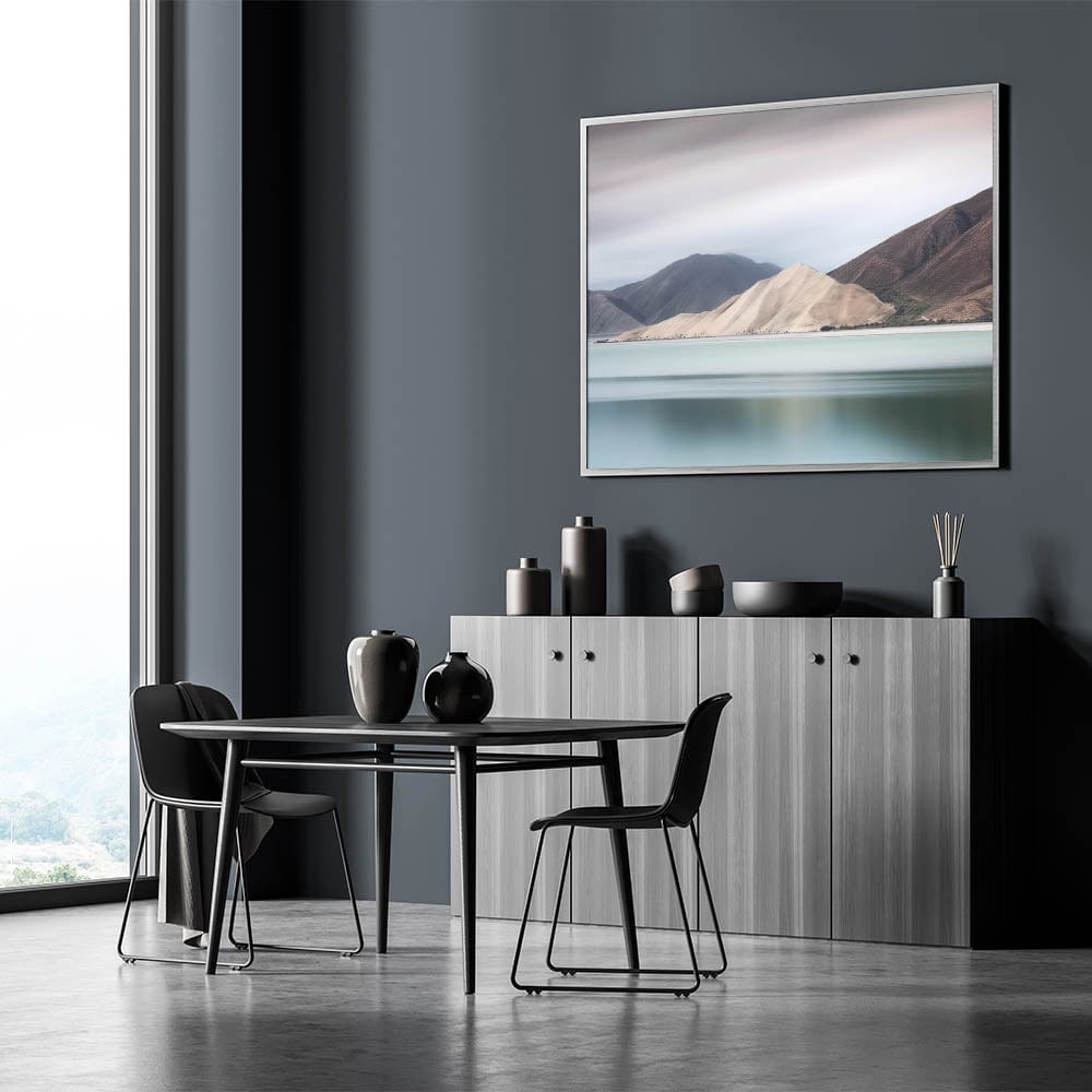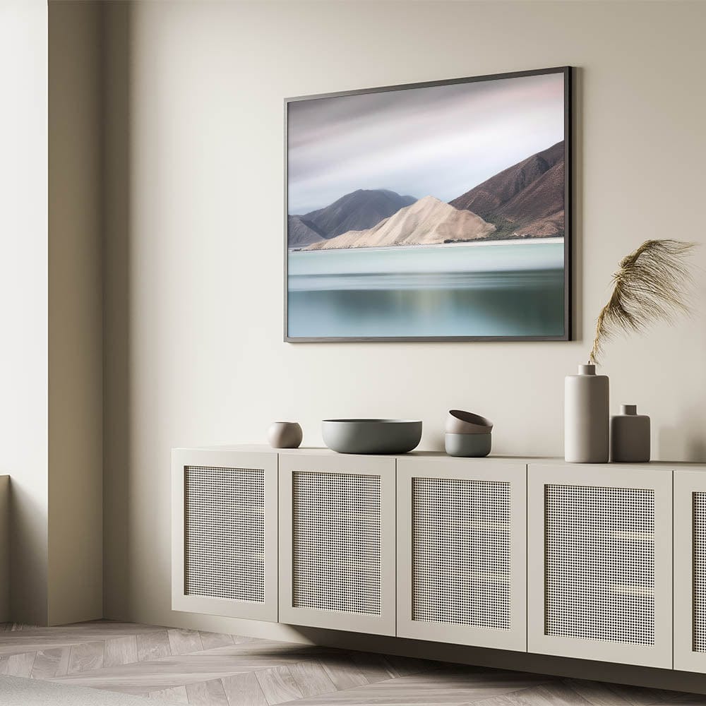 Immerse yourself in the calm beauty of nature with this fine art photography canvas print. Featuring vast sand dunes set against majestic mountains and a glassy body of water, this image exudes a sense of stillness and harmony. The muted earth tones and soft sky hues create a soothing, elegant aesthetic, perfect for modern interiors.