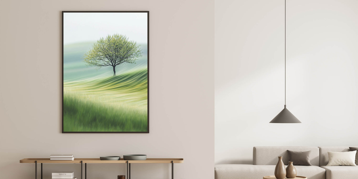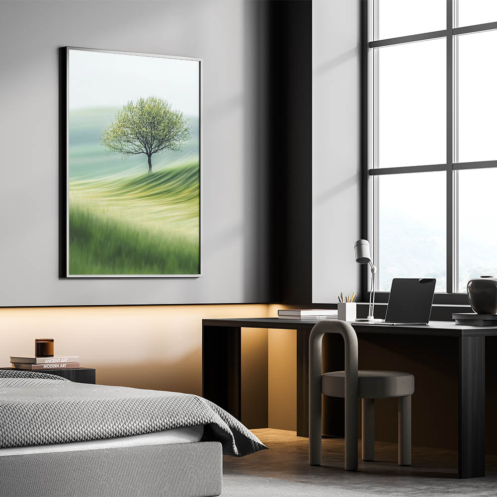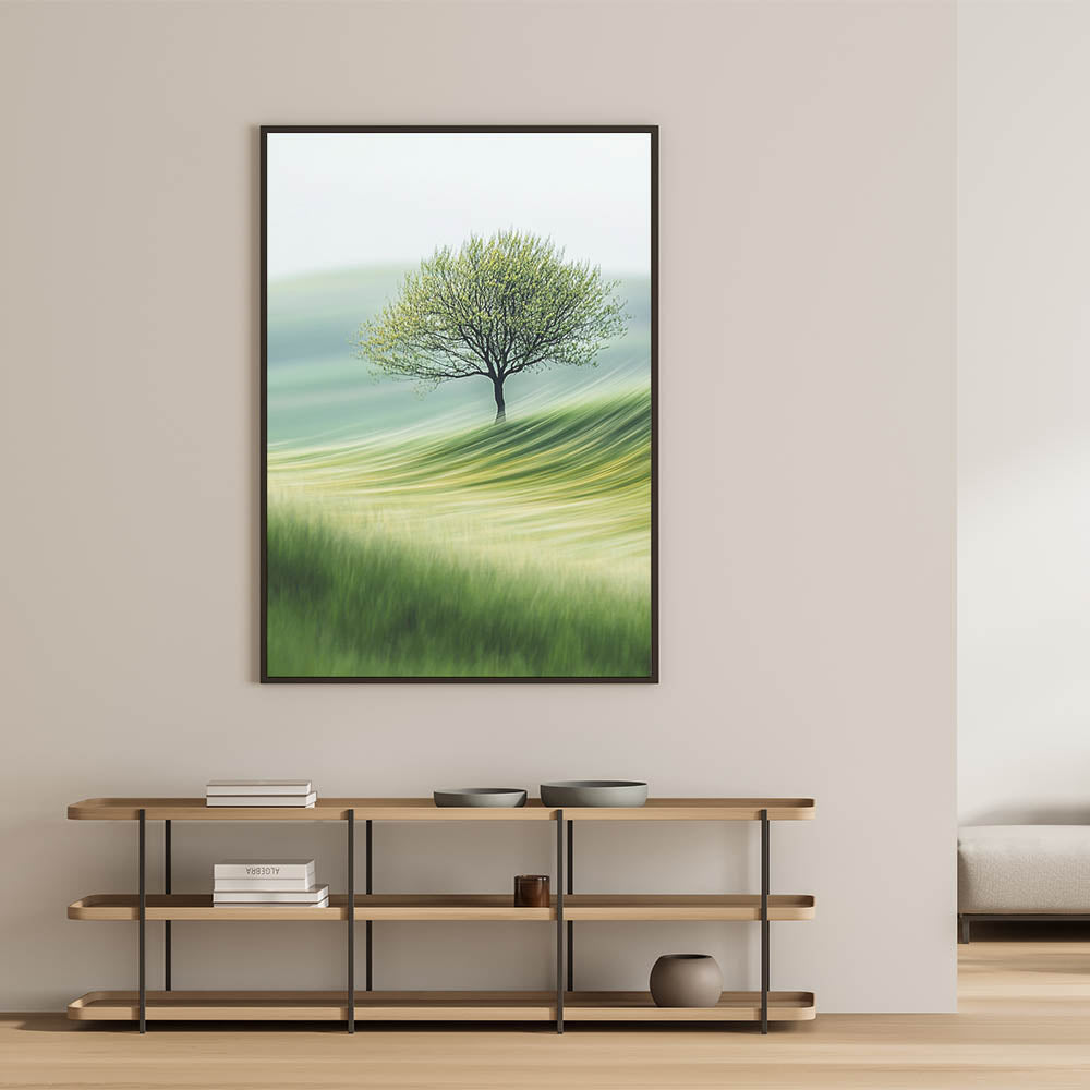 Immerse yourself in nature’s tranquility with this exquisite fine art photography print. A lone tree stands gracefully amidst rolling green hills, enveloped in a soft motion blur effect that enhances the sense of movement and serenity.