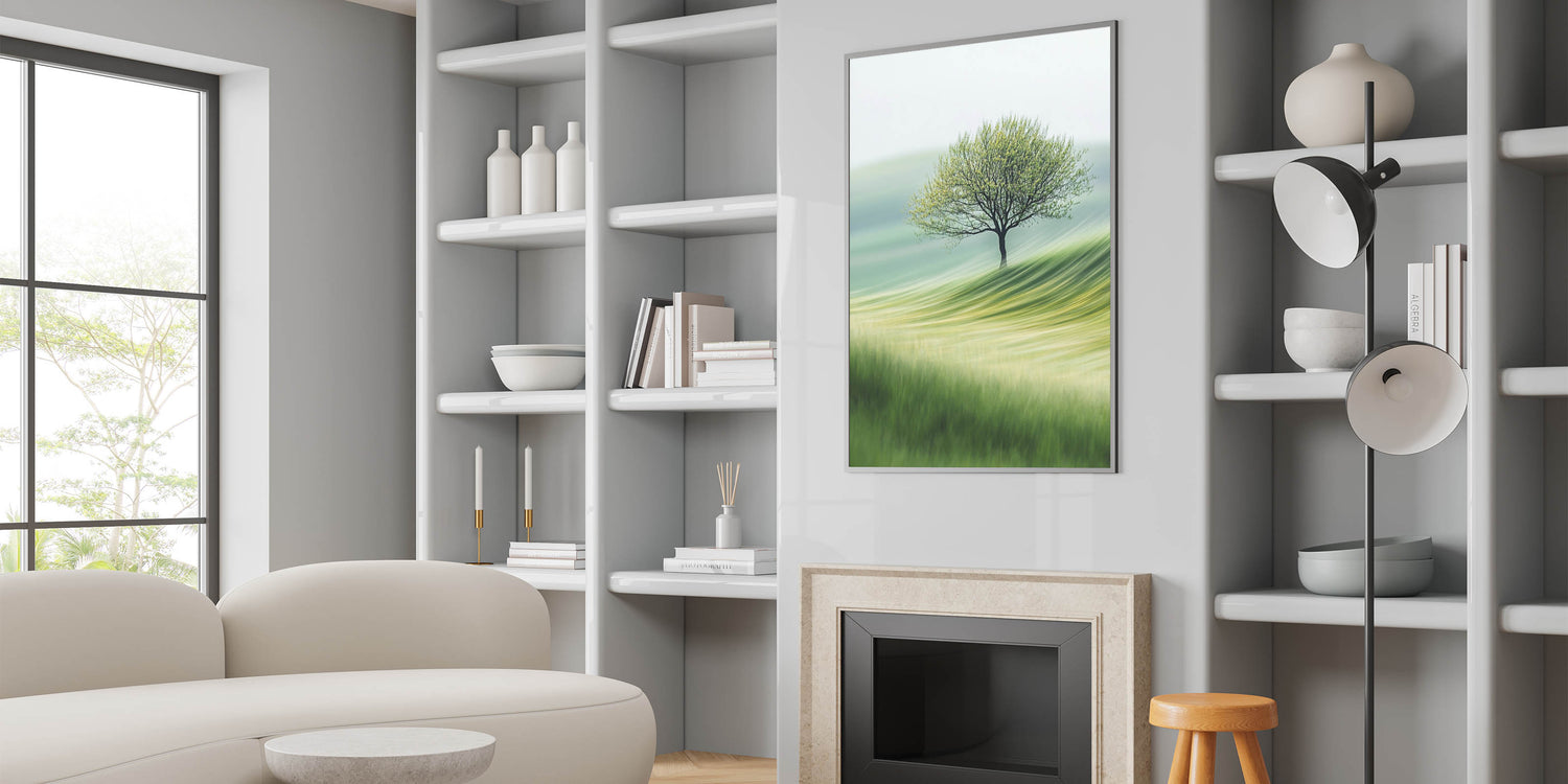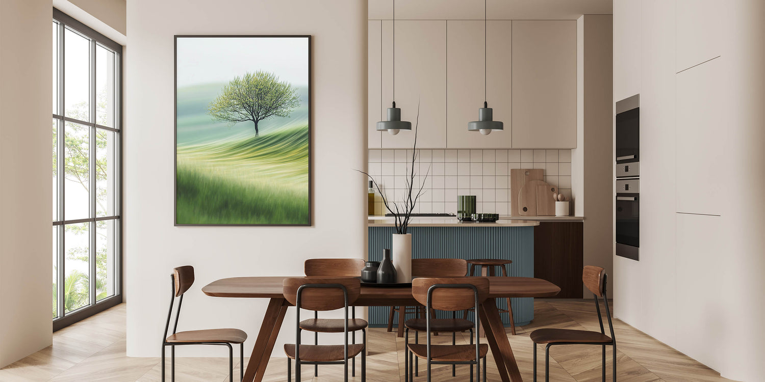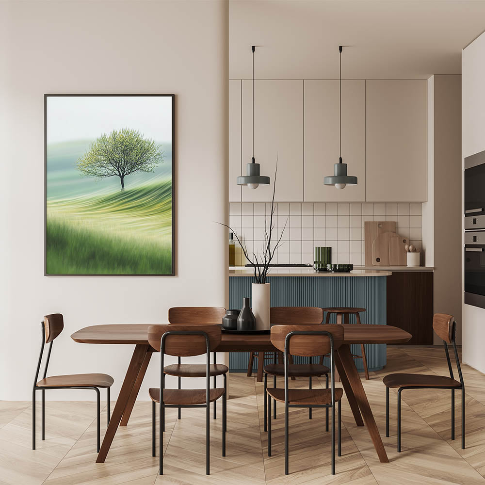 Immerse yourself in nature’s tranquility with this exquisite fine art photography print. A lone tree stands gracefully amidst rolling green hills, enveloped in a soft motion blur effect that enhances the sense of movement and serenity.