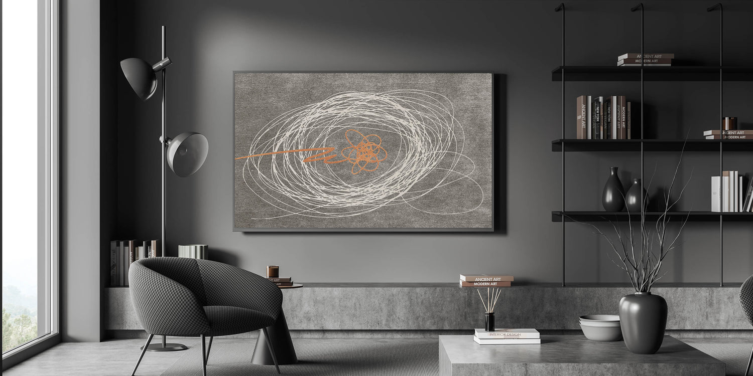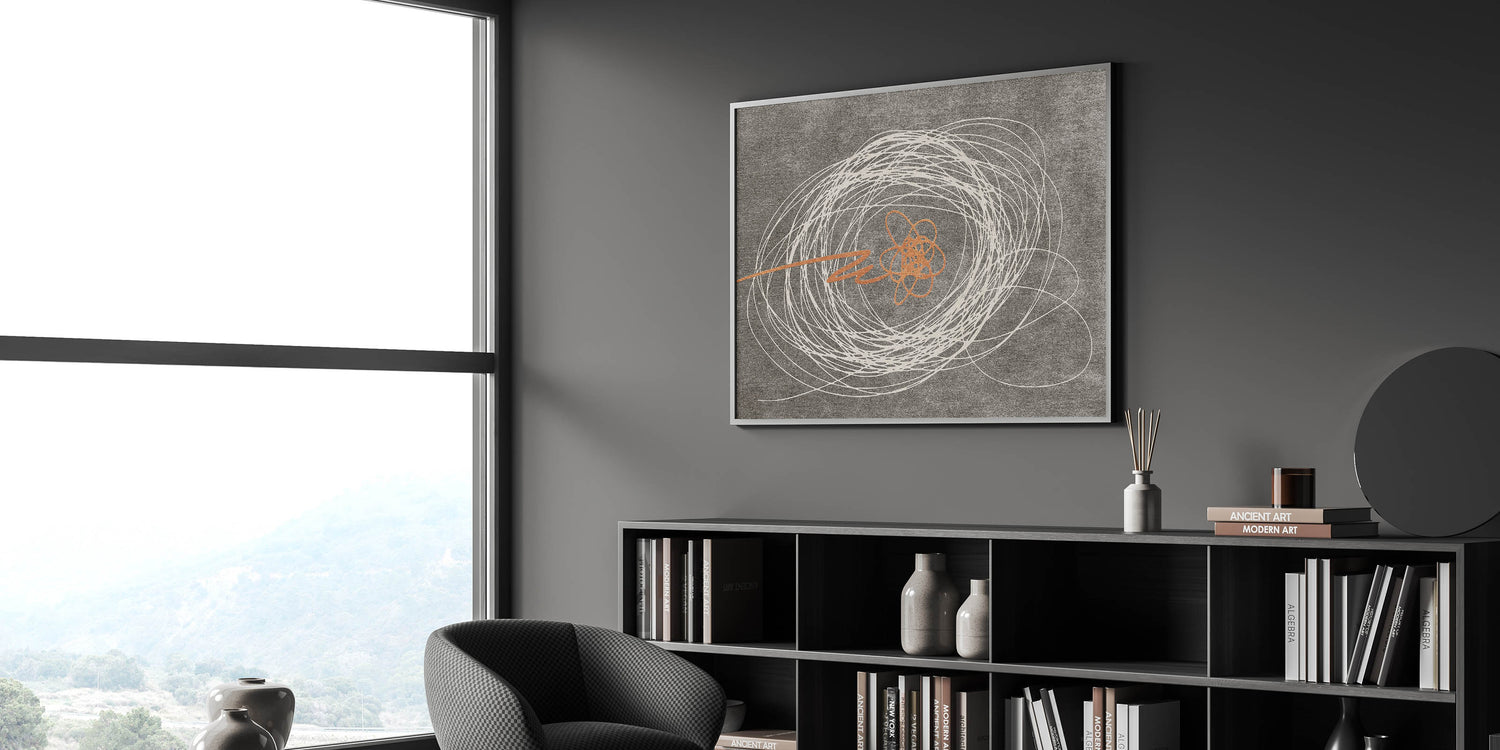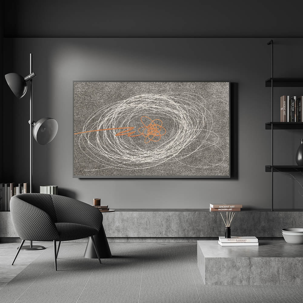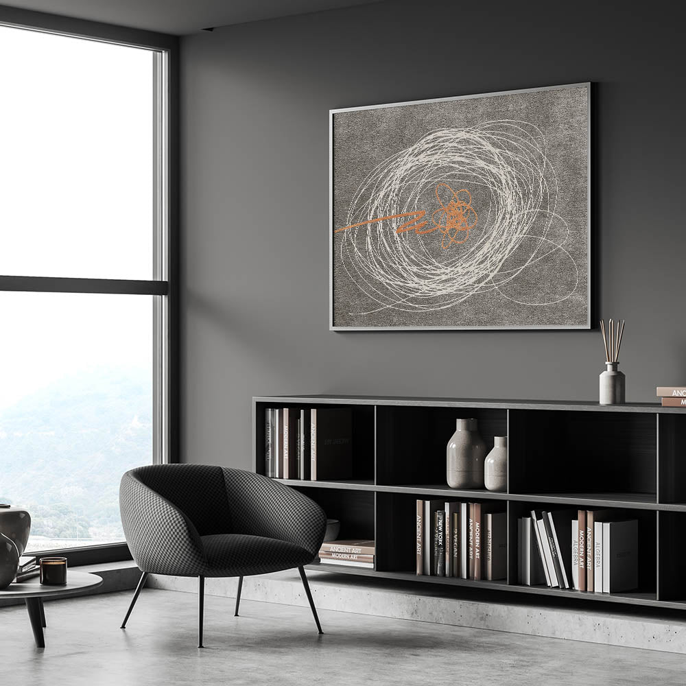 Add energy and creativity to your space with this Dynamic Abstract Line Art piece, featuring a mesmerizing pattern of swirling lines accented with a bold splash of orange. Set against a textured dark gray background, the white and orange lines create a sense of movement and depth, making this artwork an ideal choice for modern and industrial interiors. This piece brings a playful yet sophisticated element to any room, perfect for those who appreciate contemporary design.
