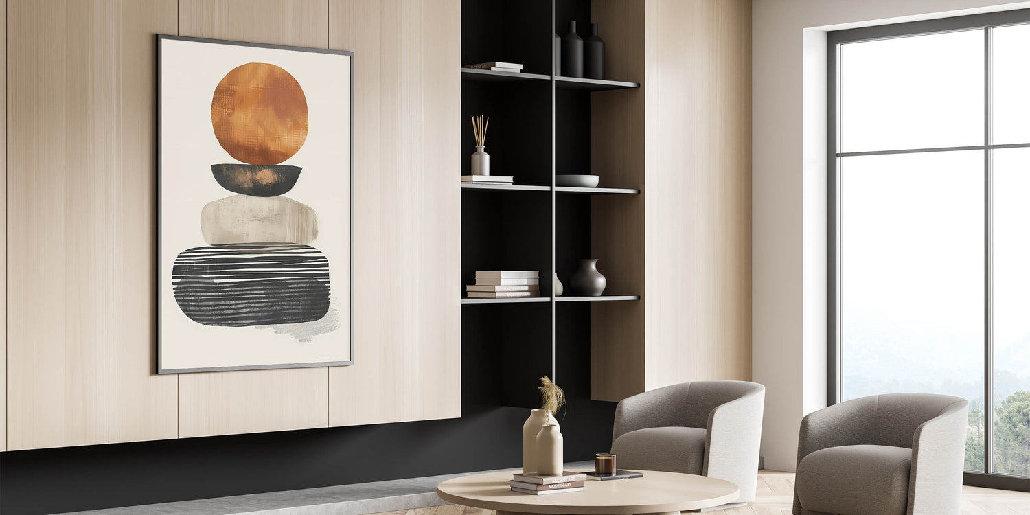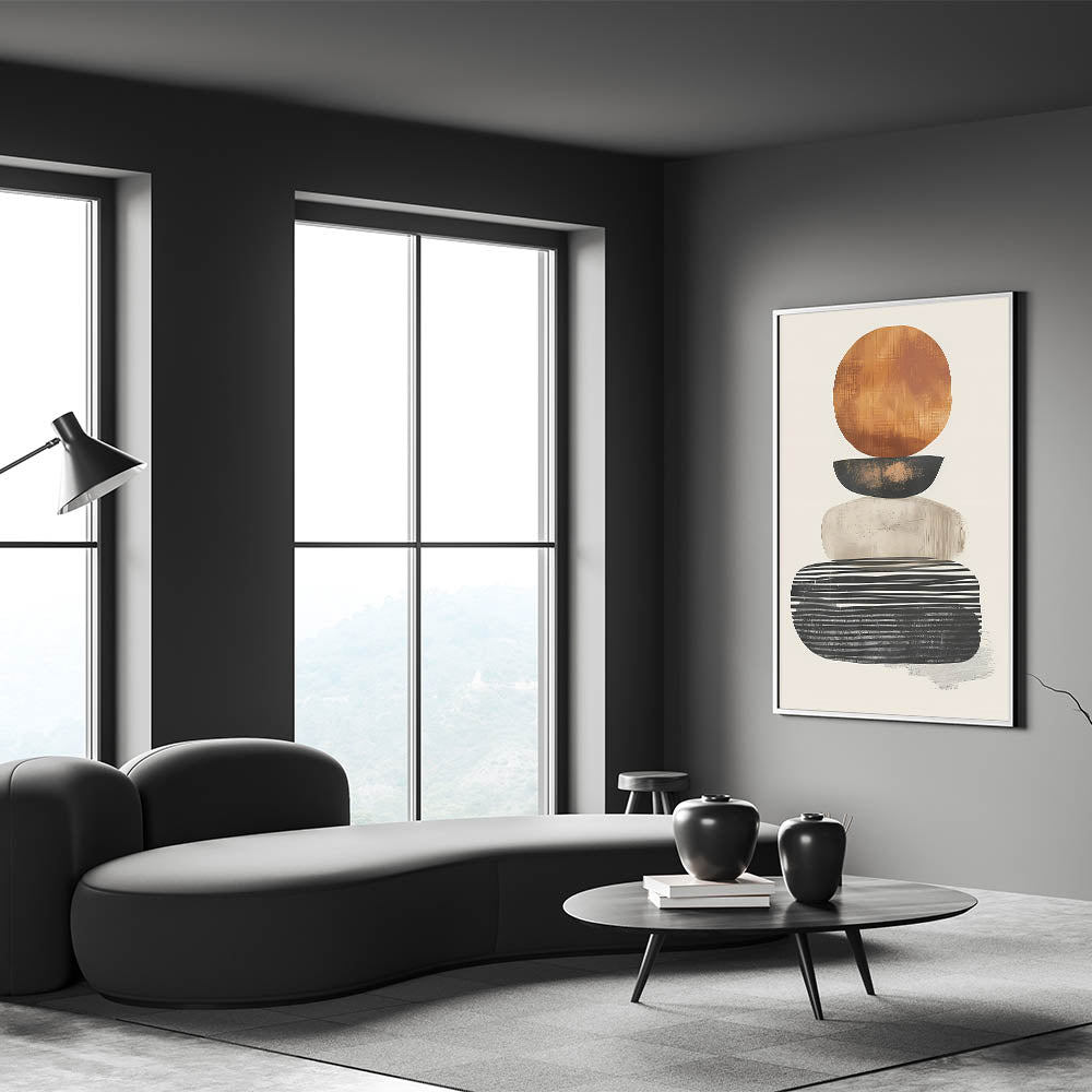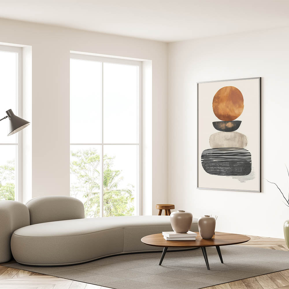 Infuse warmth and harmony into your space with this modern minimalist art piece, featuring stacked geometric shapes in earthy tones. The soothing blend of warm beige, black, and burnt orange creates a balanced and natural aesthetic, perfect for contemporary and bohemian interiors. Available in various formats, including stretched canvas, acrylic glass, and framed prints, this artwork is ideal for those who love organic simplicity.