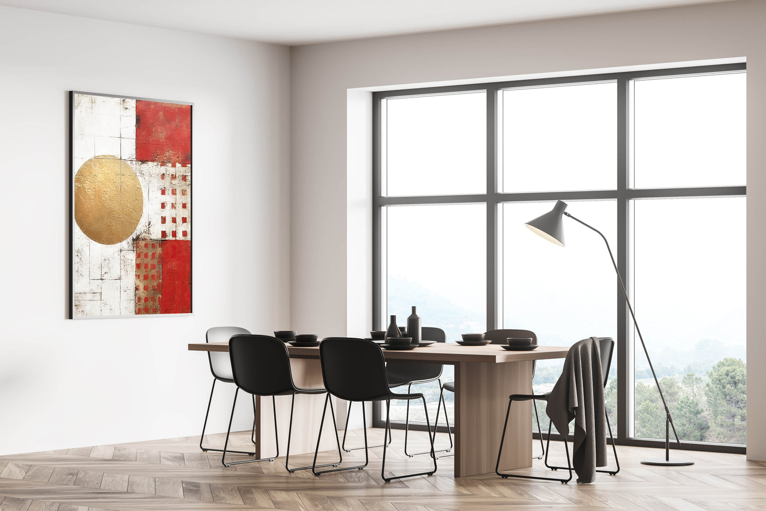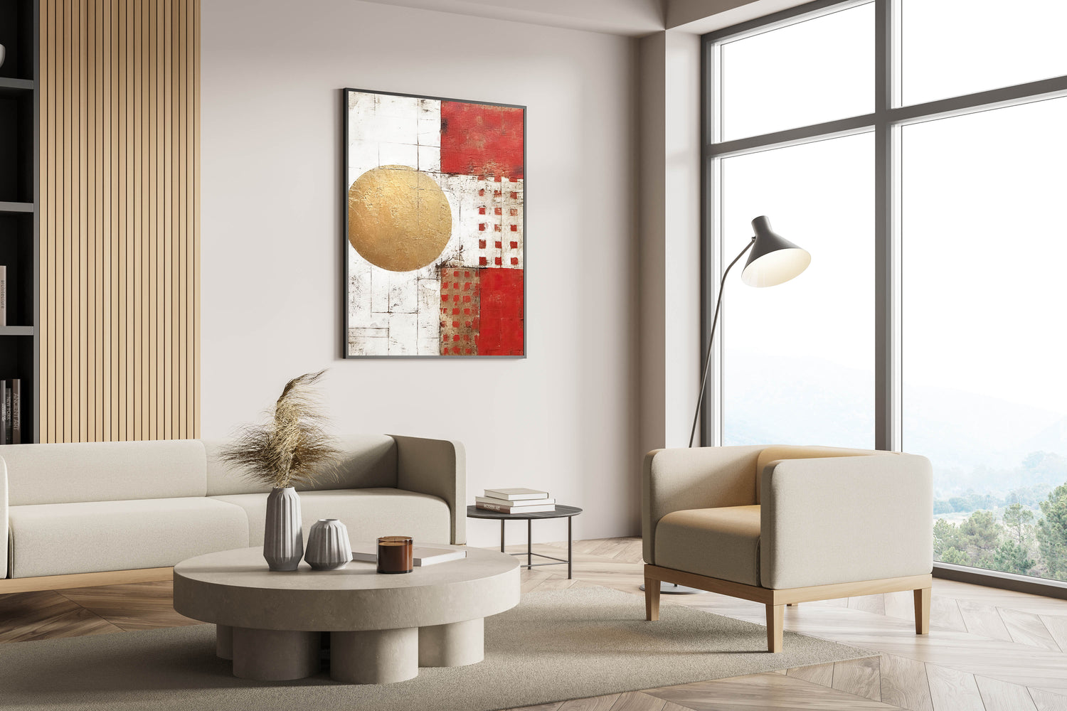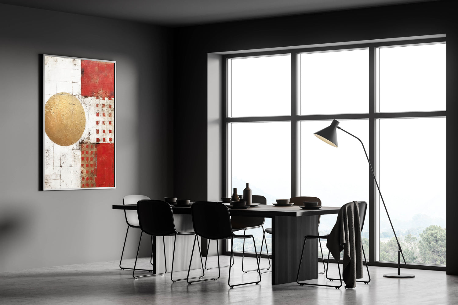 Elevate your decor with the bold sophistication of this Elegant Rose Abstract Strokes Art. Featuring a stunning mix of rich red, gold, and white hues, this piece combines modern geometric patterns with a touch of timeless elegance. The textured gold circle adds a luxurious focal point, while the red and white blocks create balance and depth. Ideal for contemporary and eclectic interiors, this artwork infuses any space with warmth and refinement.