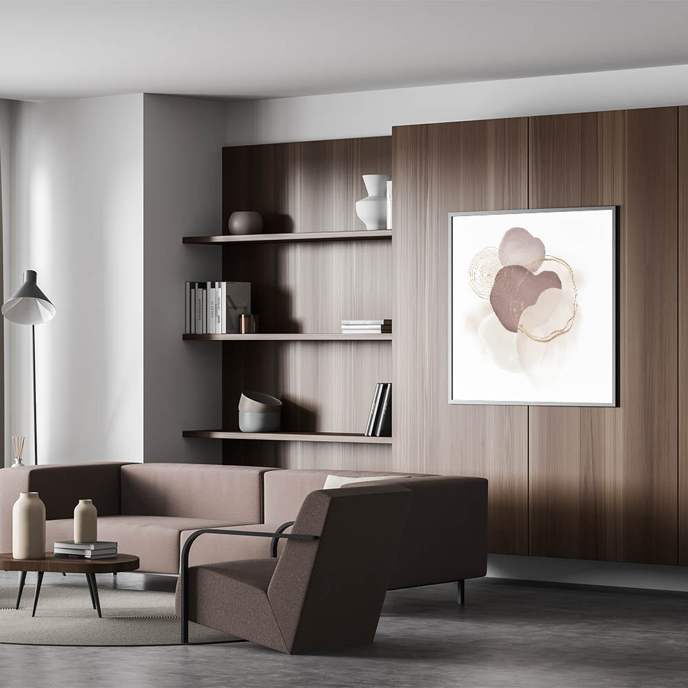 Elevate your space with this high-quality geometric minimalist abstract wall art, designed to add elegance and serenity to modern interiors. This sophisticated design showcases soft neutral tones of beige and brown, intertwined with delicate gold linework, creating a calming and balanced composition. Its modern and contemporary geometric design makes it a stunning centerpiece for both homes and offices.