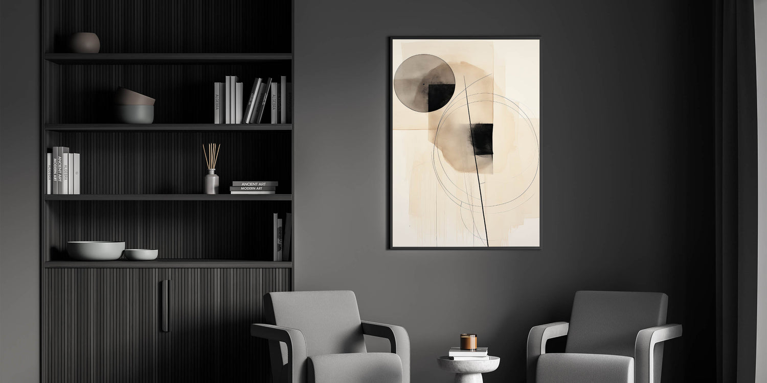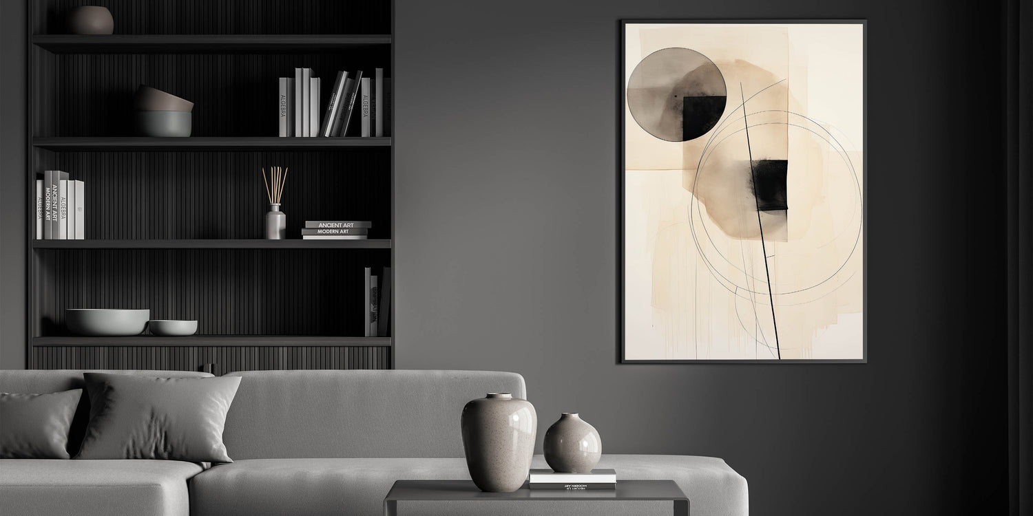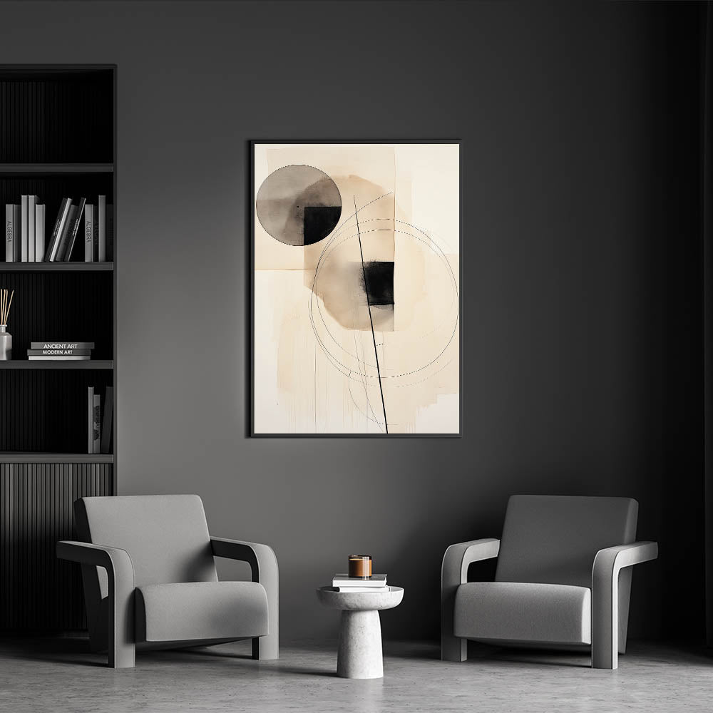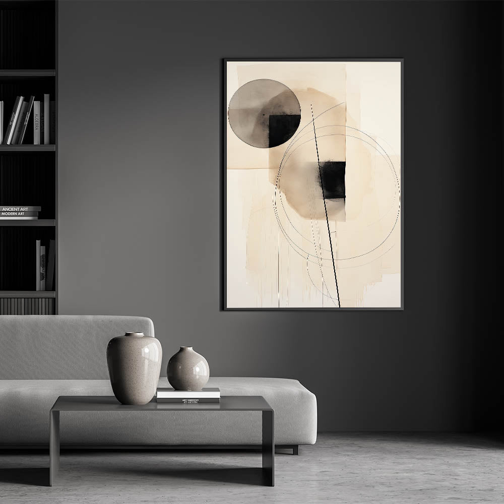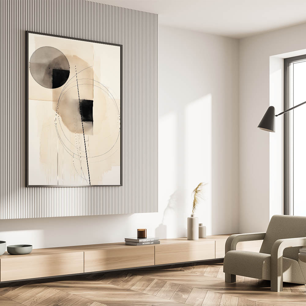 Enhance your space with this stunning geometric minimalist wall art, featuring abstract circles and linear elements in soft neutral tones. The balanced combination of shapes and lines creates a harmonious and modern design, perfect for contemporary interiors. With its sleek and sophisticated aesthetic, this artwork adds a stylish touch to living rooms, bedrooms, or office spaces, offering a sense of tranquility and structure.
