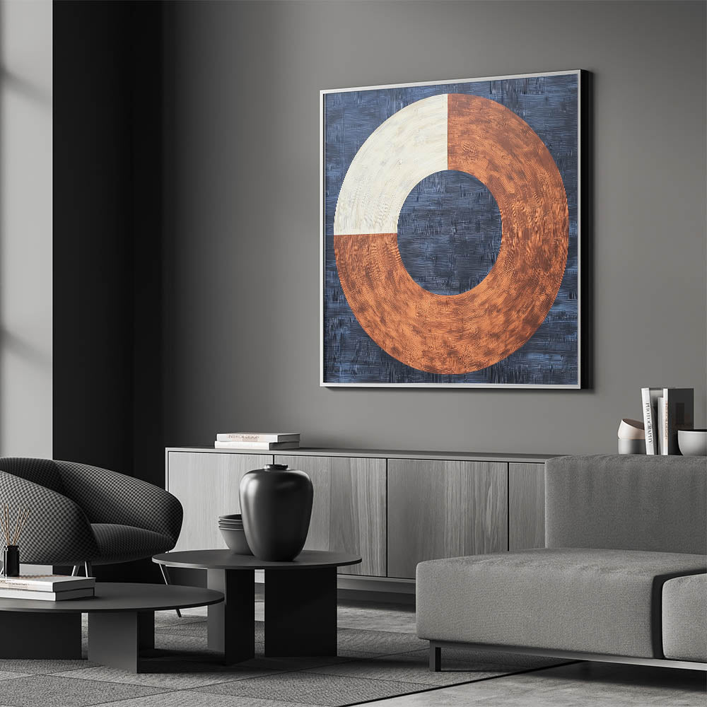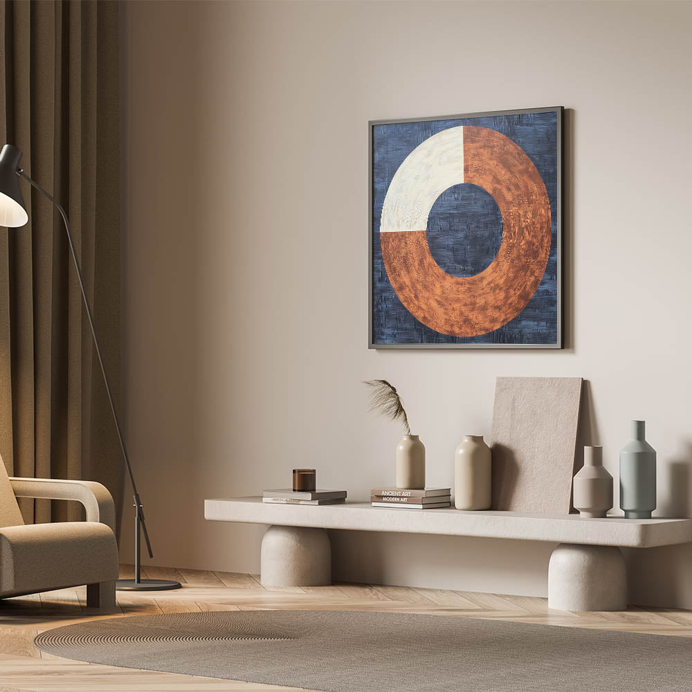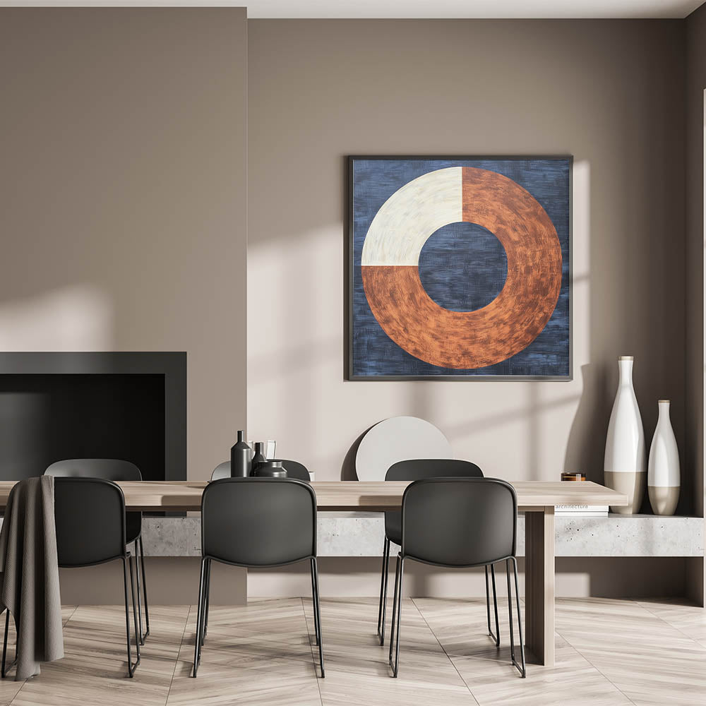 Elevate your home with this Geometric Wall Art, showcasing a bold circular design with a warm bronze and soft cream palette against a textured navy backdrop. This captivating piece combines clean geometric shapes with rich, contrasting tones, making it an ideal choice for modern and minimalist interiors.