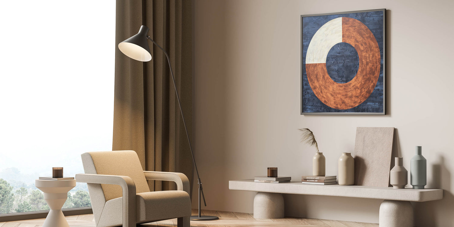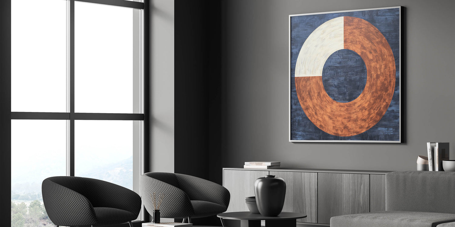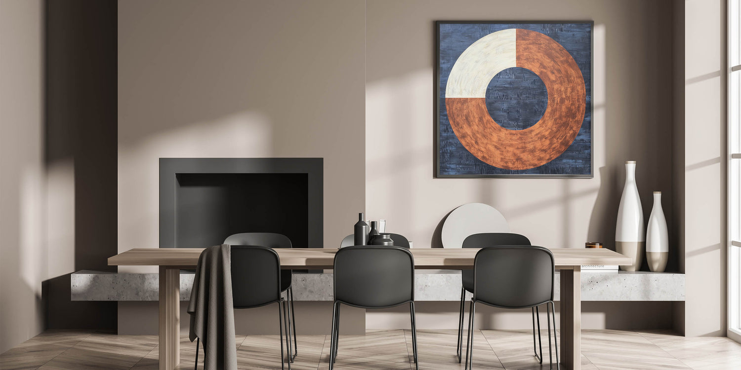 Elevate your home with this Geometric Wall Art, showcasing a bold circular design with a warm bronze and soft cream palette against a textured navy backdrop. This captivating piece combines clean geometric shapes with rich, contrasting tones, making it an ideal choice for modern and minimalist interiors.