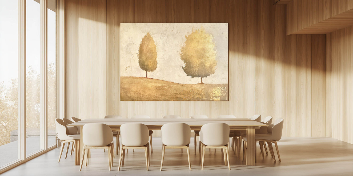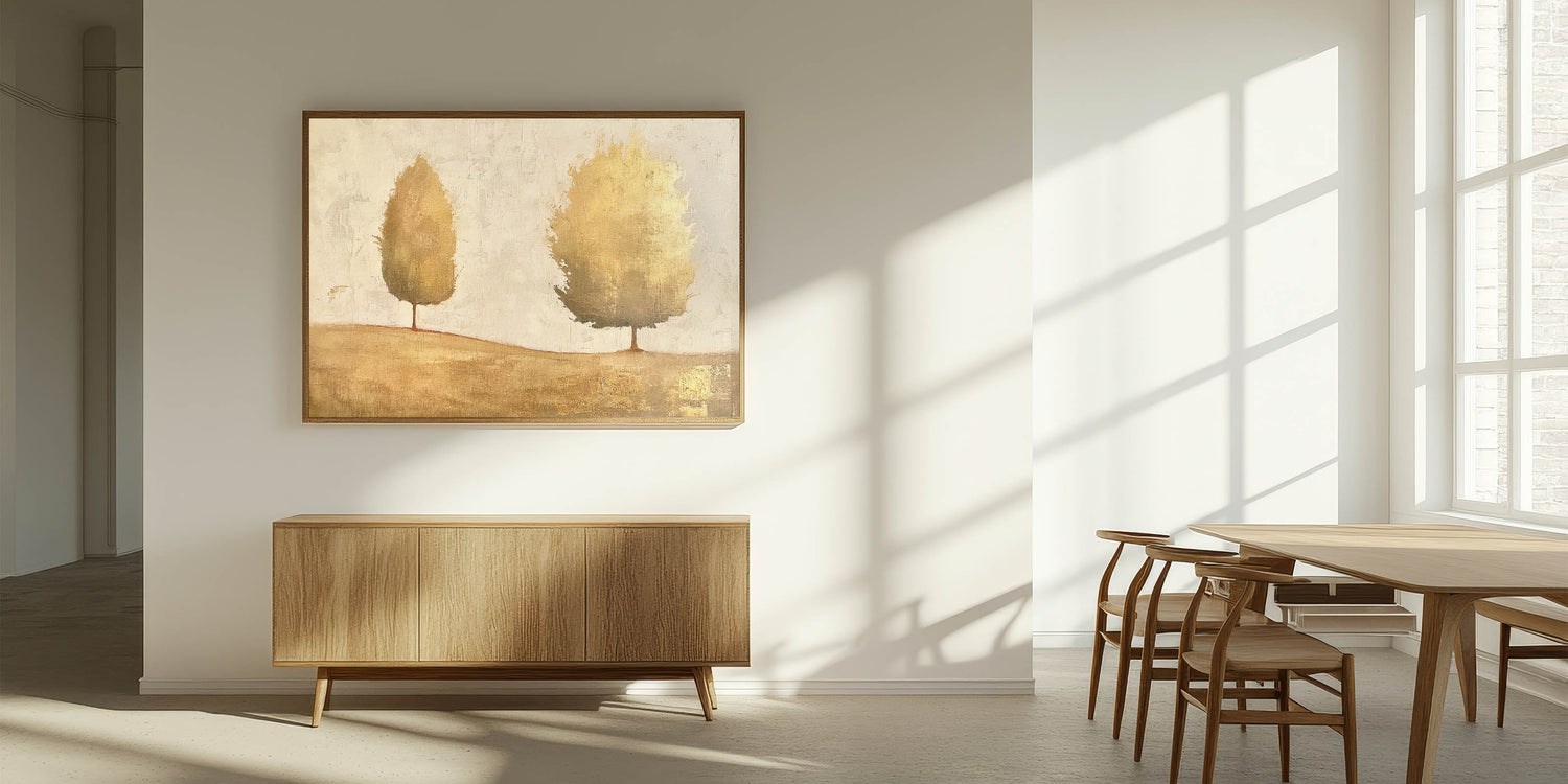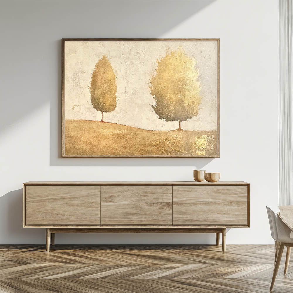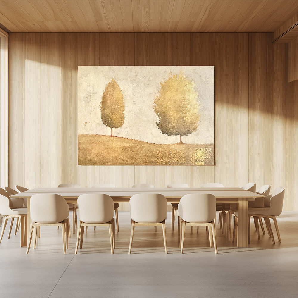Enhance your decor with this elegant abstract landscape featuring golden-hued trees against a soft, neutral background. This minimalist design exudes warmth and sophistication, making it a versatile choice for any modern or classic interior. The earthy tones and metallic accents create a serene yet luxurious vibe, ideal for adding depth and elegance to your space.