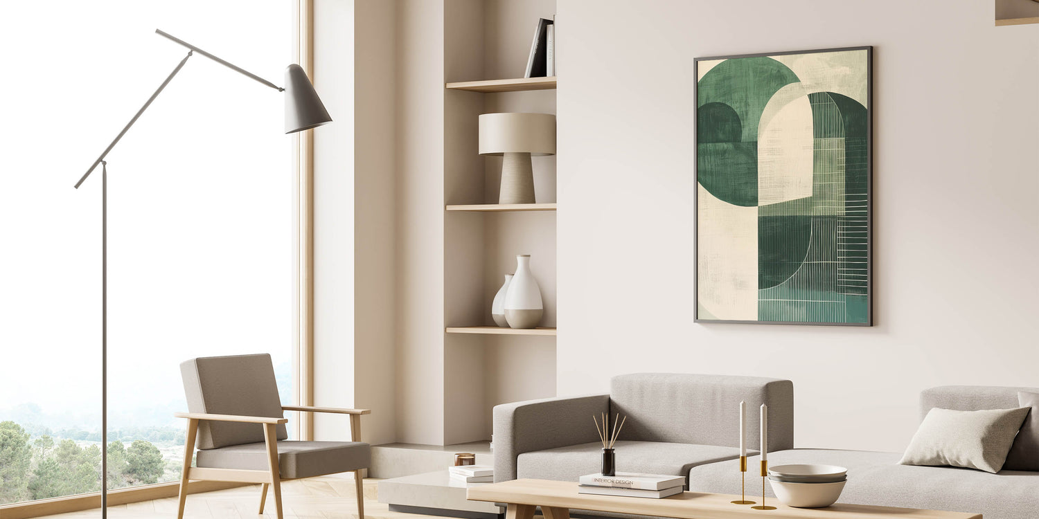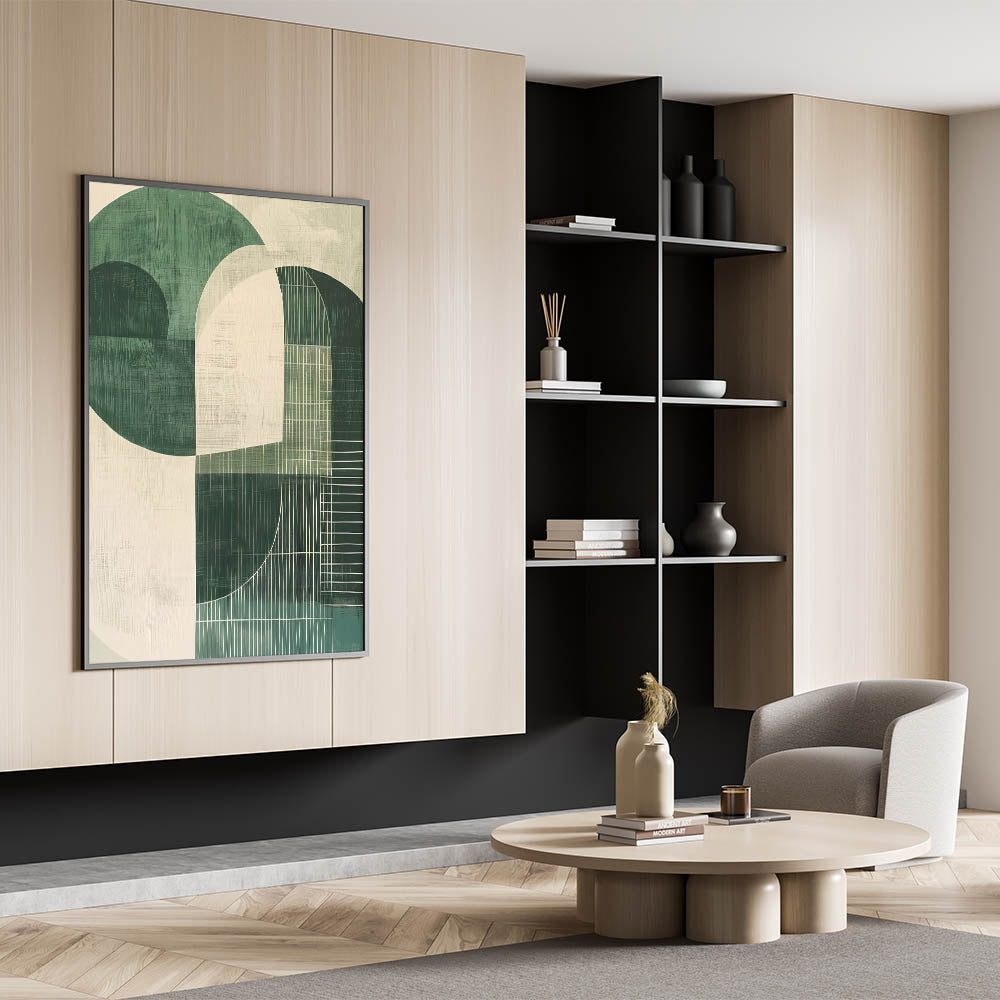 This artwork’s combination of bold shapes and calming green tones makes it a versatile addition, offering sophistication and style to your decor.