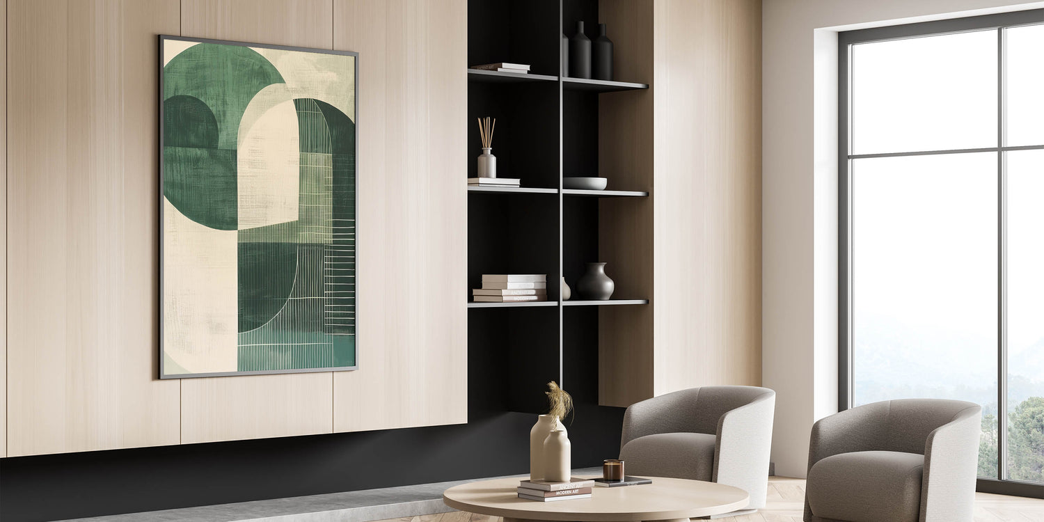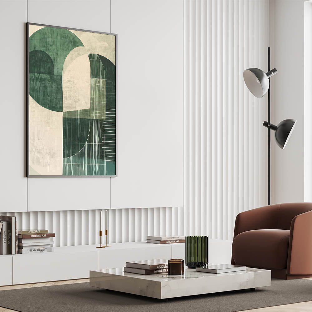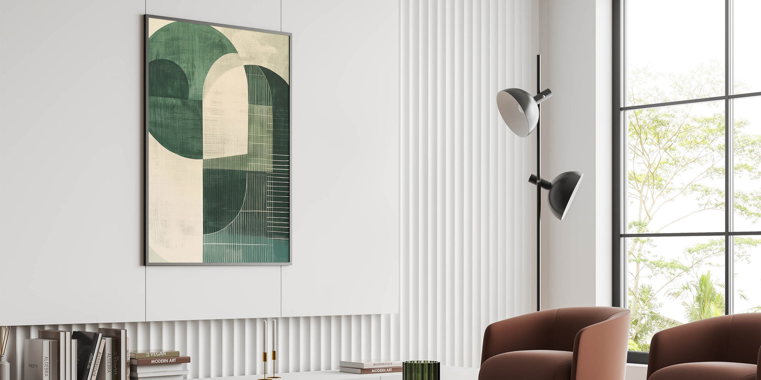 - High-quality minimalist canvas print with bold green tones and geometric forms