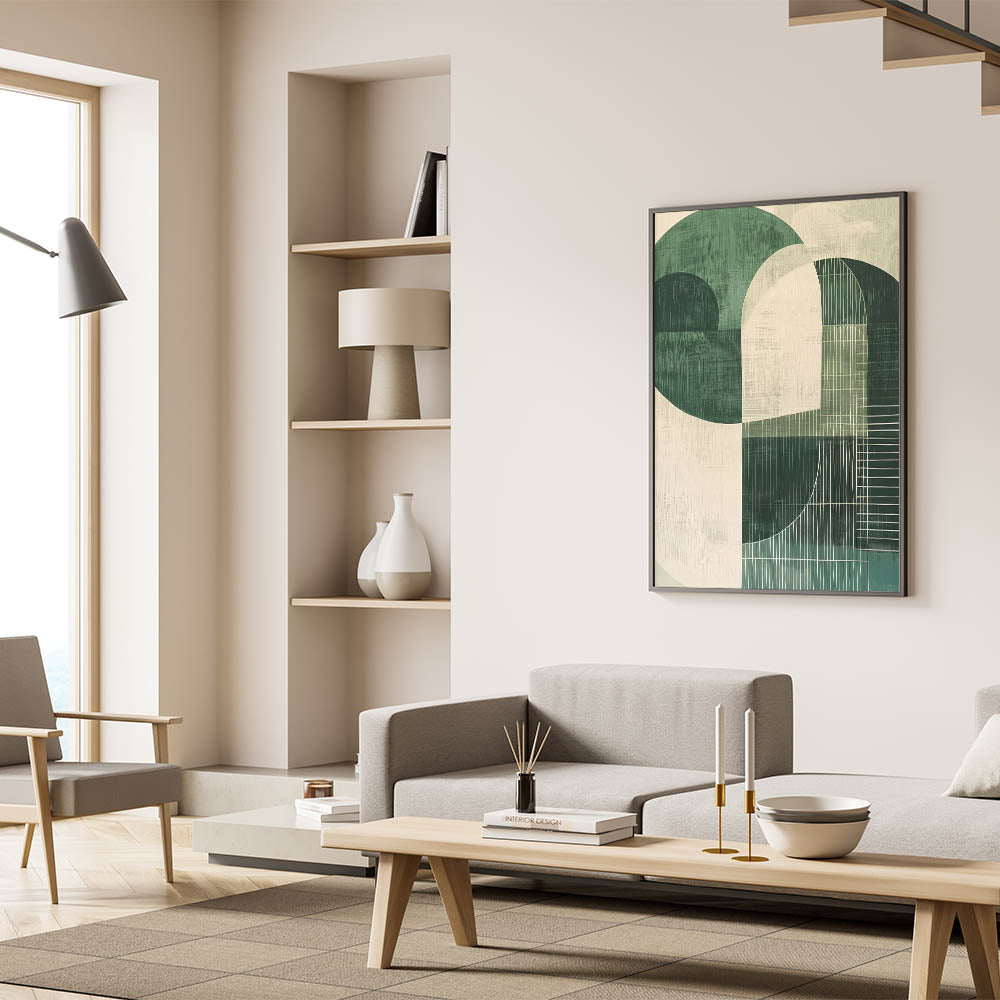 Add a touch of modern elegance to your space with this Green Geometric Abstract Art. Featuring intersecting curved and linear shapes in rich shades of green and off-white, this artwork brings a sense of structure and depth. The minimalist design and earthy tones make it an ideal piece for contemporary, Scandinavian, and industrial interiors, adding a fresh yet refined aesthetic to any room.