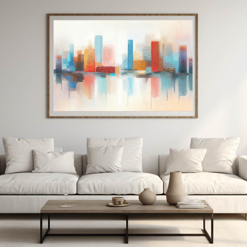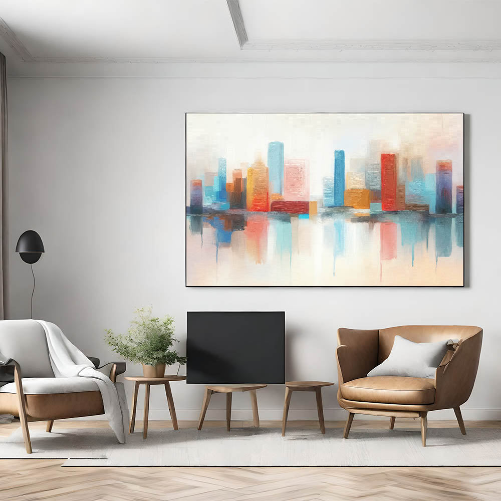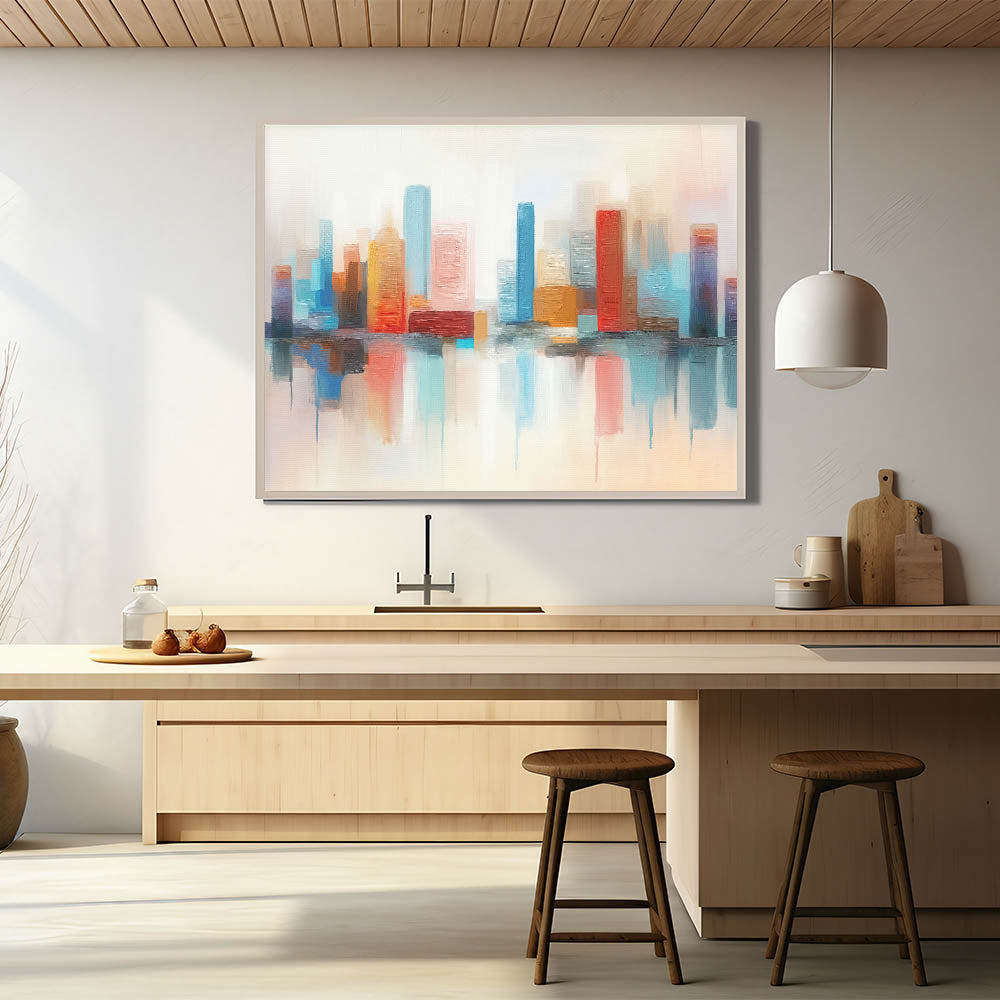 Add a vibrant touch to your living space with this colorful abstract cityscape art, featuring a blend of bold and soft tones that depict a modern skyline. This piece is perfect for those who appreciate contemporary and minimalist decor.