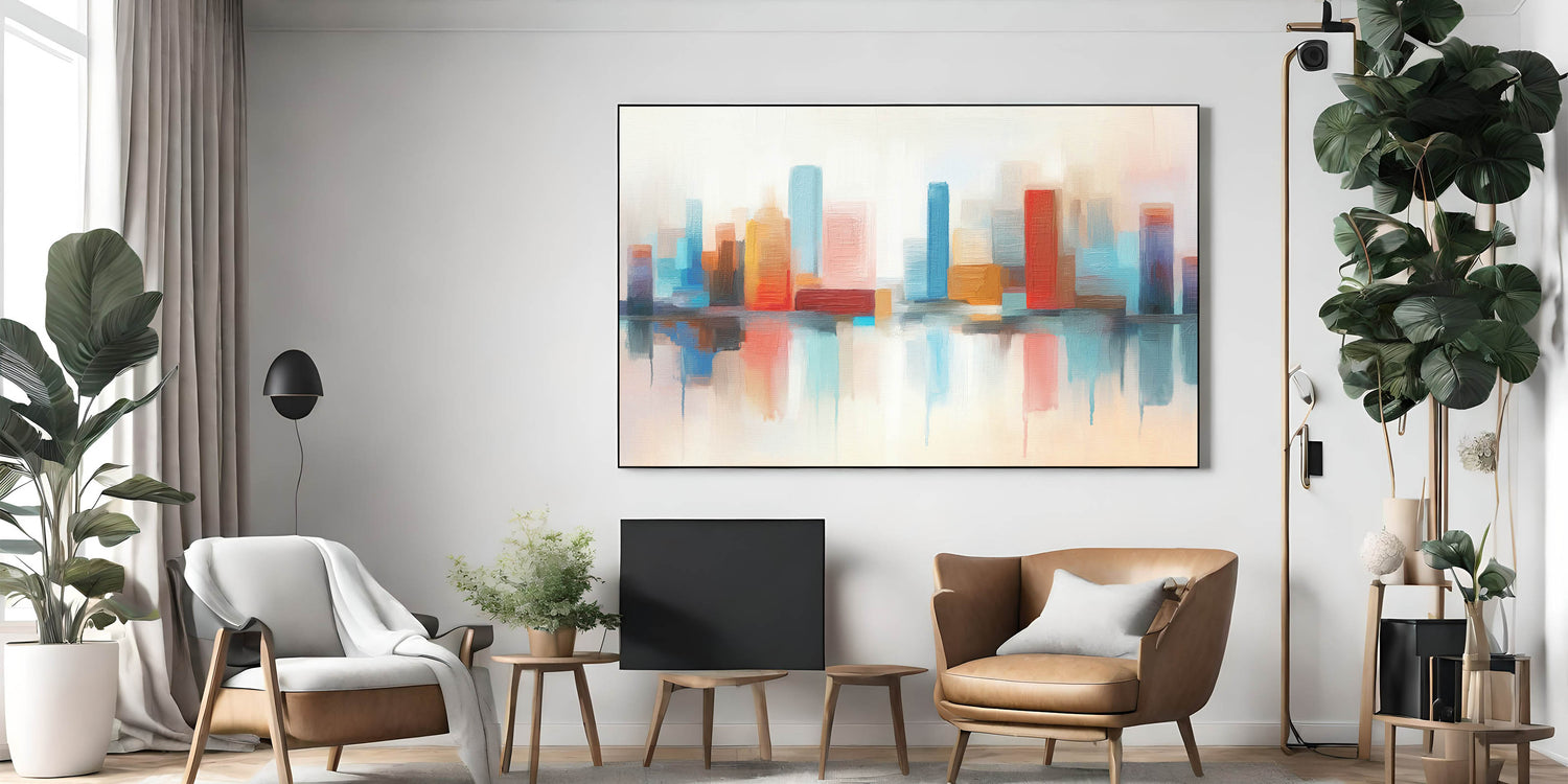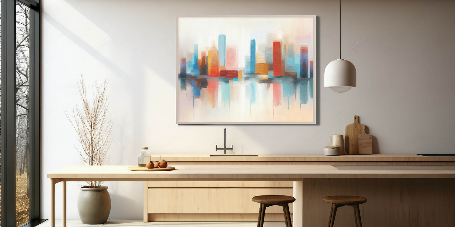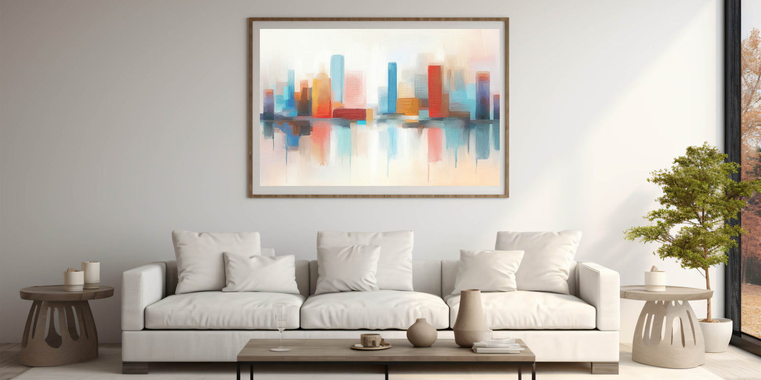 Add a vibrant touch to your living space with this colorful abstract cityscape art, featuring a blend of bold and soft tones that depict a modern skyline. This piece is perfect for those who appreciate contemporary and minimalist decor.