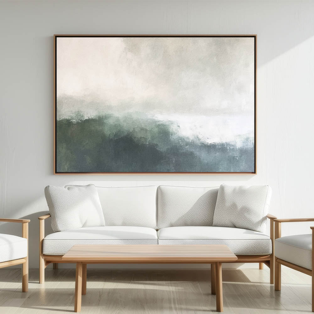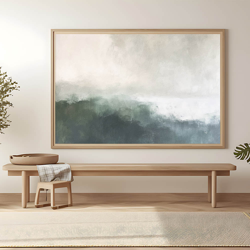 Invite a sense of calm and serenity into your space with this misty abstract landscape artwork. Featuring gentle gradients of green and gray, this piece captures the ethereal beauty of a foggy horizon, perfect for creating a peaceful atmosphere in any room. Ideal for those who appreciate minimalist design and natural tones, this artwork complements a variety of interior styles.
