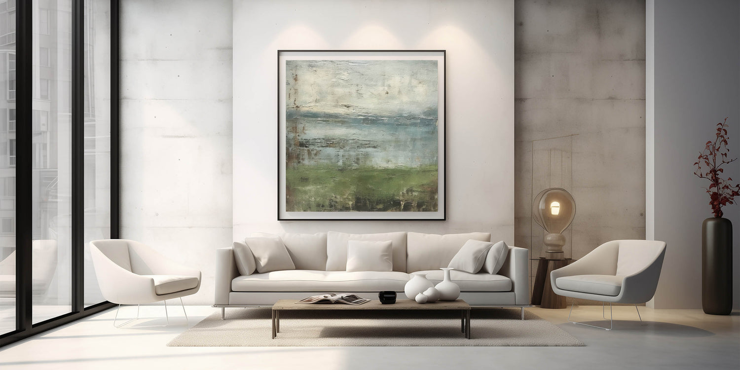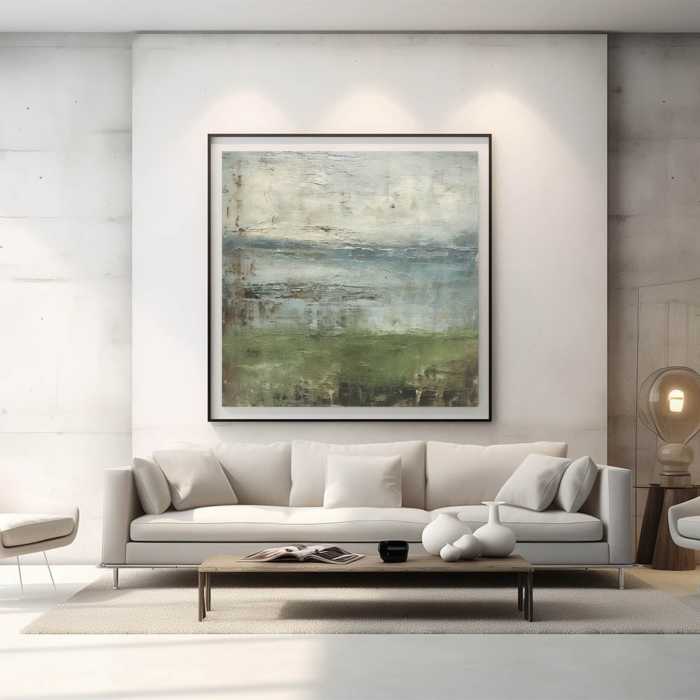 Introduce a sense of nature’s tranquility to your space with this abstract landscape wall art. Featuring rustic green and muted blue tones, this piece captures the essence of a misty lakeside view, with soft, textured layers that add depth and intrigue. The artwork’s earthy palette and subtle detailing make it a perfect choice for those looking to bring a calm, grounded atmosphere to their interiors.