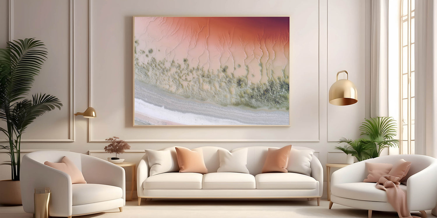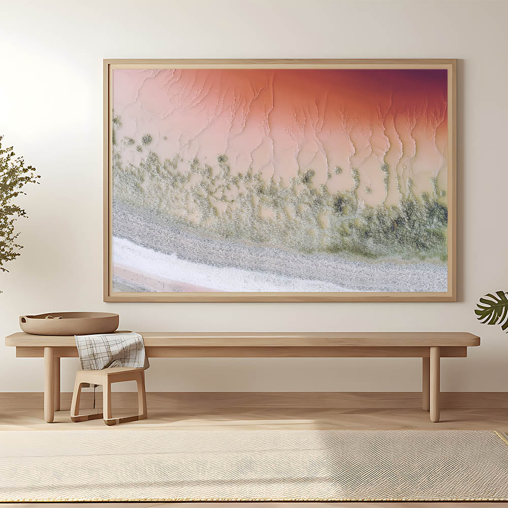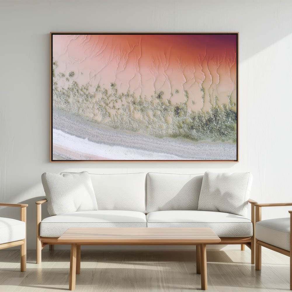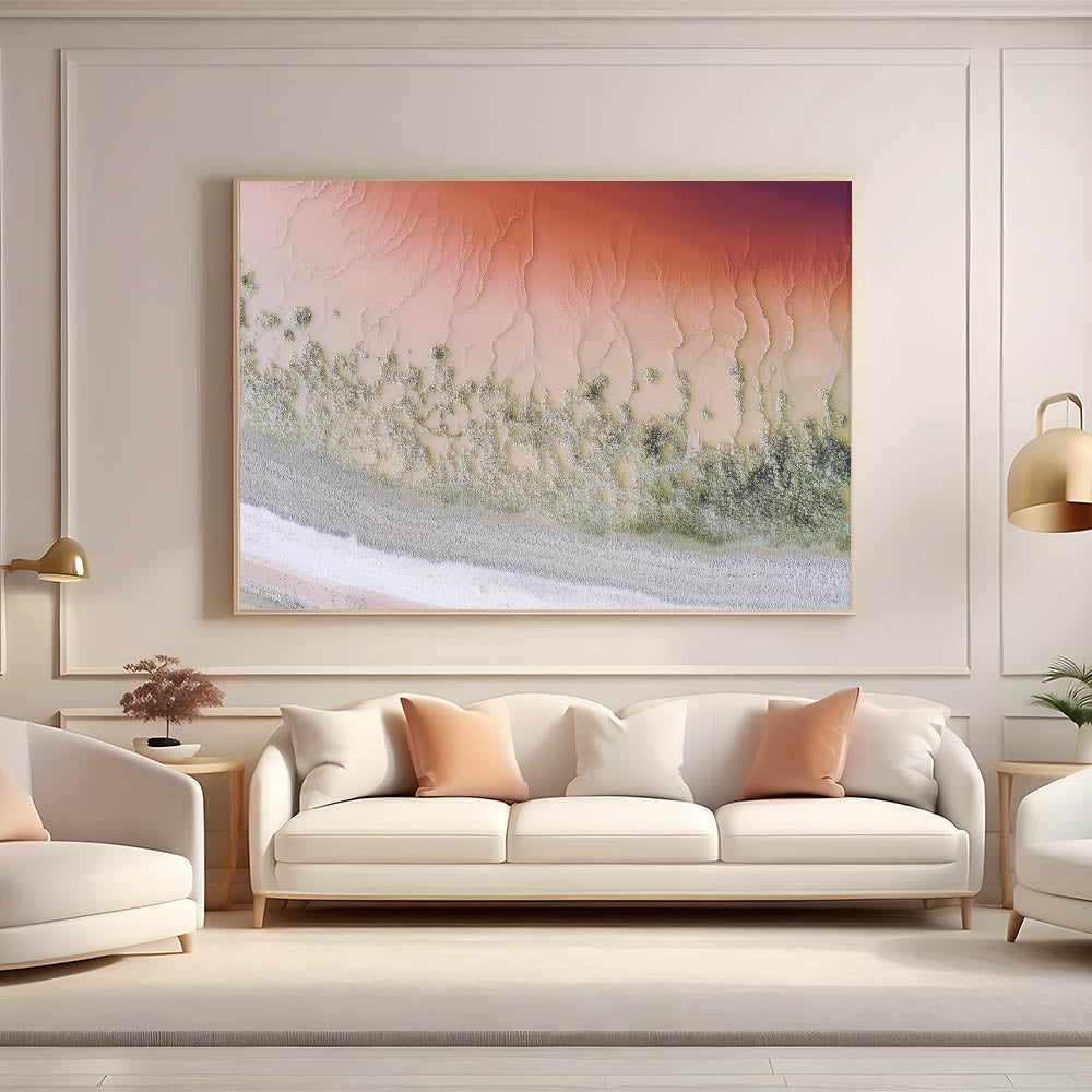 Bring a natural warmth to your home with this abstract landscape art, featuring a stunning blend of earthy tones in soft beige, warm peach, and bold red. The organic, flowing textures resemble patterns found in nature, creating a harmonious and inviting aesthetic. This piece is ideal for contemporary spaces, adding both visual interest and a soothing ambiance.