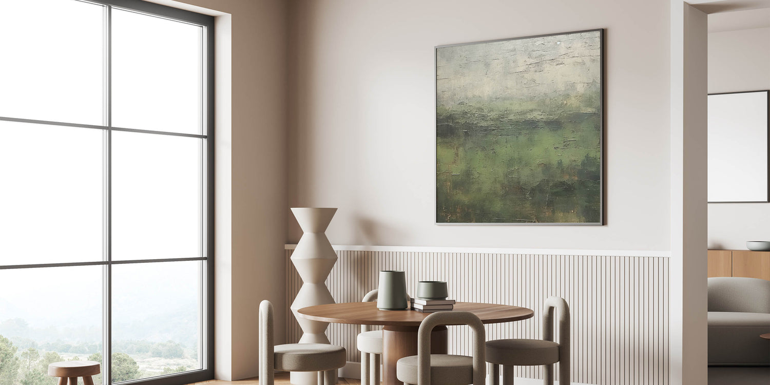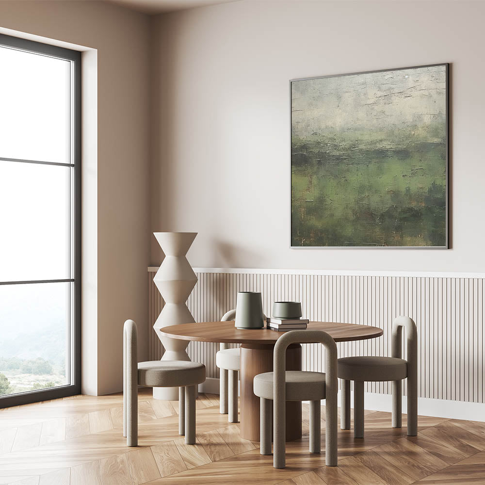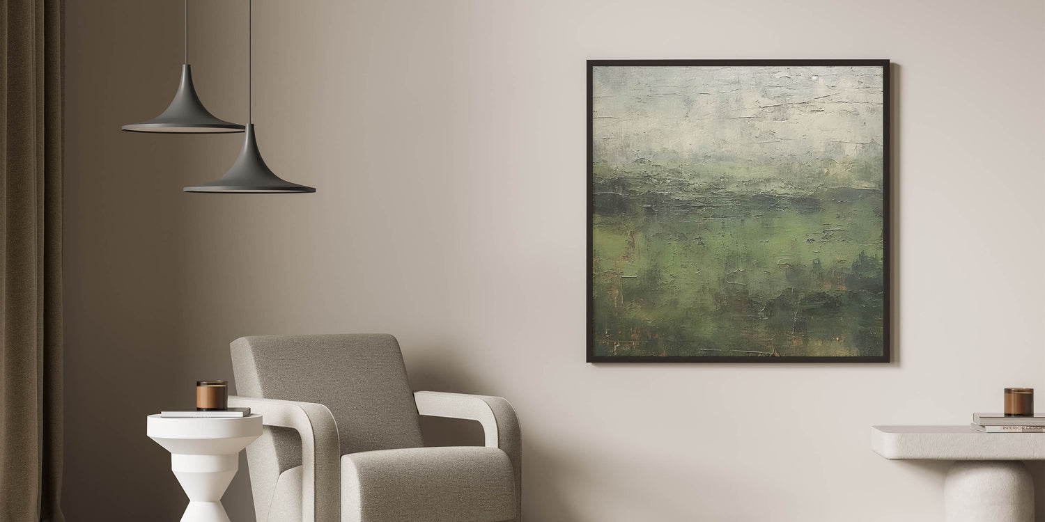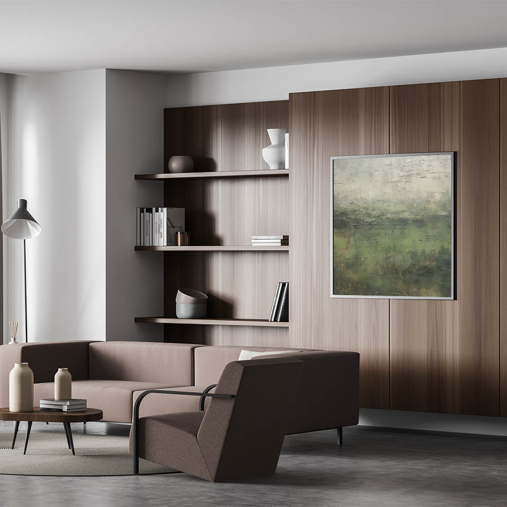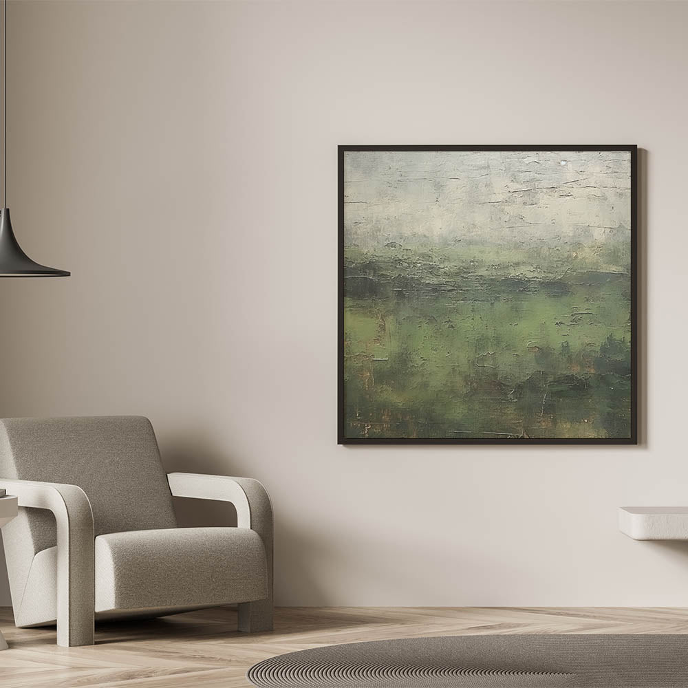 Immerse yourself in the rich, natural beauty of this abstract landscape artwork. With deep green tones and earthy textures, this piece captures the serene essence of a lush forest, creating a tranquil atmosphere reminiscent of misty mornings in nature. Perfect for adding a touch of calm and sophistication, this artwork complements various decor styles, from rustic to contemporary.