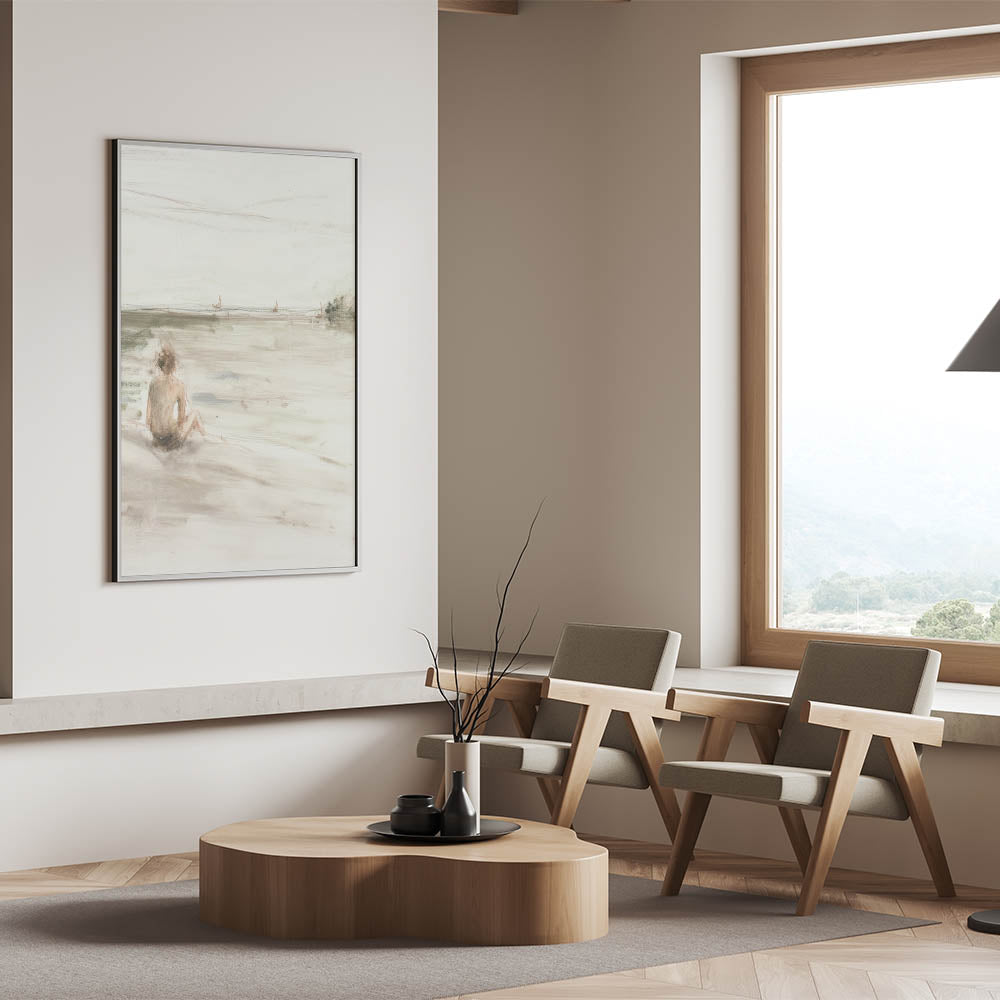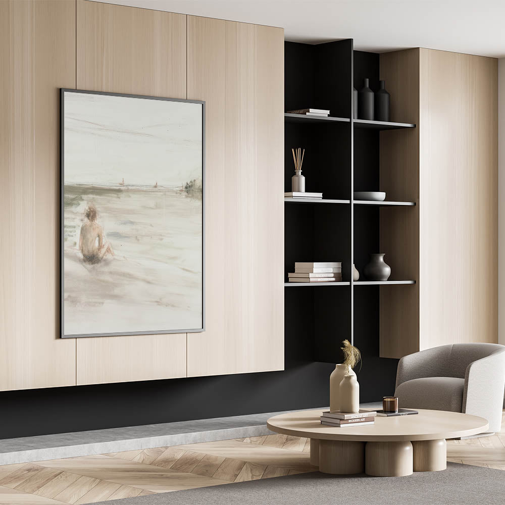Capture the quiet beauty of solitude with this contemporary figurative print. Featuring a lone figure seated by the shore, gazing at distant sailboats, this artwork evokes a sense of calm and introspection. The soft, muted tones and delicate brushwork create a minimalist yet emotional composition, perfect for enhancing tranquil spaces.