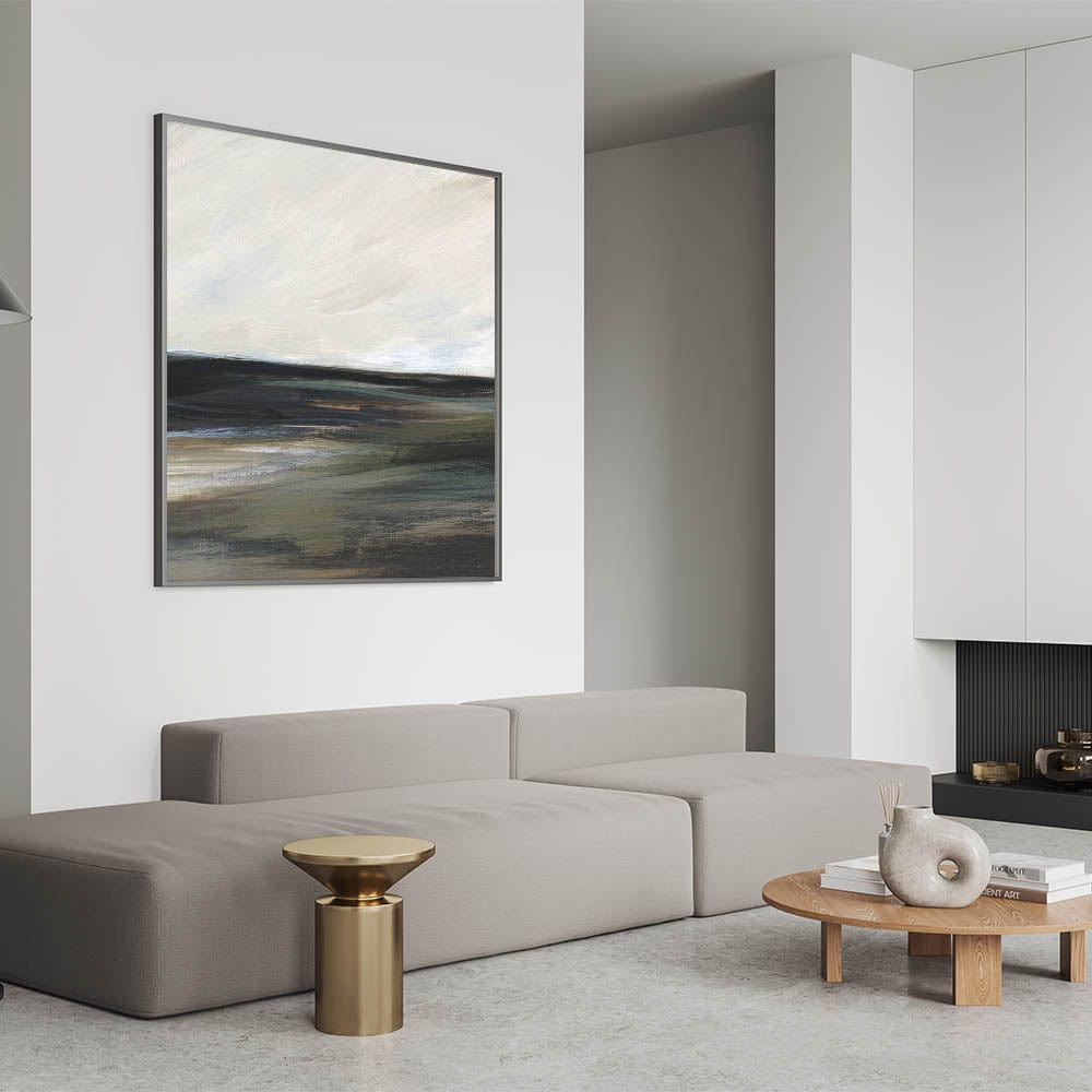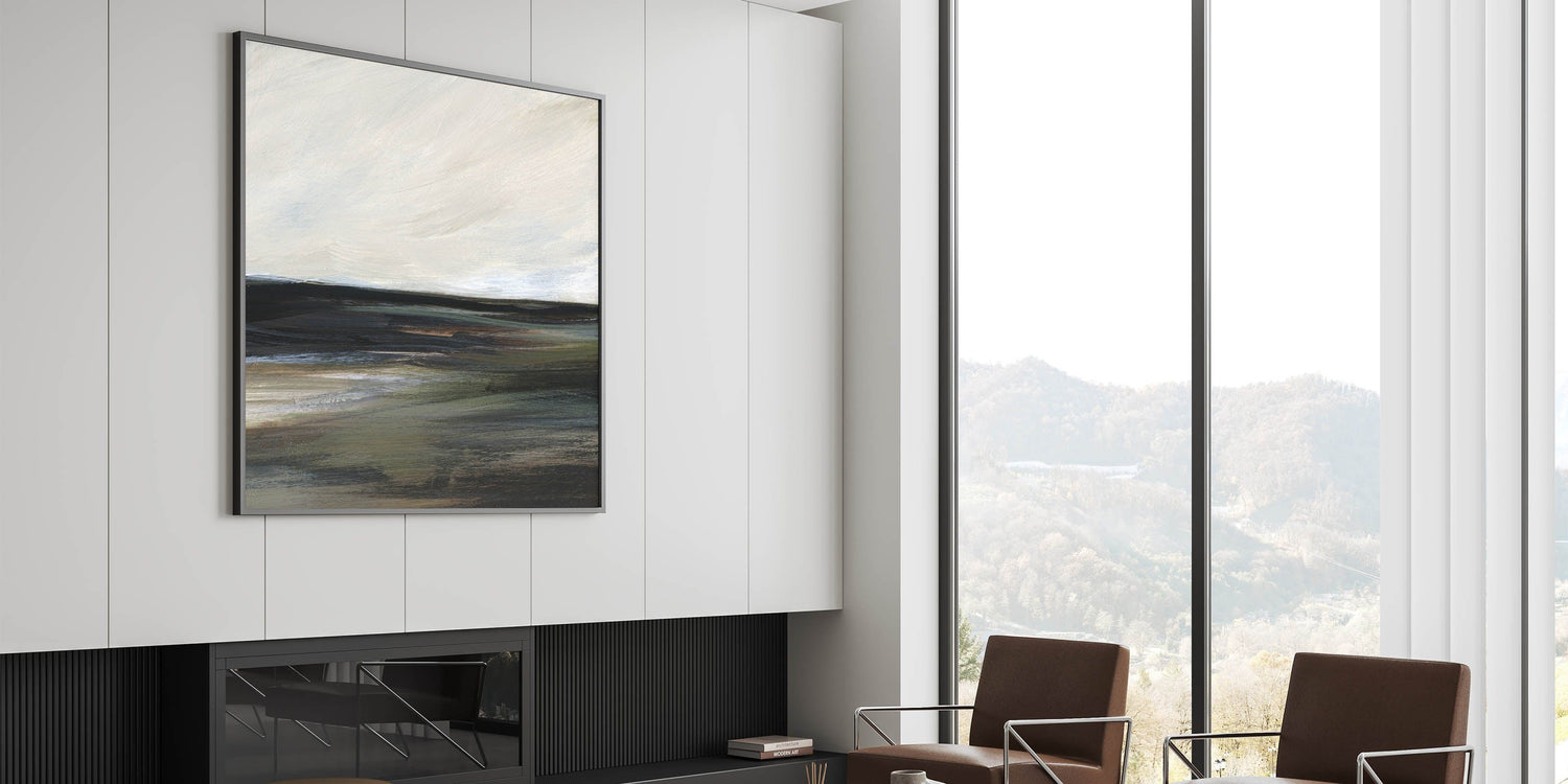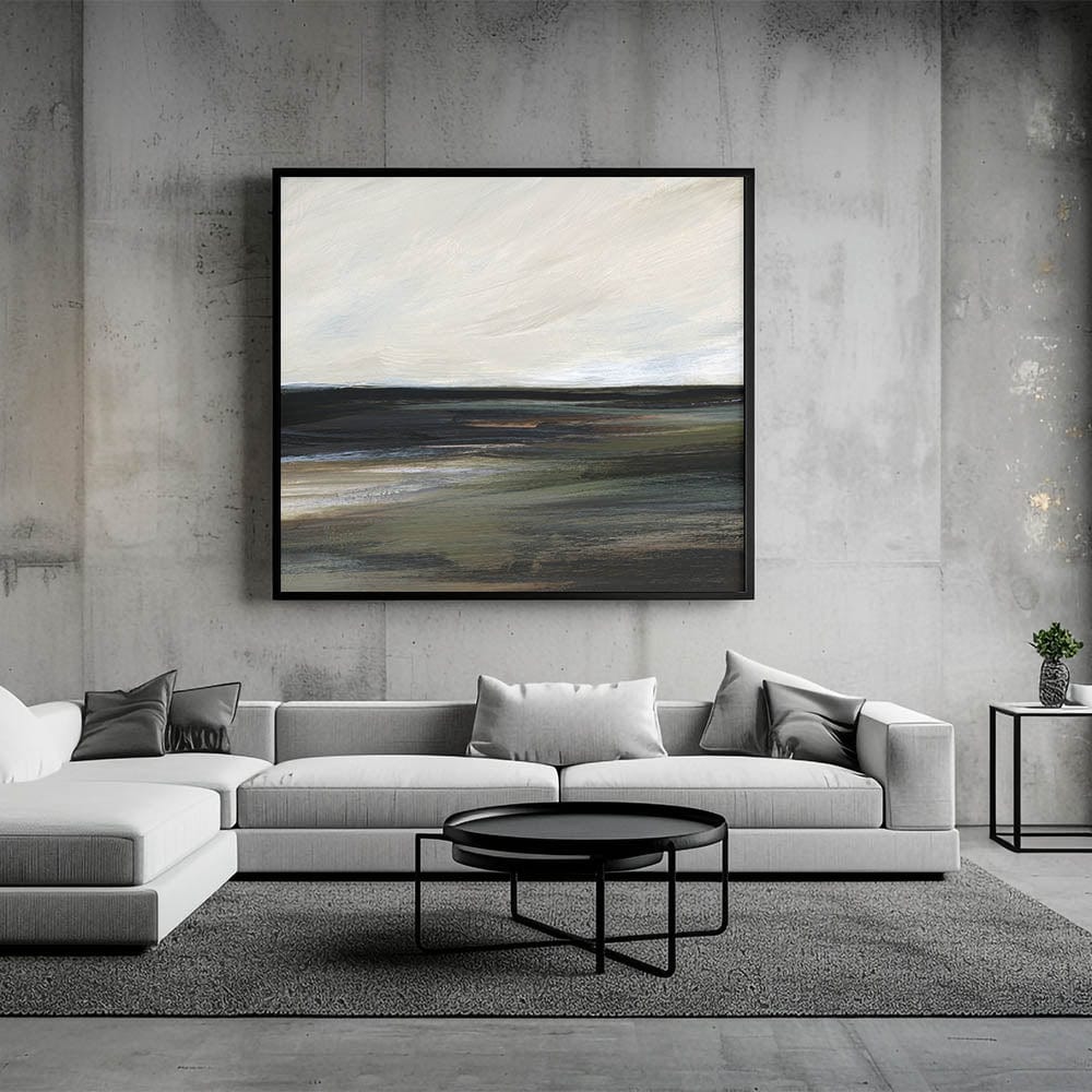 This tranquil piece from our Abstracts in Earthen Harmony collection captures the essence of a serene landscape in shades of black, green, gray, and white. The abstract brushstrokes evoke a calming atmosphere, making this artwork a perfect addition to any modern home seeking balance and elegance.
