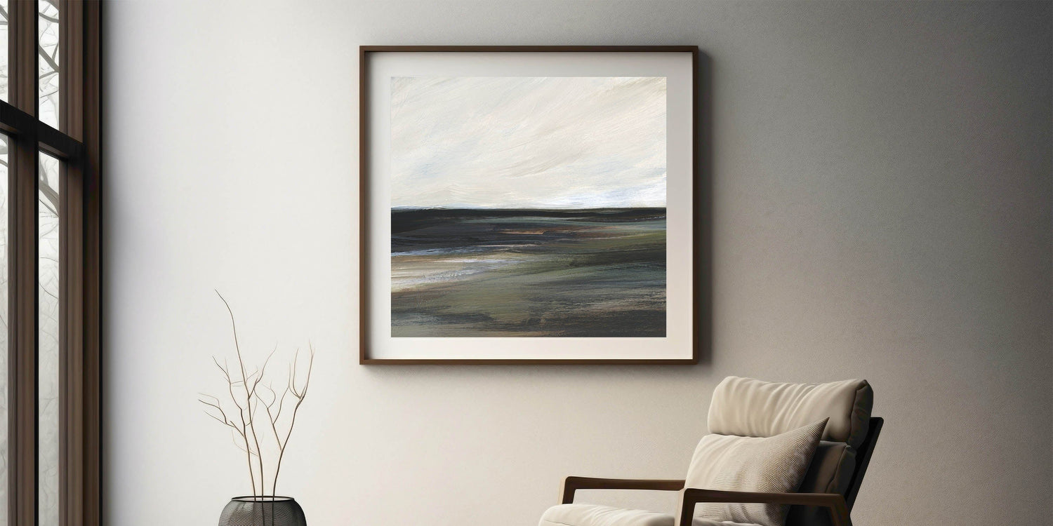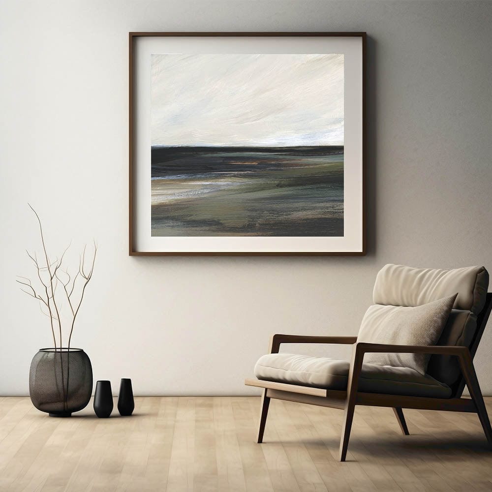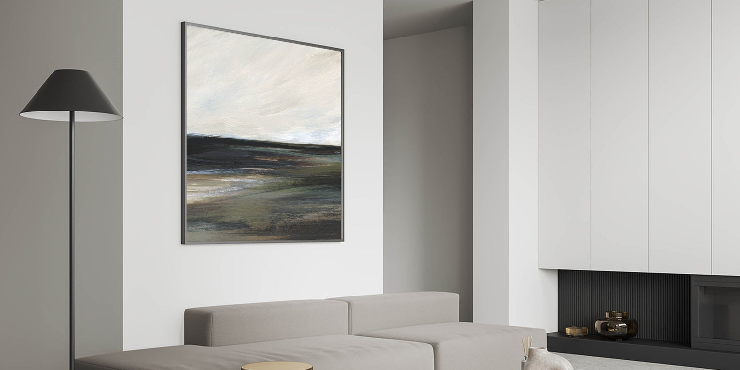 This tranquil piece from our Abstracts in Earthen Harmony collection captures the essence of a serene landscape in shades of black, green, gray, and white. The abstract brushstrokes evoke a calming atmosphere, making this artwork a perfect addition to any modern home seeking balance and elegance.