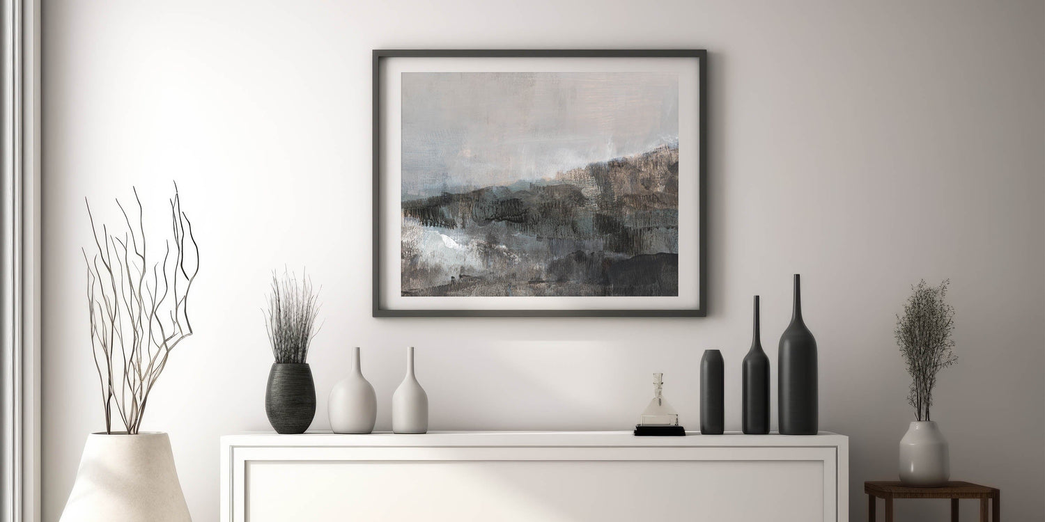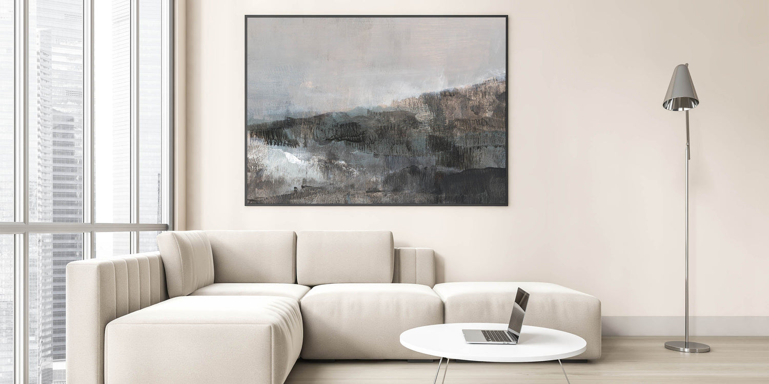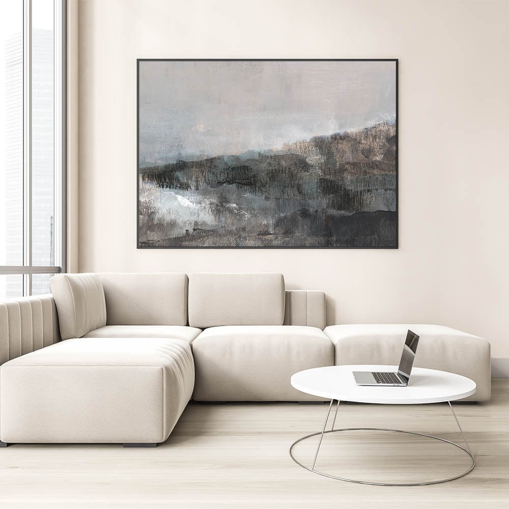 This calming piece from our Abstracts in Earthen Harmony collection features a tranquil, abstract landscape in shades of gray, black, and white. The textured layers and soft gradients evoke a sense of serenity, making it a perfect choice for modern, minimalist spaces.