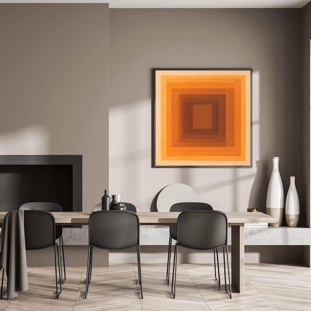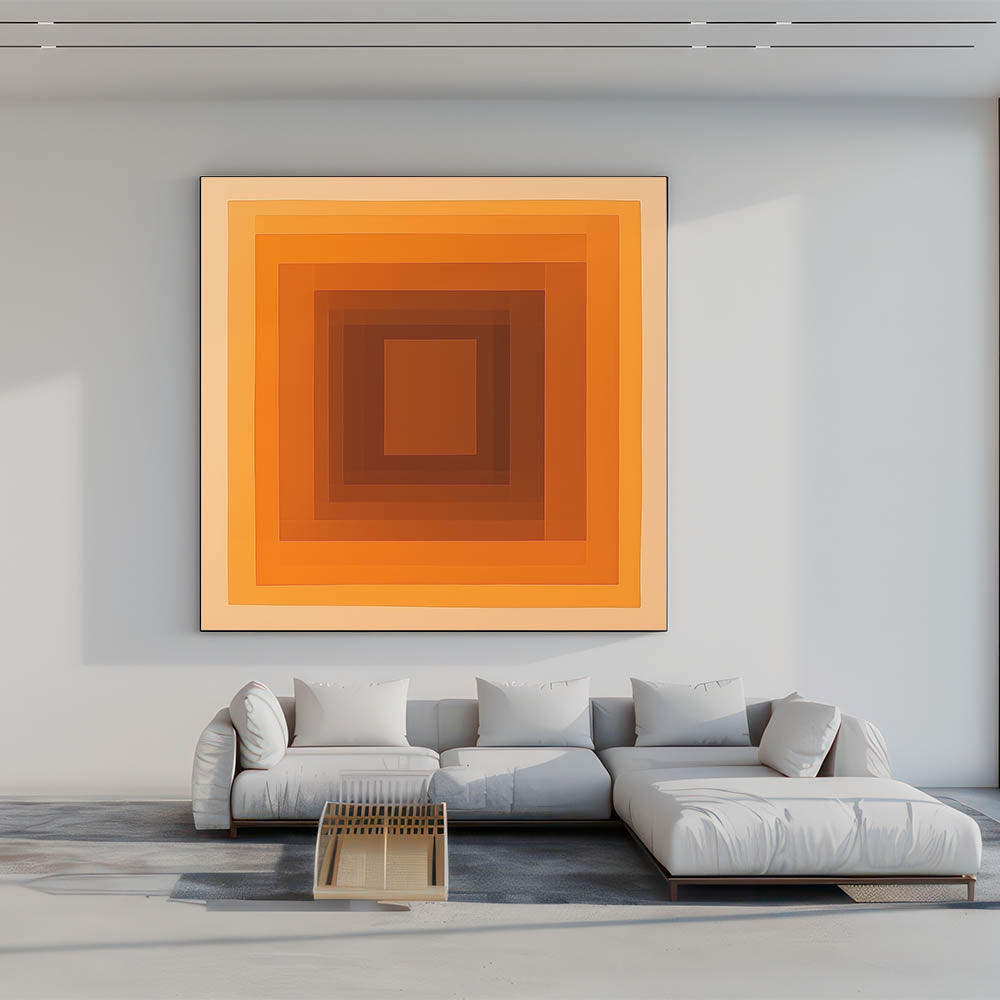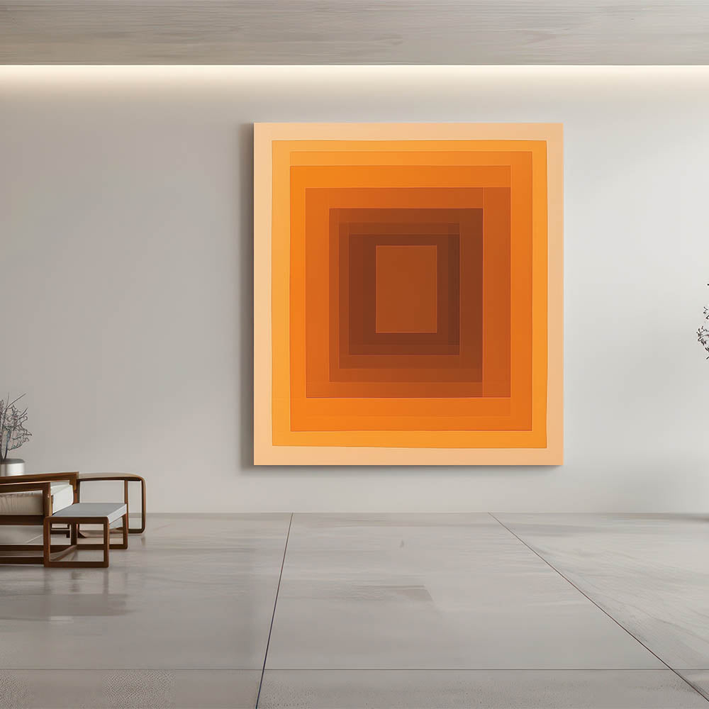 Energize your space with this geometric abstract wall decor featuring vivid concentric squares in layered orange and brown hues. This minimalist abstract wall art commands attention through precision and repetition, adding a modern, bold warmth to any room.