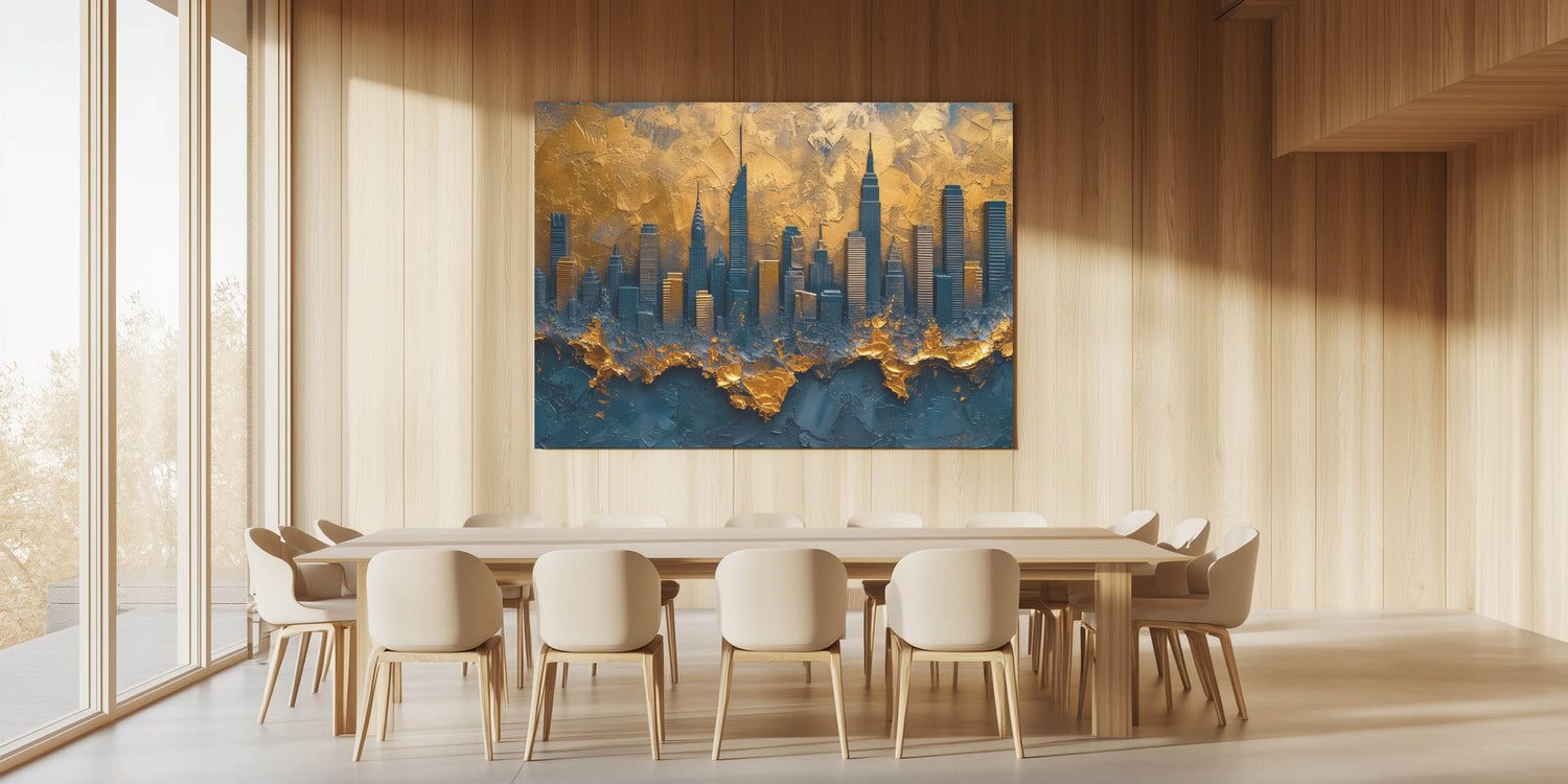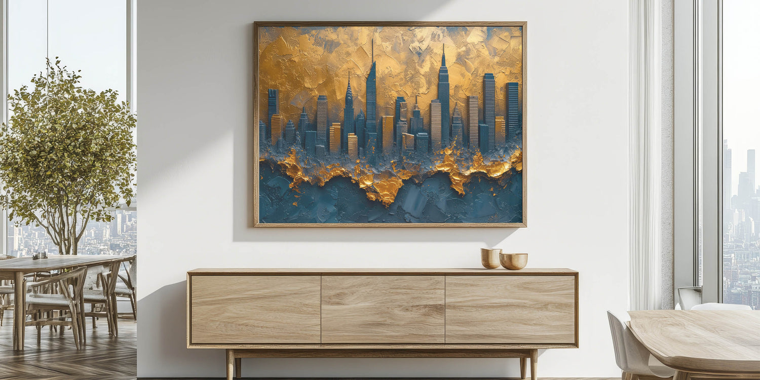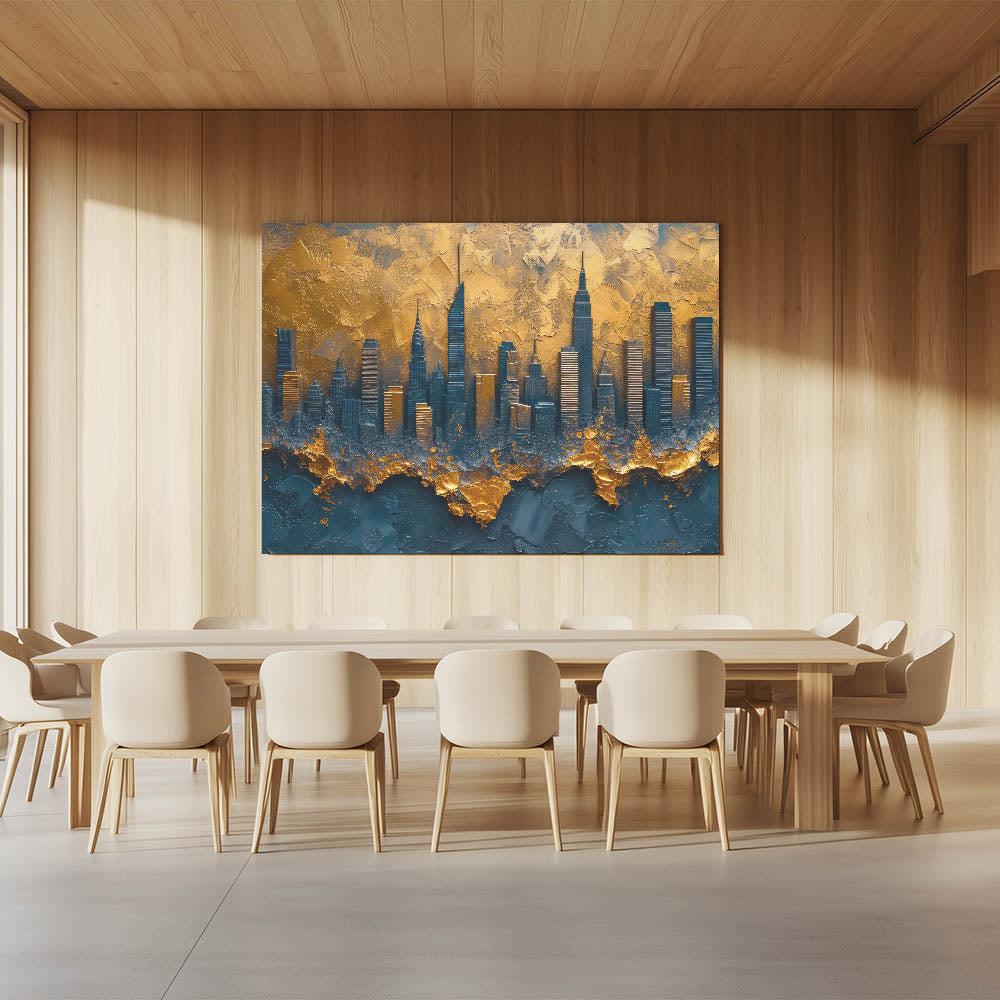 Elevate your space with this dramatic abstract cityscape art, featuring a modern skyline in rich gold and deep blue hues. This unique piece captures the essence of urban elegance with textured layers that add depth and sophistication. The luxurious blend of colors and bold design make it a perfect statement piece for contemporary, industrial, or modern decor.