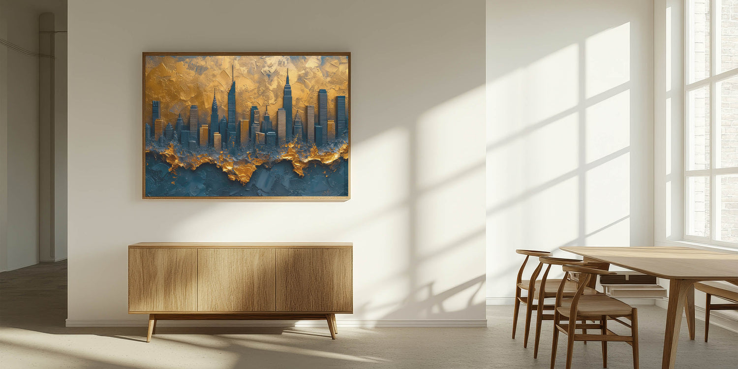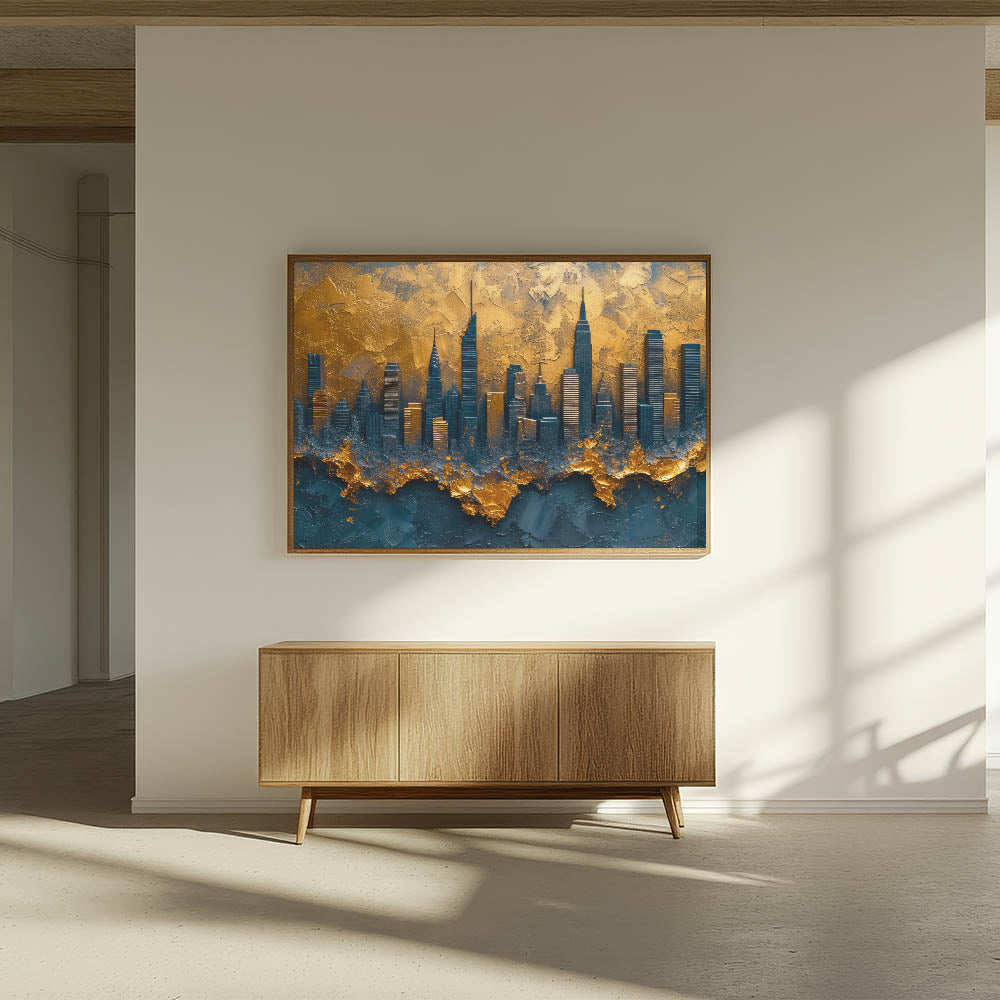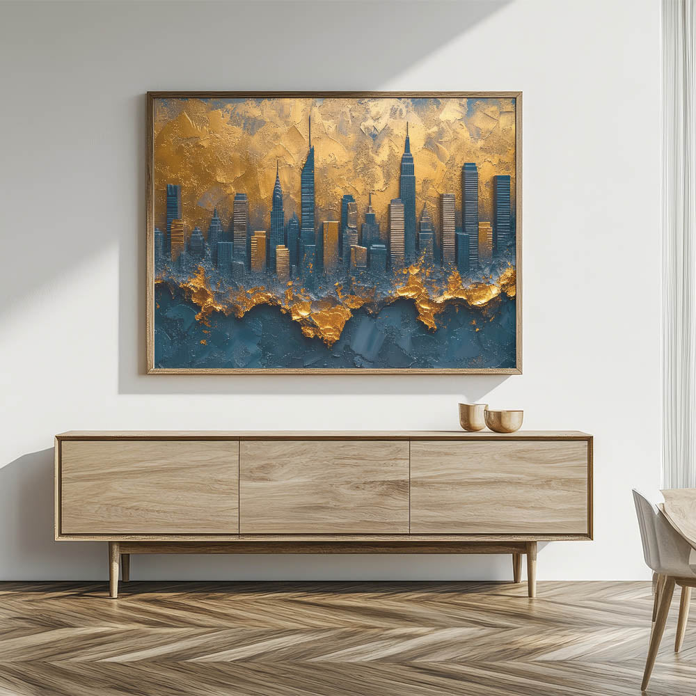Elevate your space with this dramatic abstract cityscape art, featuring a modern skyline in rich gold and deep blue hues. This unique piece captures the essence of urban elegance with textured layers that add depth and sophistication. The luxurious blend of colors and bold design make it a perfect statement piece for contemporary, industrial, or modern decor.