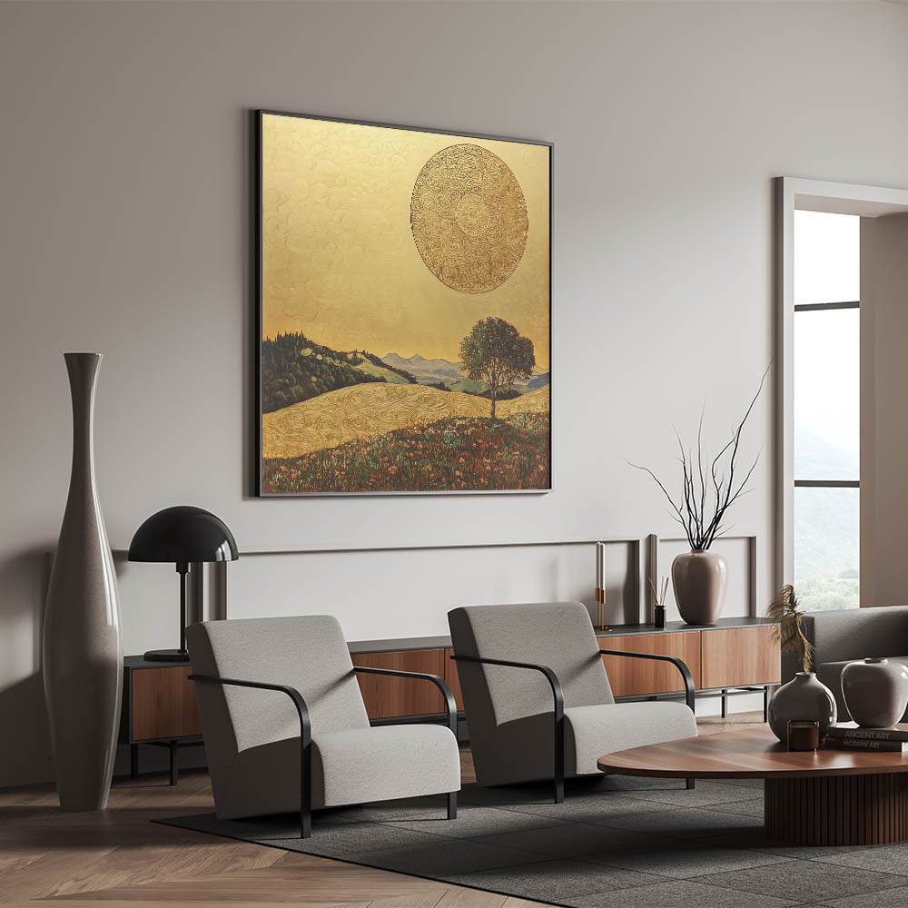 Golden Abstract Floral Wall Art – Celestial Landscape Canvas Print