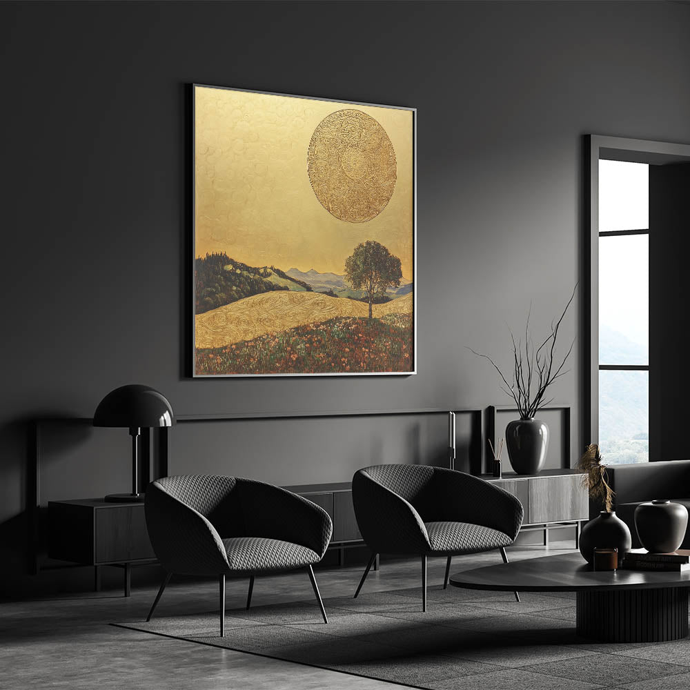 Immerse yourself in the beauty of this abstract floral artwork for home decor, featuring a luminous golden sky, intricate celestial patterns, and a tranquil landscape. This modern flower abstract painting combines elements of nature and cosmic wonder, creating a harmonious contemporary botanical canvas print that radiates warmth and serenity.